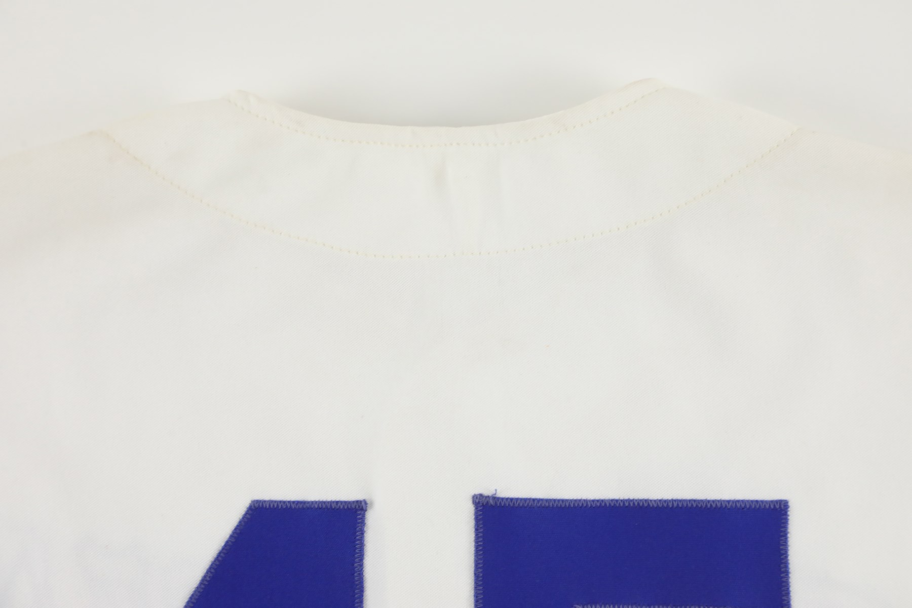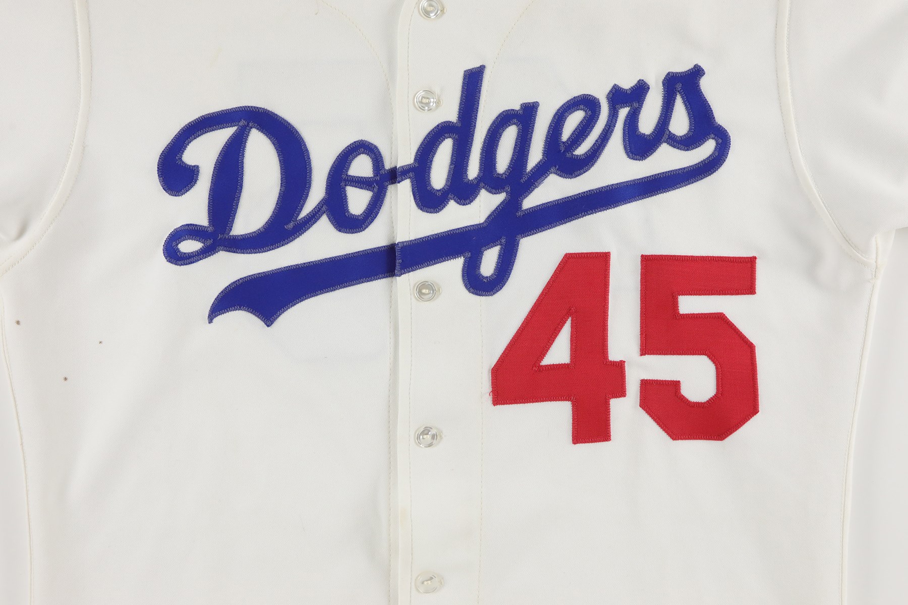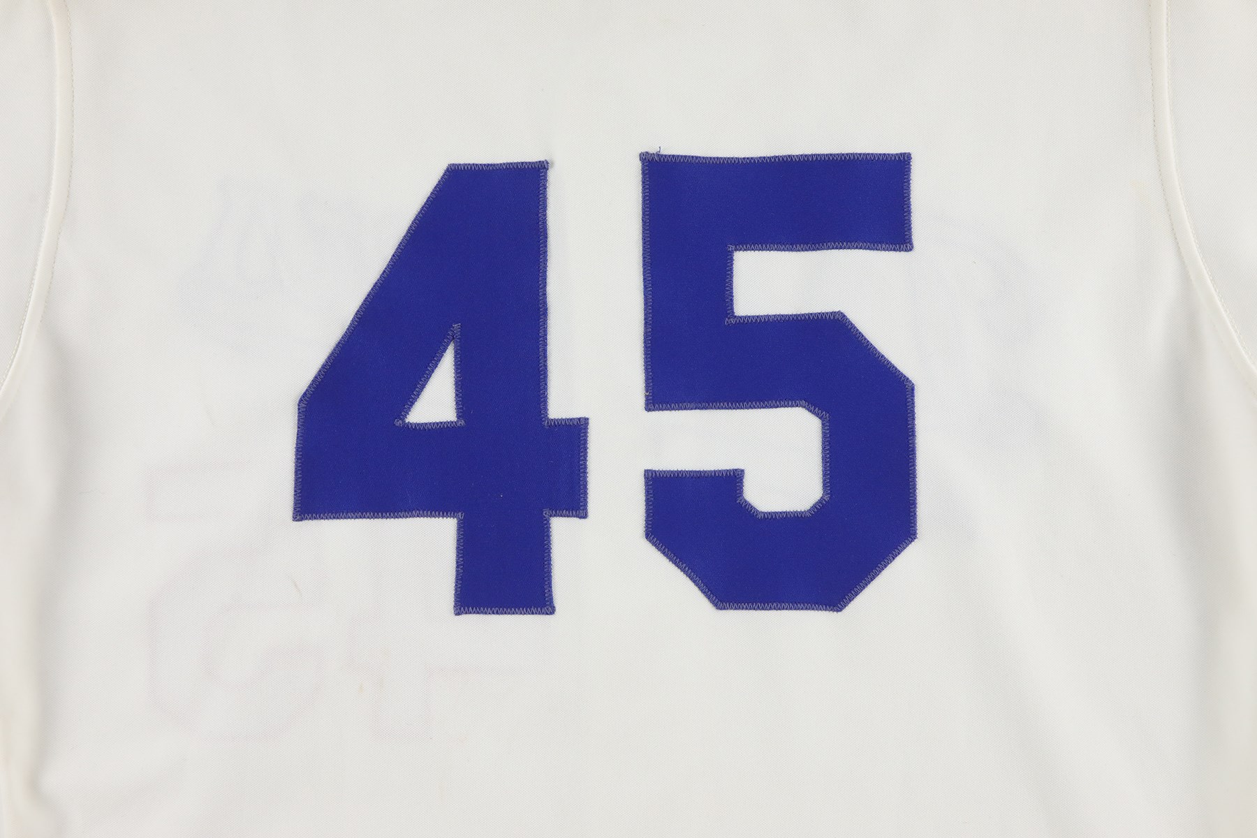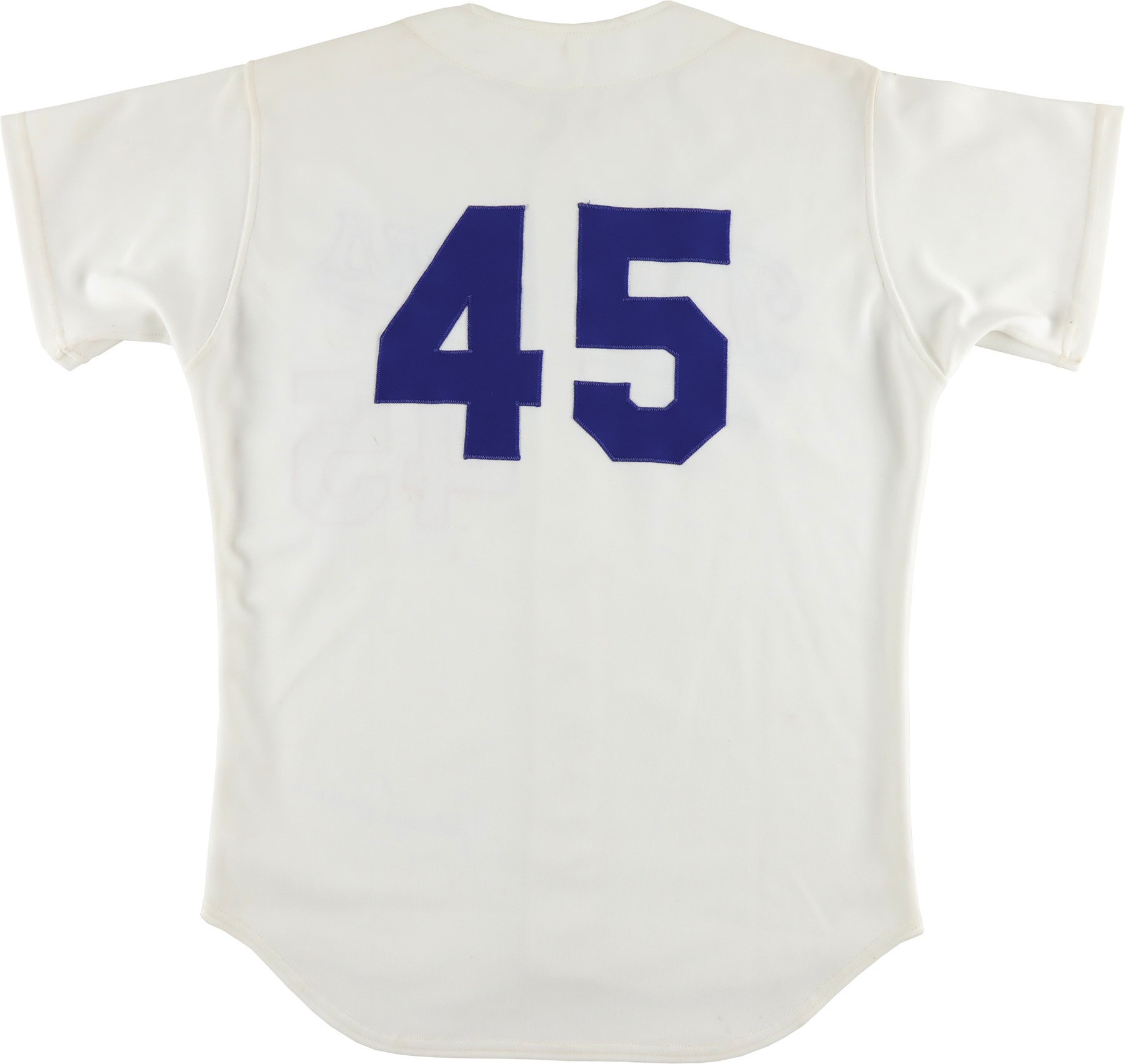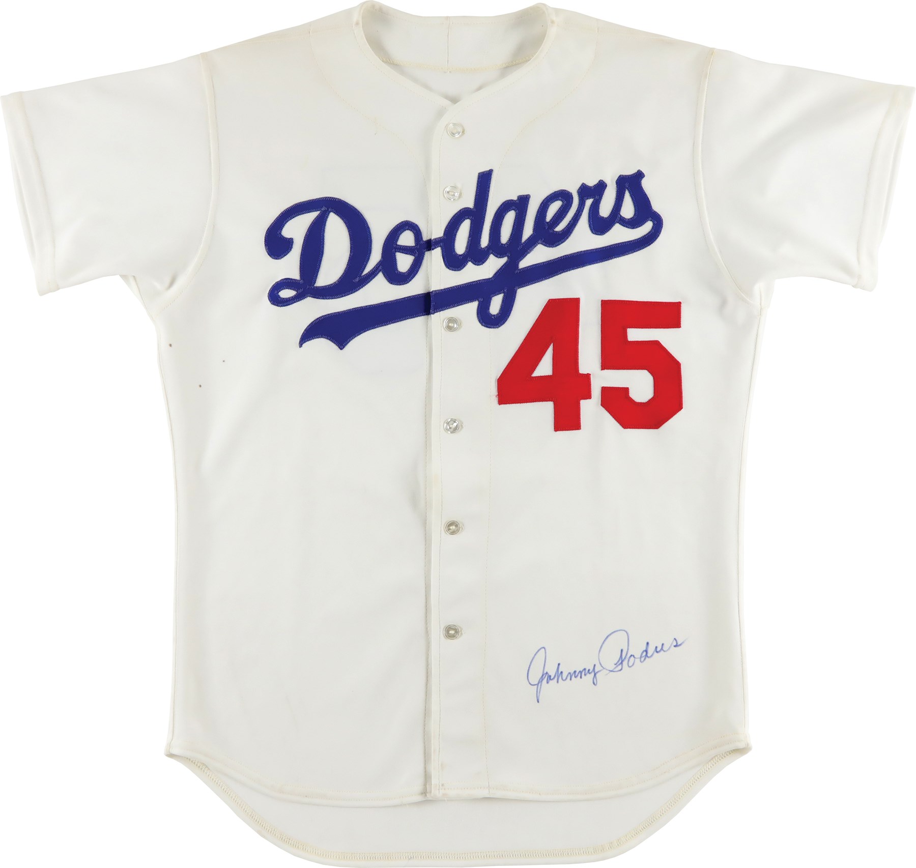 Los Angeles Dodgers home jersey believed to have been issued to former Brooklyn hurler Johnny Podres for use during an Old Timers Day event. The white knit jersey is lettered "Dodgers" across the front and features the number "45" on the left breast and reverse. All front numerals are applied in red tackle twill, while all letters and reverse numerals are applied in blue tackle twill. The manufacturer's tag, which was originally located in the collar, has been removed (the stitch outline remains). Podres has signed the jersey in blue Sharpie (grading 8/10) on the left front tail. The jersey displays light wear, plus a few tiny stains on the front that appear to relate to its method of storage rather than use.