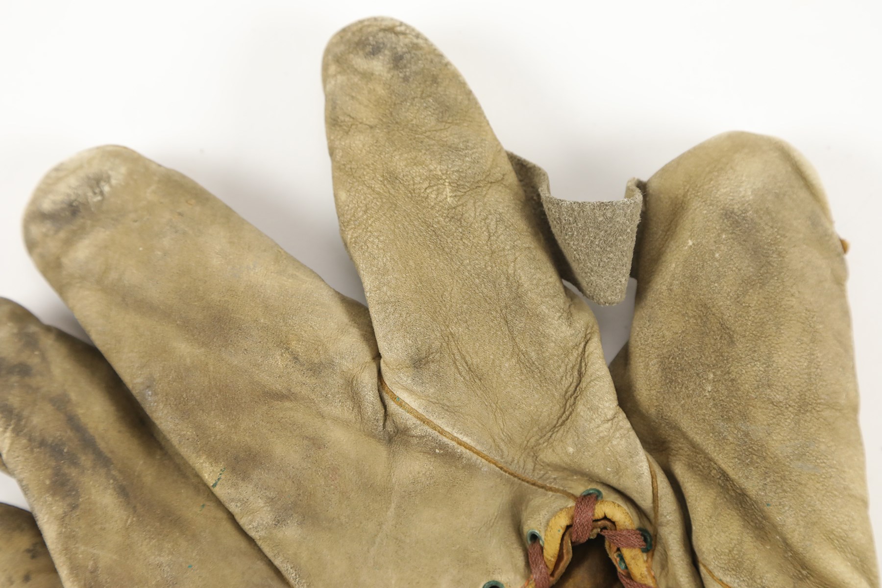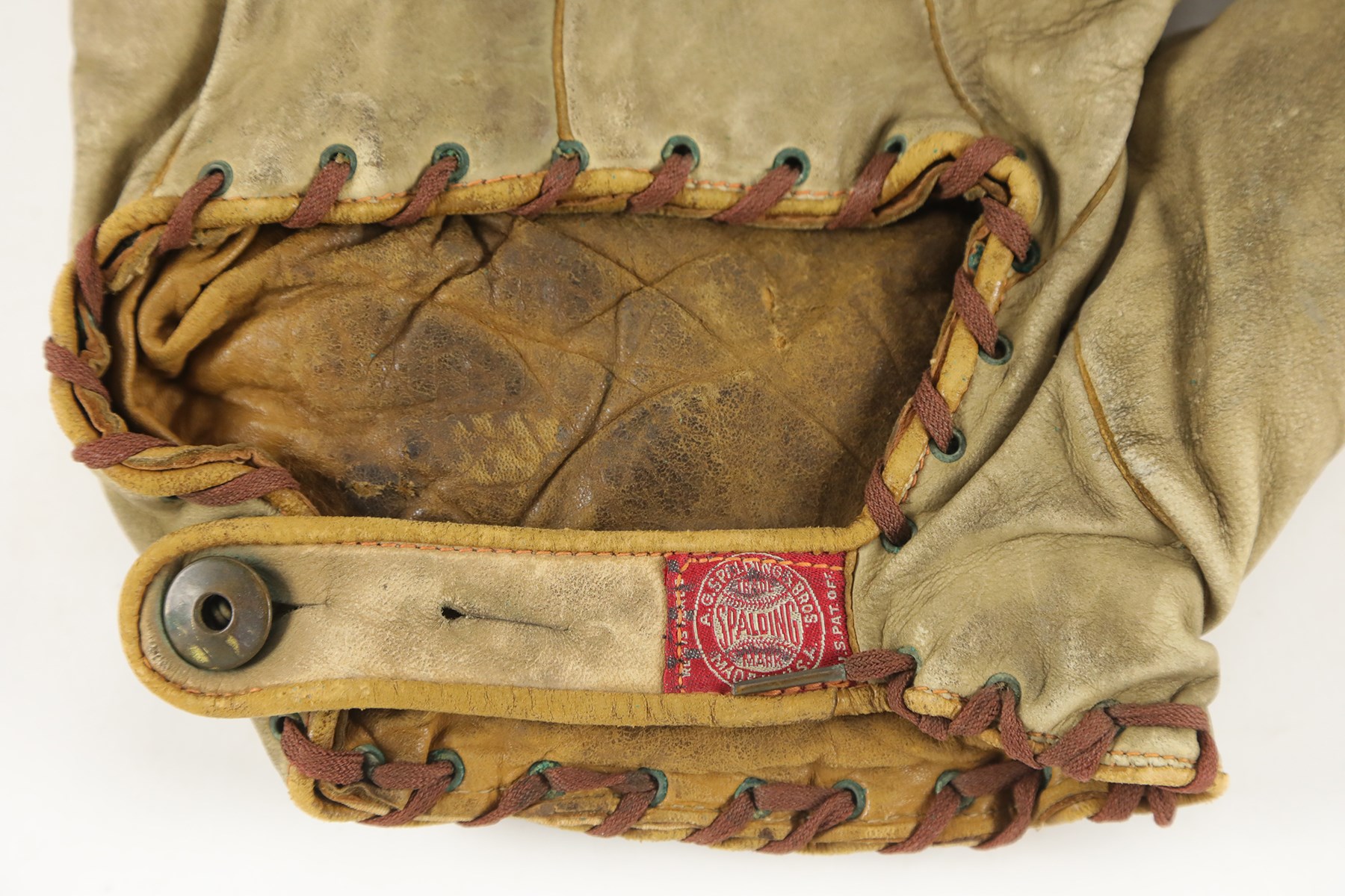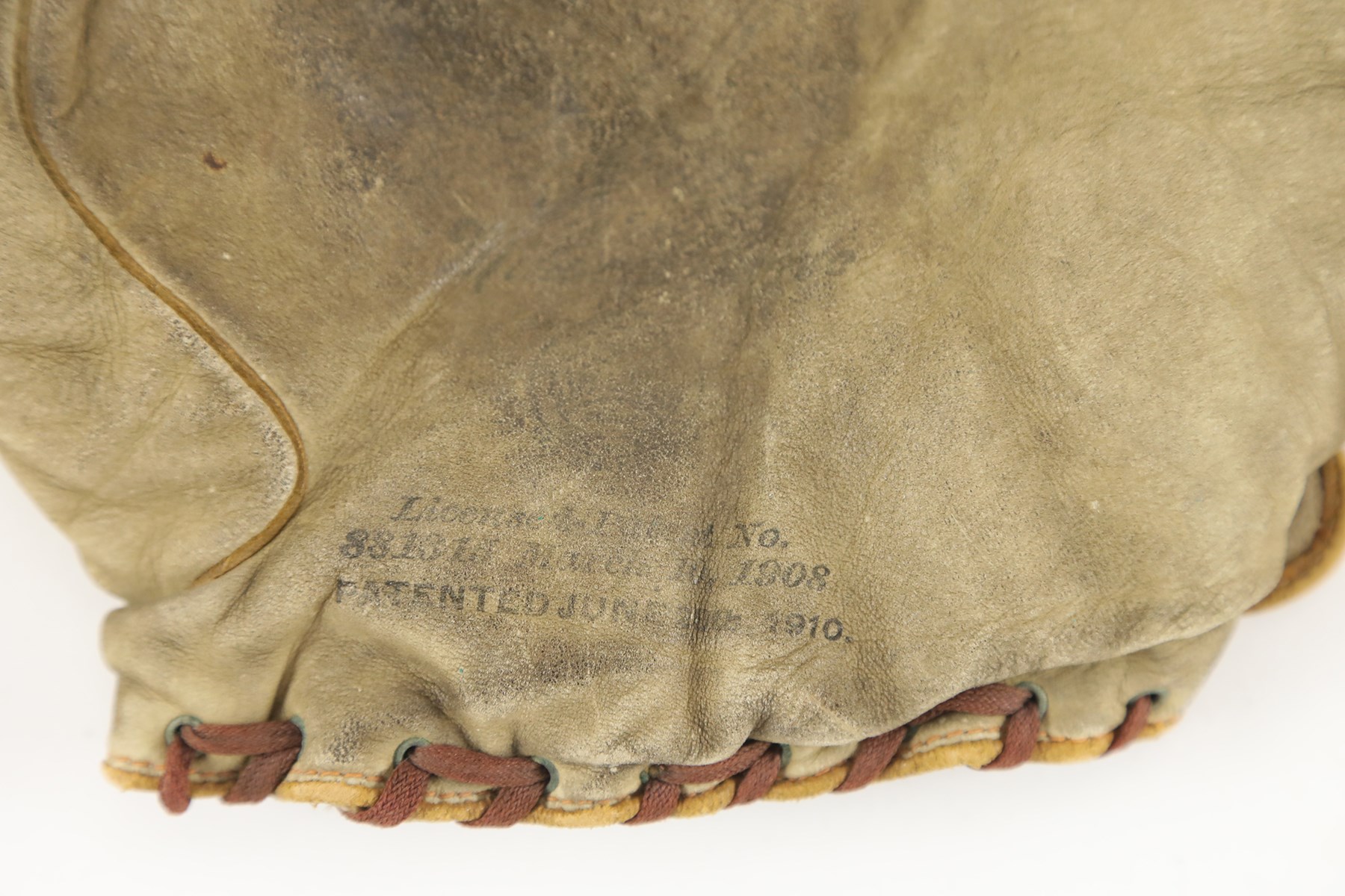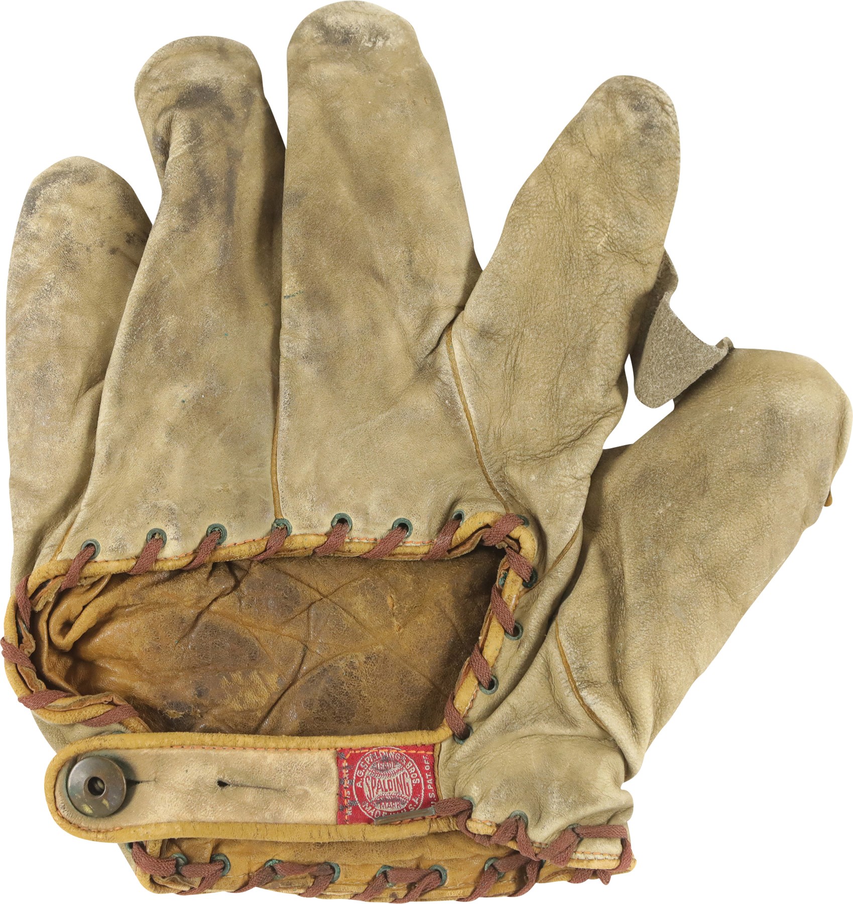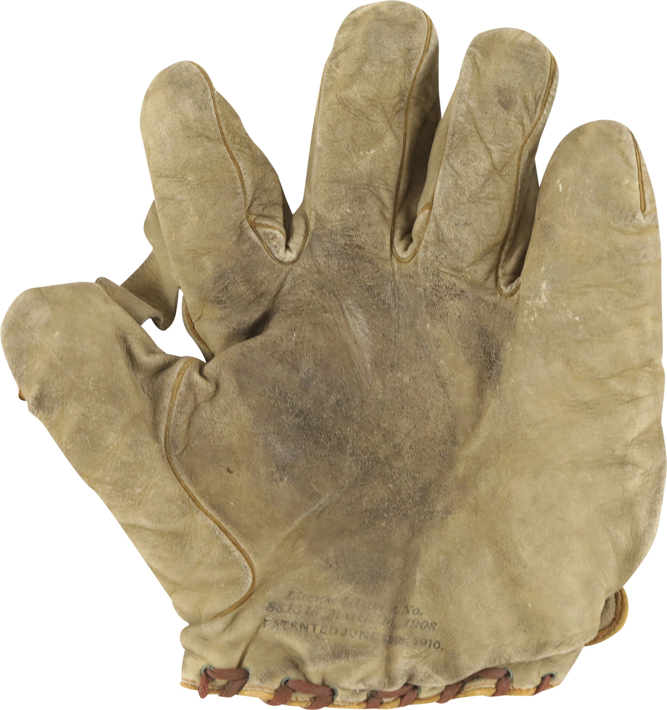 Vintage Spalding right-handed fielder's glove dating from the early 1900s. The well-worn retail glove features a single piece of leather between the thumb and index finger, with no other webbing or attachments for the remaining fingers. A Spalding label appears on the rear wrist strap, while a patent date of "1910" remains visible at the base of the palm. The leather remains supple, with no significant tears, but displays heavy wear throughout, including soiling. All the original leather lacing has been replaced with vintage shoelace material.