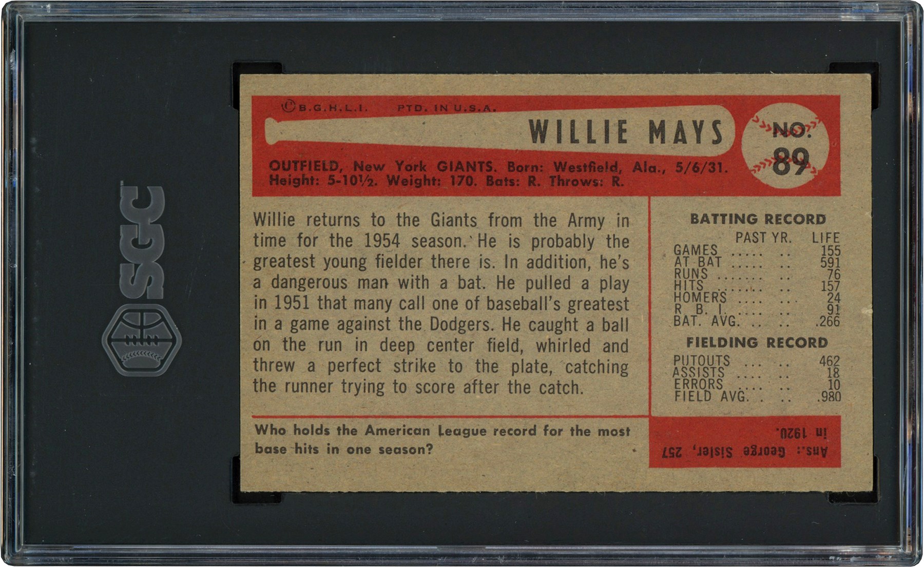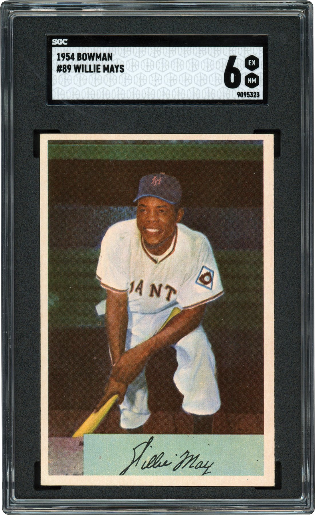 1954 Bowman Baseball 89 Willie Mays card. The card has been graded and encapsulated by SGC EX-MT 6. It has a clear image of Mays leaning against his bat in a darkened dugout. The borders remain white while the edges appear smooth. Centering is off top to bottom and left to right. The bottom left corner exhibits light wear. The reverse has a very slight area of paper lightening on the middle bottom border but is otherwise clean.