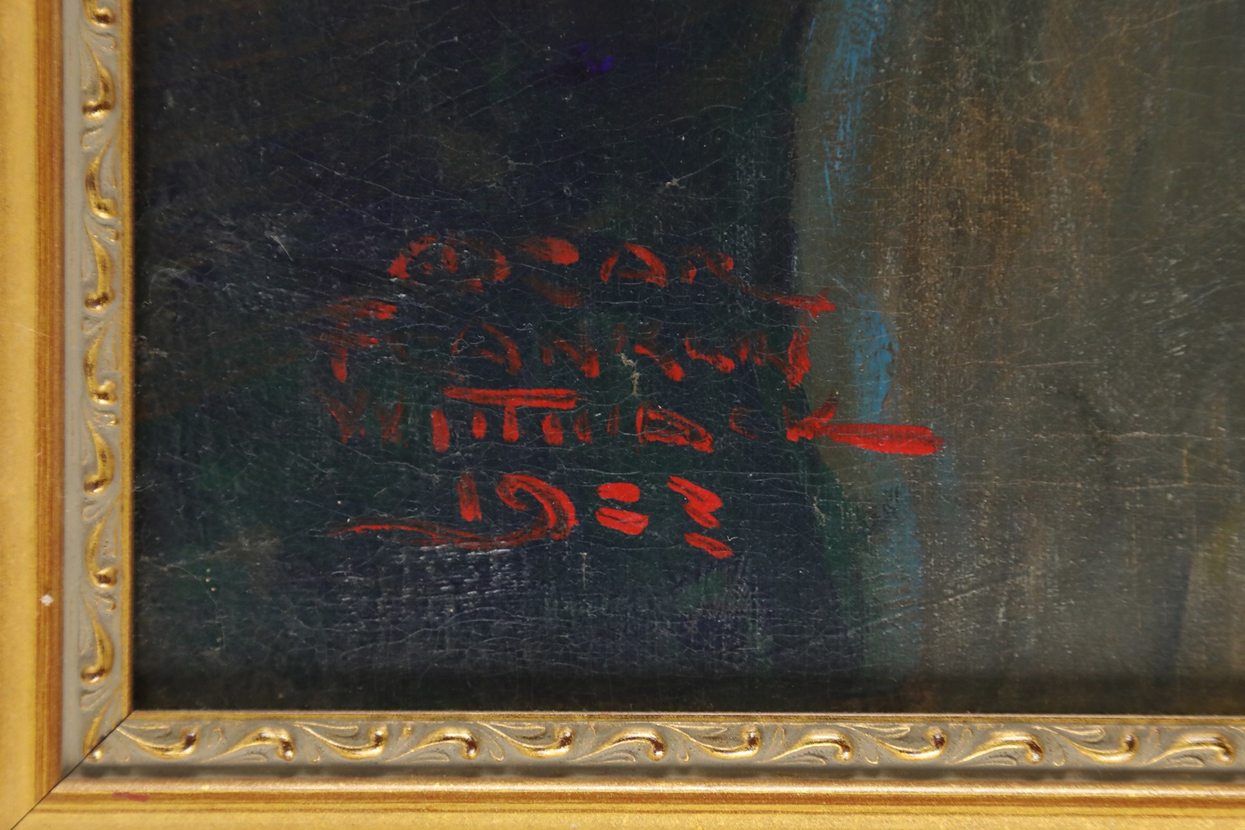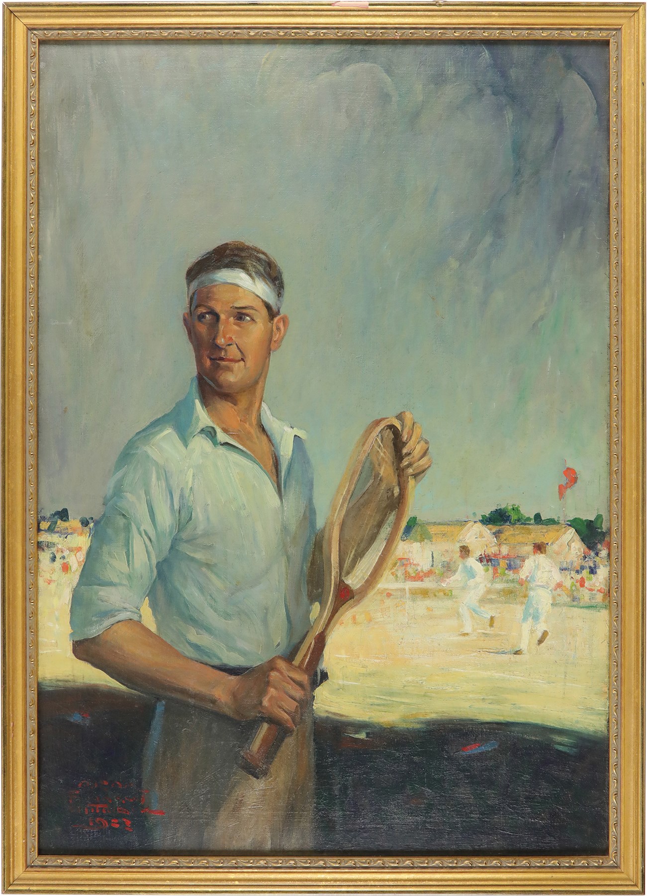 Original oil on canvas by noted American illustrator Edgar Franklin Wittmack (1894-1956). The painting depicts a young man holding a tennis racket, while a tennis match in progress can be seen in the background. Signed and dated by the artist in the lower left corner: "Edgar Franklin Wittmack/1922." Wittmack was a prolific illustration artist during the 1920s and 1930s, with his works appearing in numerous well-known publications, including the Saturday Evening Post (for which he painted many covers), Popular Science, and Outdoor Life, as well as various pulps. While we do not know for what purpose this artwork was created, it might have been a cover piece for a tennis magazine, or an interior illustration for a piece of tennis fiction. Regardless, it is one of the earliest original tennis paintings we have ever seen and the fact that it was created by an artist of Wittmack's stature makes it all the more significant. The artwork (21x20.5") remains in Excellent to Mint condition. Framed to total dimensions of 23x31.5" Please Note: The size and/or weight of this lot will necessitate an increased shipping charge.