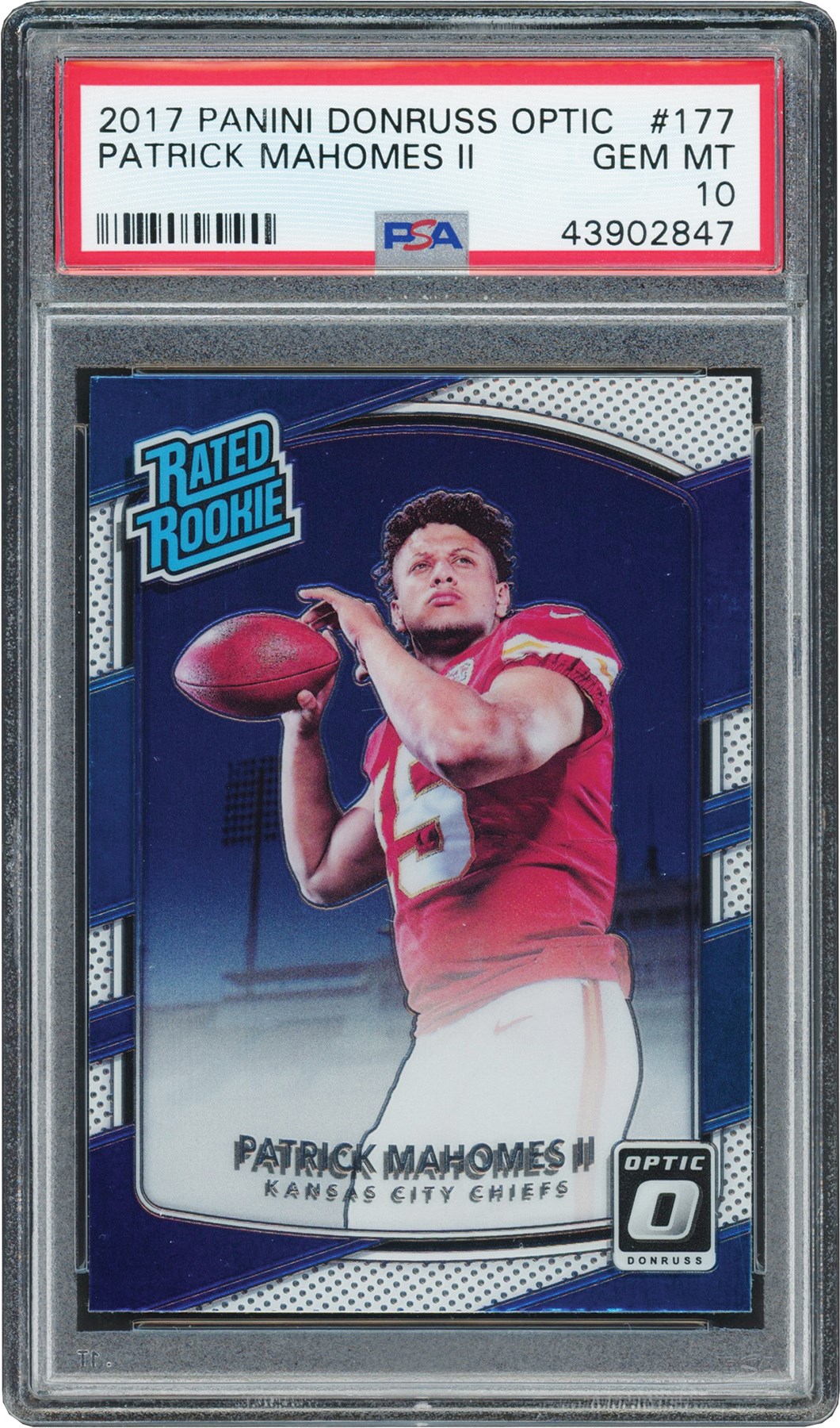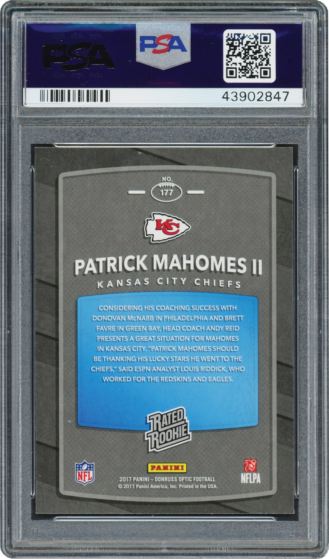 2017 Panini Donruss Optic 177 Patrick Mahomes (R) card. The card has been graded and encapsulated by PSA Gem Mint 10. It has a colorful image of Mahomes dropping back to pass with football in hand. The edges are crisp while centering is perfect. All four corners are sharp. The reverse is clean and bright.