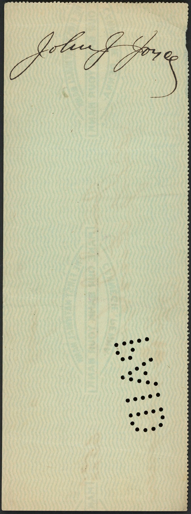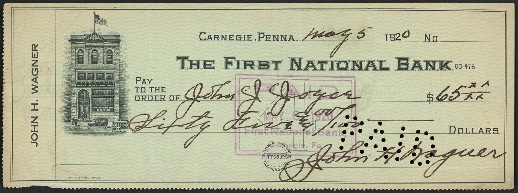 Personal check, dated May 5, 1920, signed by legendary Hall of Fame shortstop Honus Wagner. The check, drawn on The First National Bank of Carnegie, Pennsylvania, is made out to "John J. Joyer" in the amount of $65.00. Beautifully signed "John H. Wagner" in black fountain pen (grading 10/10) along the base (a few of the cancellation holes touch upon Wagner's signature). Wagner's name is preprinted along the left border. Endorsed by the recipient on the reverse. The check (8.25x3"), which has normal bank cancellation stamps and holes, displays three vertical folds, very light staining and creasing near the left border, and a tiny tear along the bottom left border. Full LOA from PSA.