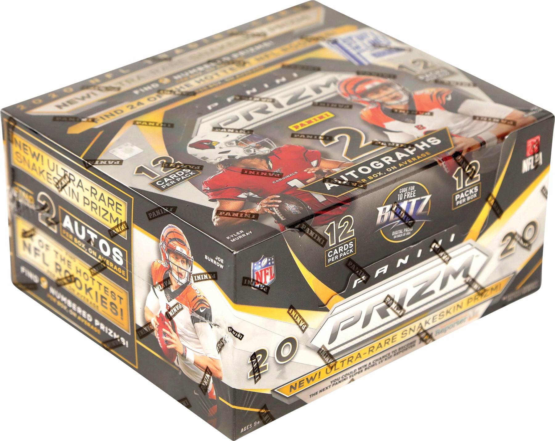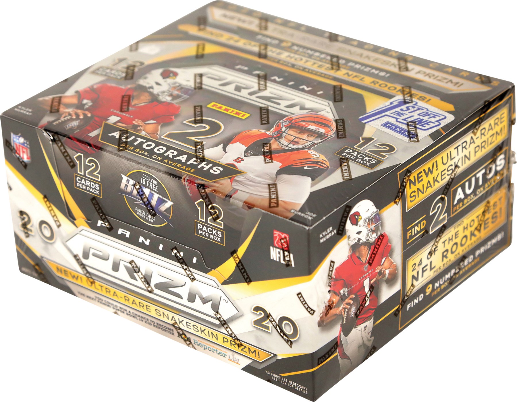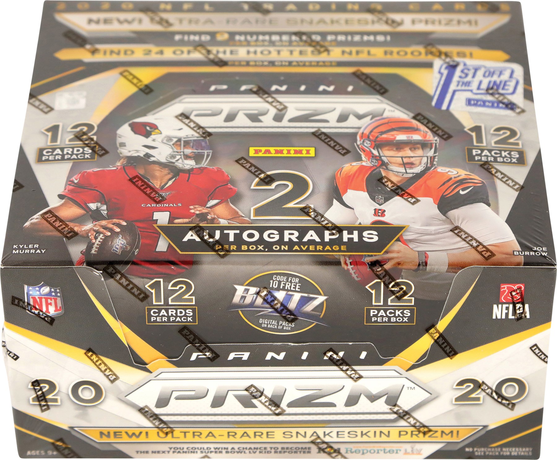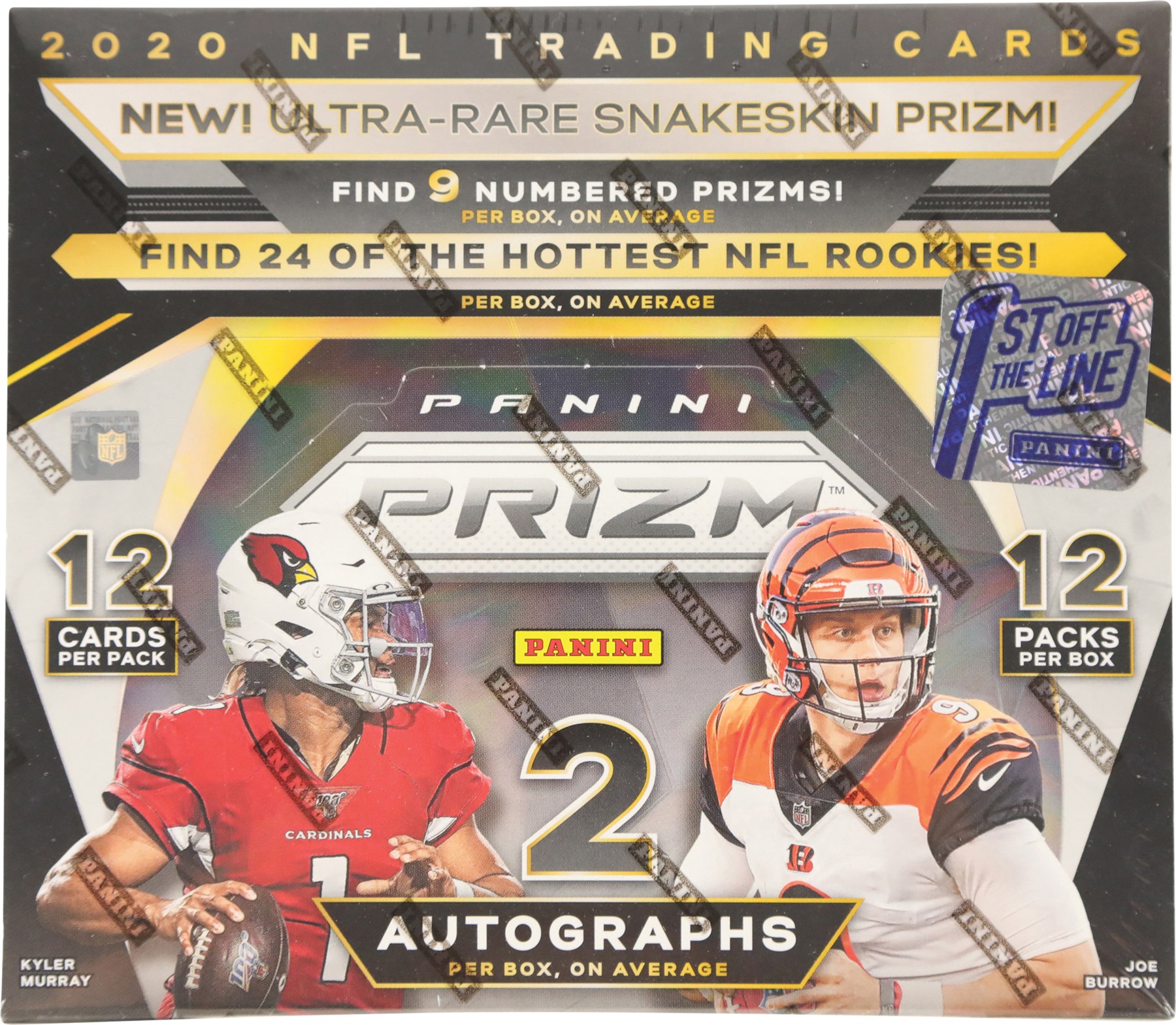This lot features a Factory Sealed Unopened 2020 Prizm NFL First Off The Line (FOTL) Hobby Box. This box contains 12 packs with 12 cards in each pack for a total of 144 cards. Collectors can expect to find an average of 2 autograph cards, 9 serial numbered cards, 2 silver prizms, 4 inserts, and 24 rookie cards. The FOTL box contains 3 shimmer cards, 2 base cards, and 1 autograph card: Red Shimmer (#/35); Blue Shimmer (#/25); and Green Shimmer (#/5). The 2020 NFL Rookie class is one for the ages and contains numerous rookies who have turned out to be proven stars in the league including: Joe Burrow, Justin Herbert, Jalen Hurts, Justin Jefferson, Tua Tagovailoa, CeeDee Lamb, Jordan Love, and so many more star-studded rookies.