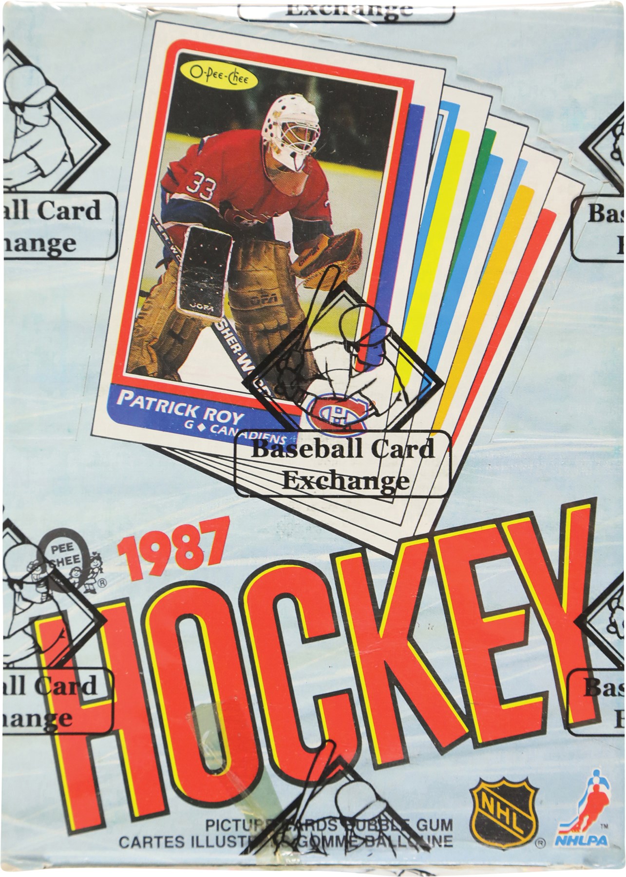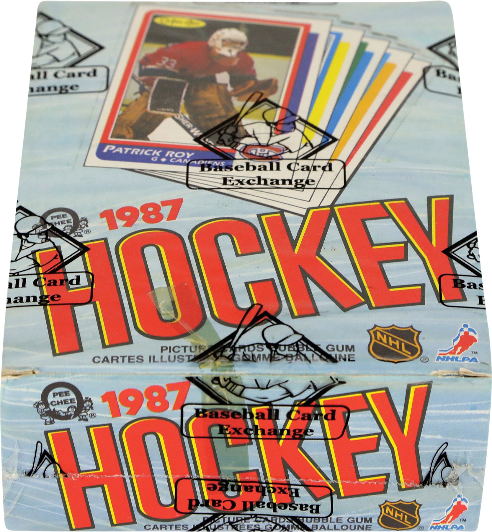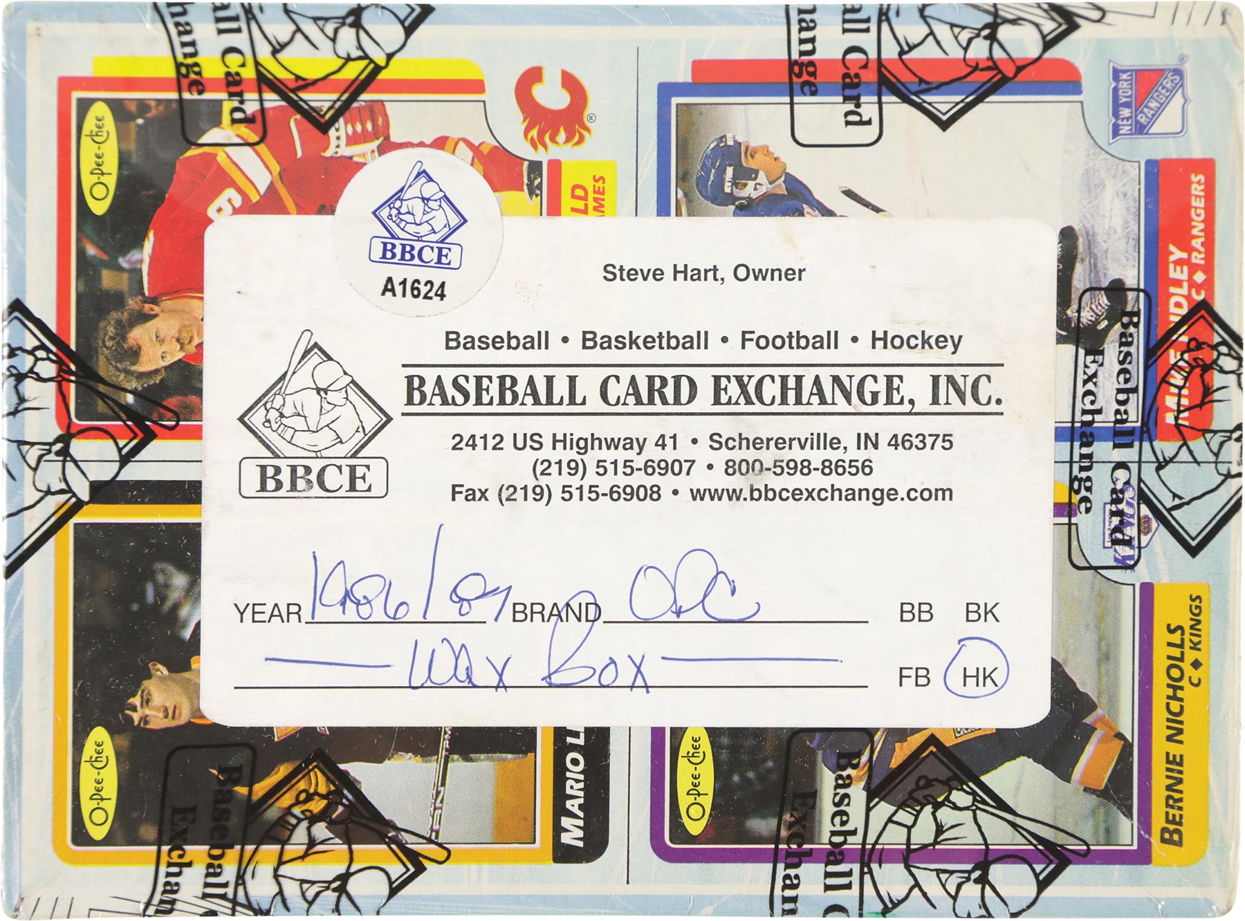 1986-87 OPC 48-count unopened wax box. The box has been Authenticated and wrapped by Baseball Card Exchange. It comes with BBCE wrap, BBCE bottom label, and BBCE bottom sticker #A1624. The box has light corner and shelf wear overall. The box bottom has scattered light to moderate creases which affect the bottom cards. The top die-cut appears partially punched. The top front edge of the wrap is split. Possible rookie cards include: Patrick Roy; Wendell Clark; John Vanbiesbrouck; Gary Suter; Ray Ferraro; John MacLean; Petr Klima; Dirk Graham; Steve Thomas; Joel Otto; and many others. Cards are assumed to be in NM or better condition.