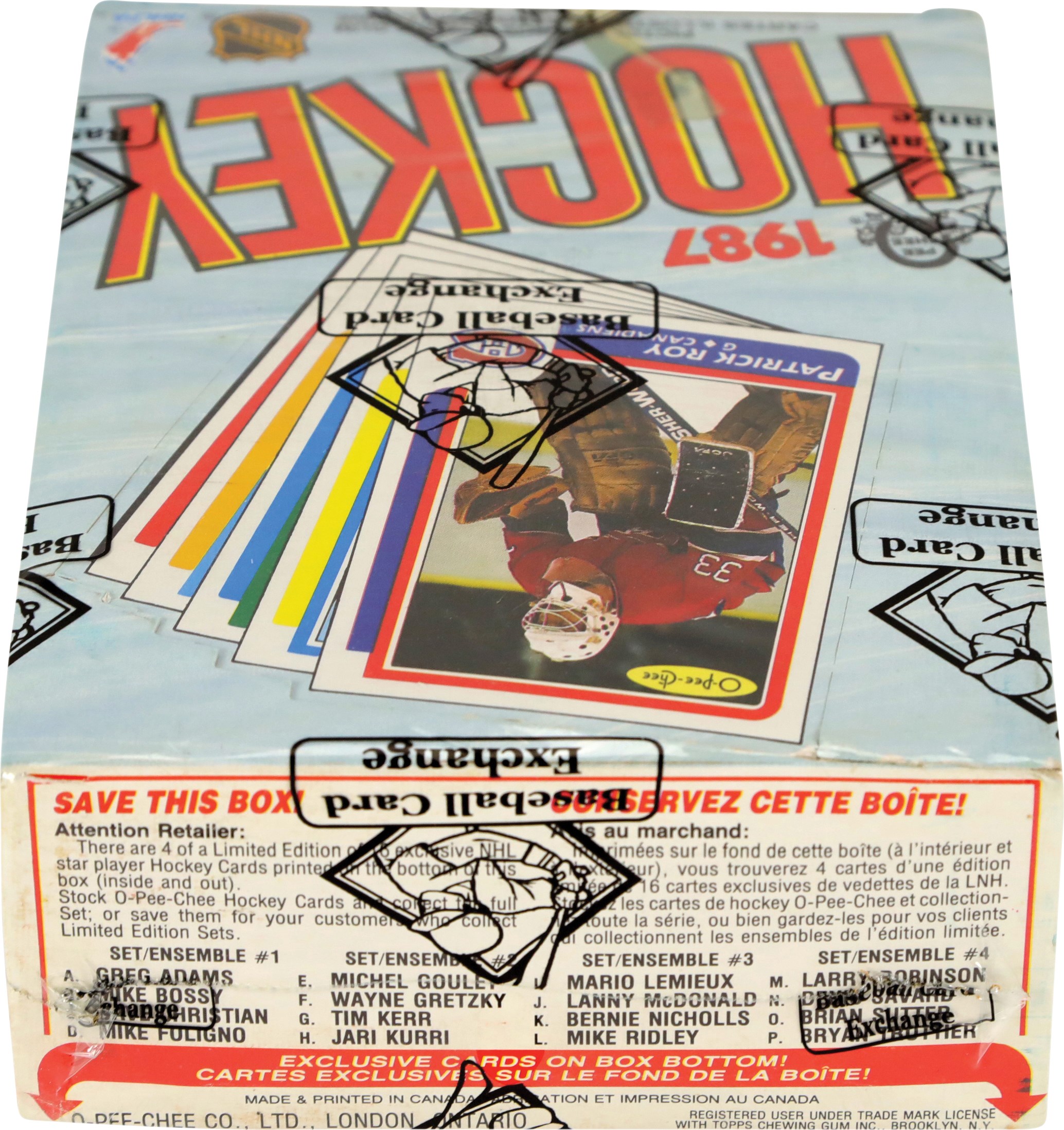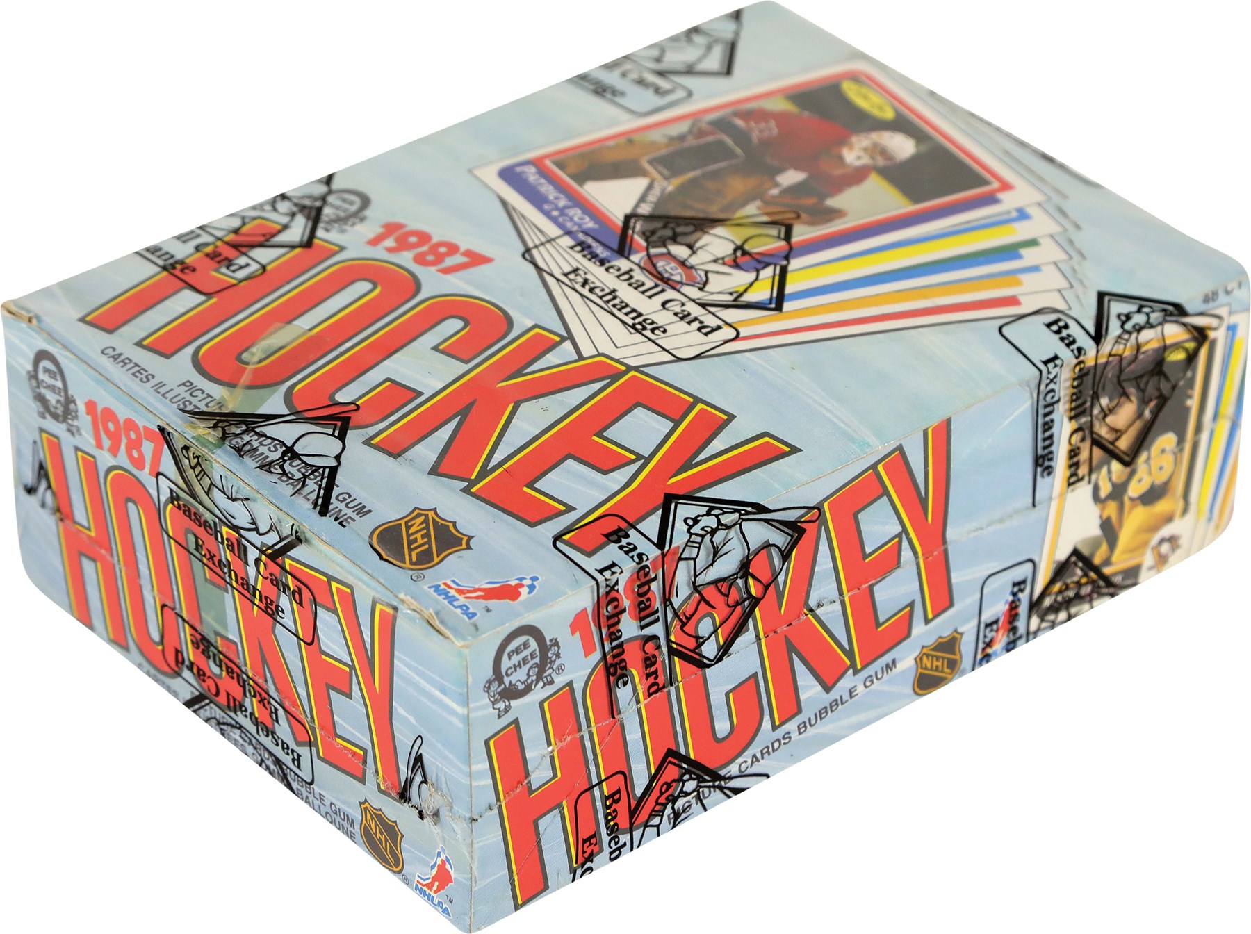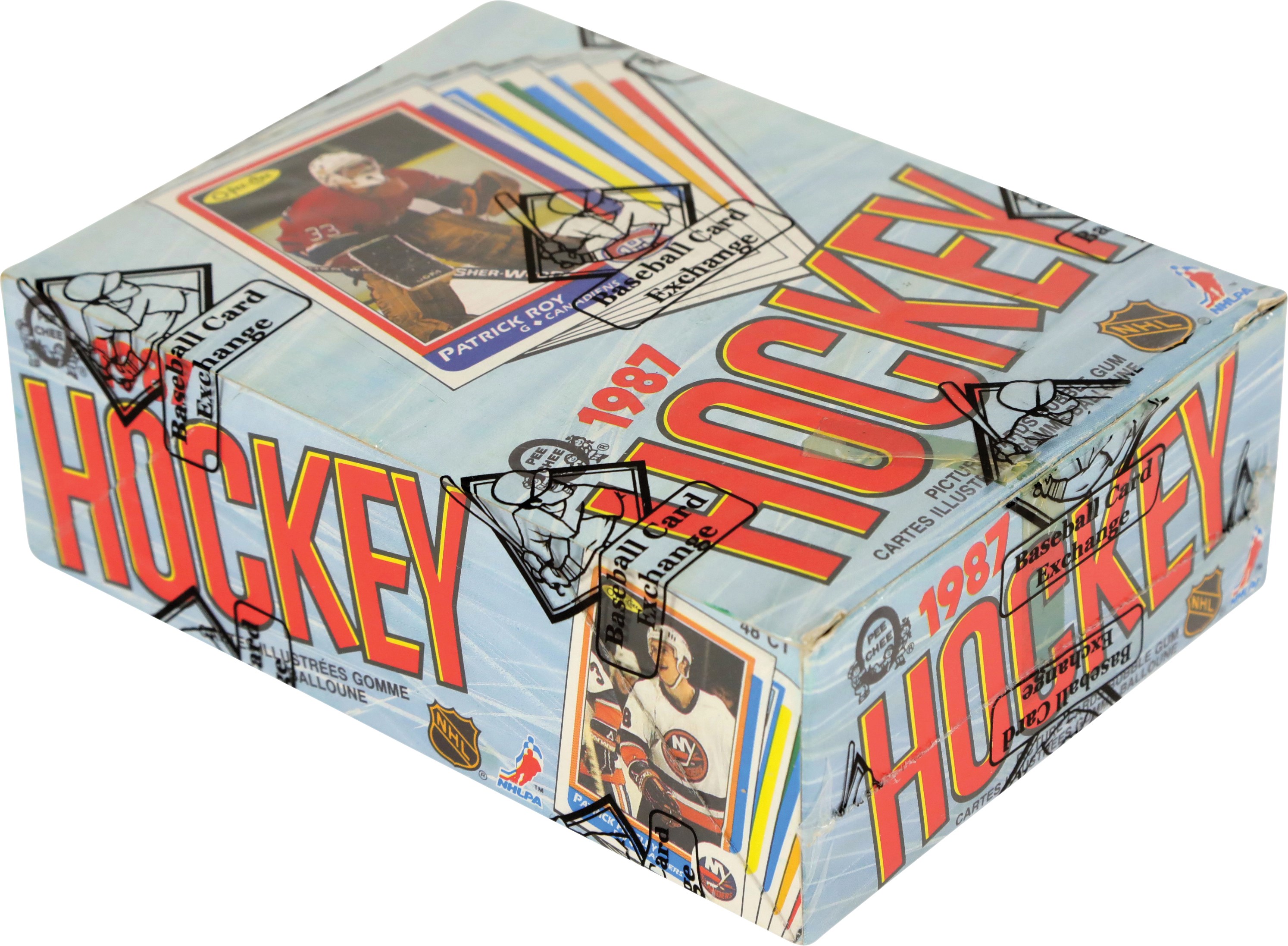 1986-87 OPC 48-count unopened wax box. The box has been Authenticated and wrapped by Baseball Card Exchange. It comes with BBCE wrap, BBCE bottom label, and BBCE bottom sticker #A1624. The box has light corner and shelf wear overall. The box bottom has scattered light to moderate creases which affect the bottom cards. The top die-cut appears partially punched. The top front edge of the wrap is split. Possible rookie cards include: Patrick Roy; Wendell Clark; John Vanbiesbrouck; Gary Suter; Ray Ferraro; John MacLean; Petr Klima; Dirk Graham; Steve Thomas; Joel Otto; and many others. Cards are assumed to be in NM or better condition.
