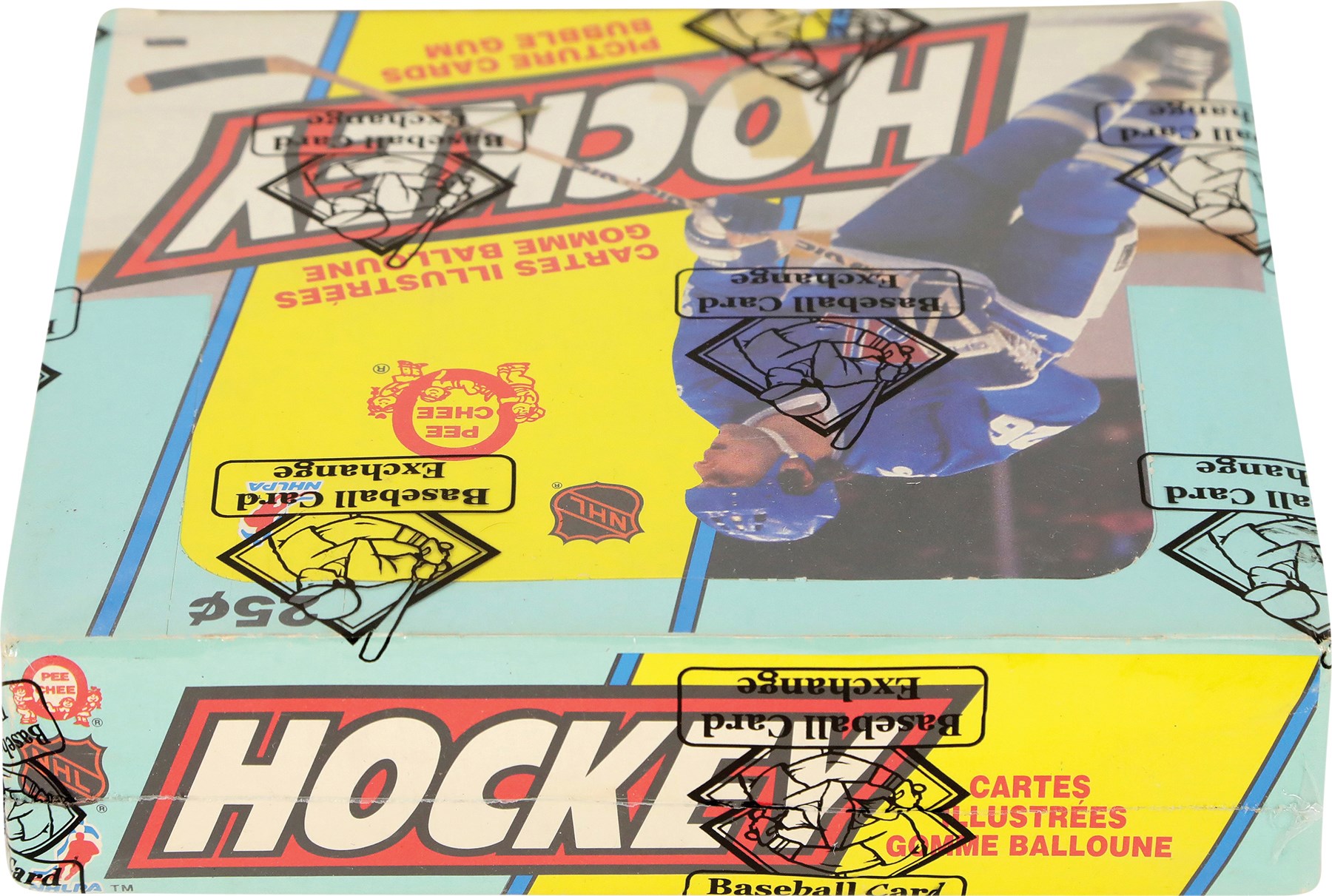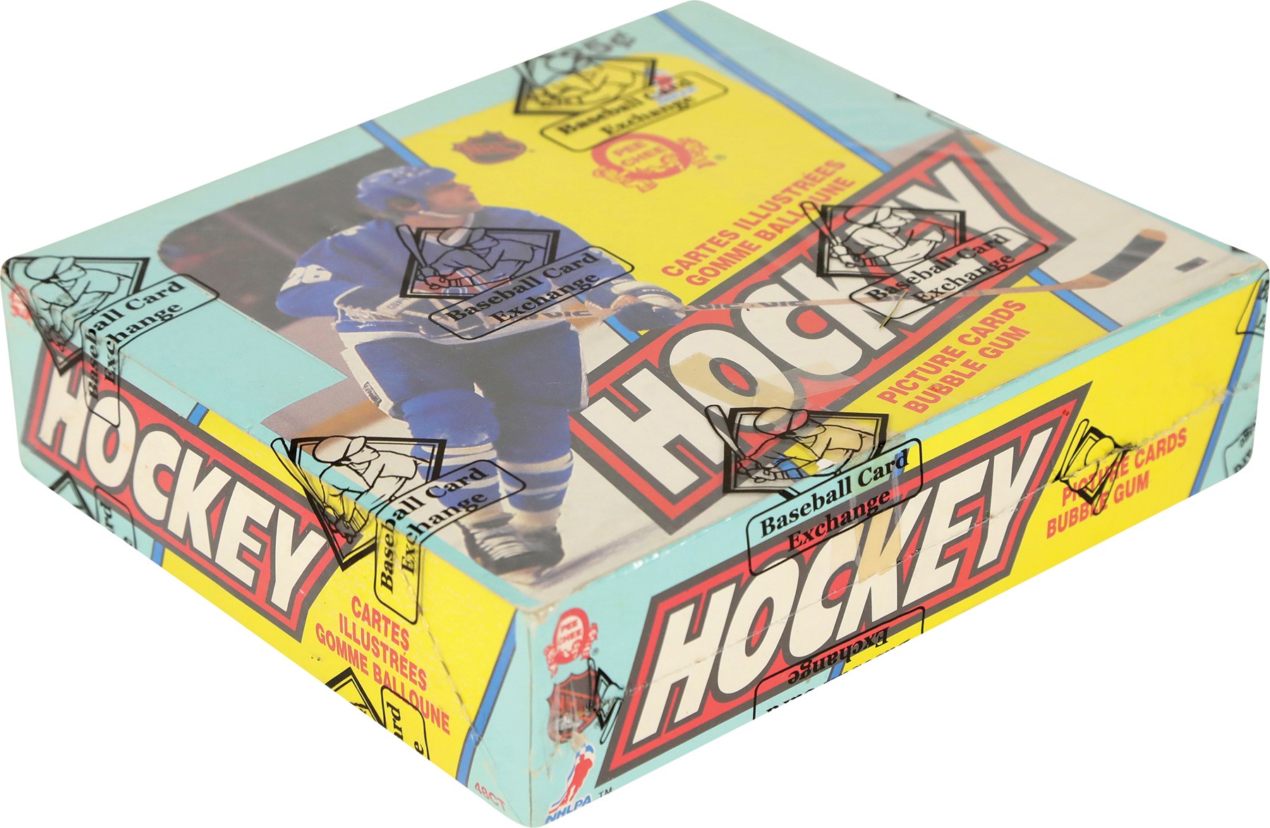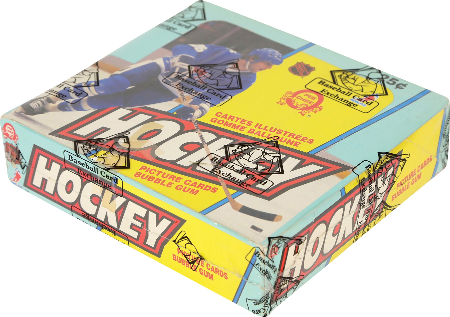 1983-84 OPC Hockey 48-count unopened wax box. The box has been authenticated and wrapped by Baseball Card Exchange. It comes with BBCE wrap; BBCE bottom label; and BBCE bottom hologram sticker. The box exhibits light corner and shelf wear while the white box bottom displays scattered light soiling. The top die cut appears unpunched. Possible rookie cards include: Phil Housley; Scott Stevens; Steve Larmer; Bernie Nicholls; Pelle Lindbergh; Brian Bellows; Guy Carboneau; Mats Naslund; Chris Nilan; Walt Poddubny; and many others. Cards are assumed to be in NM or better condition.