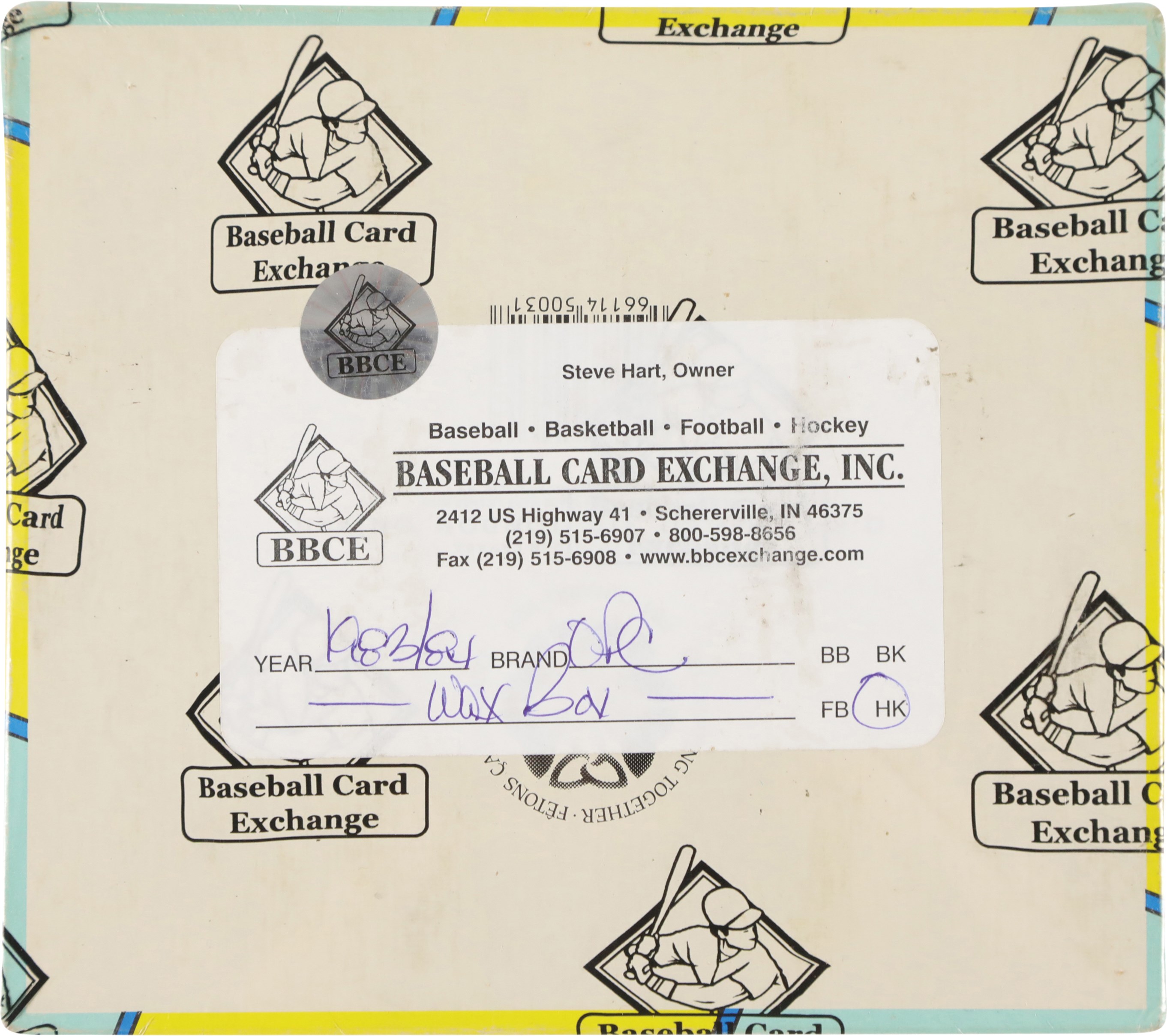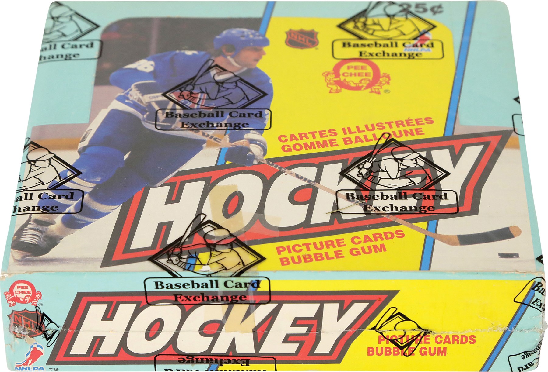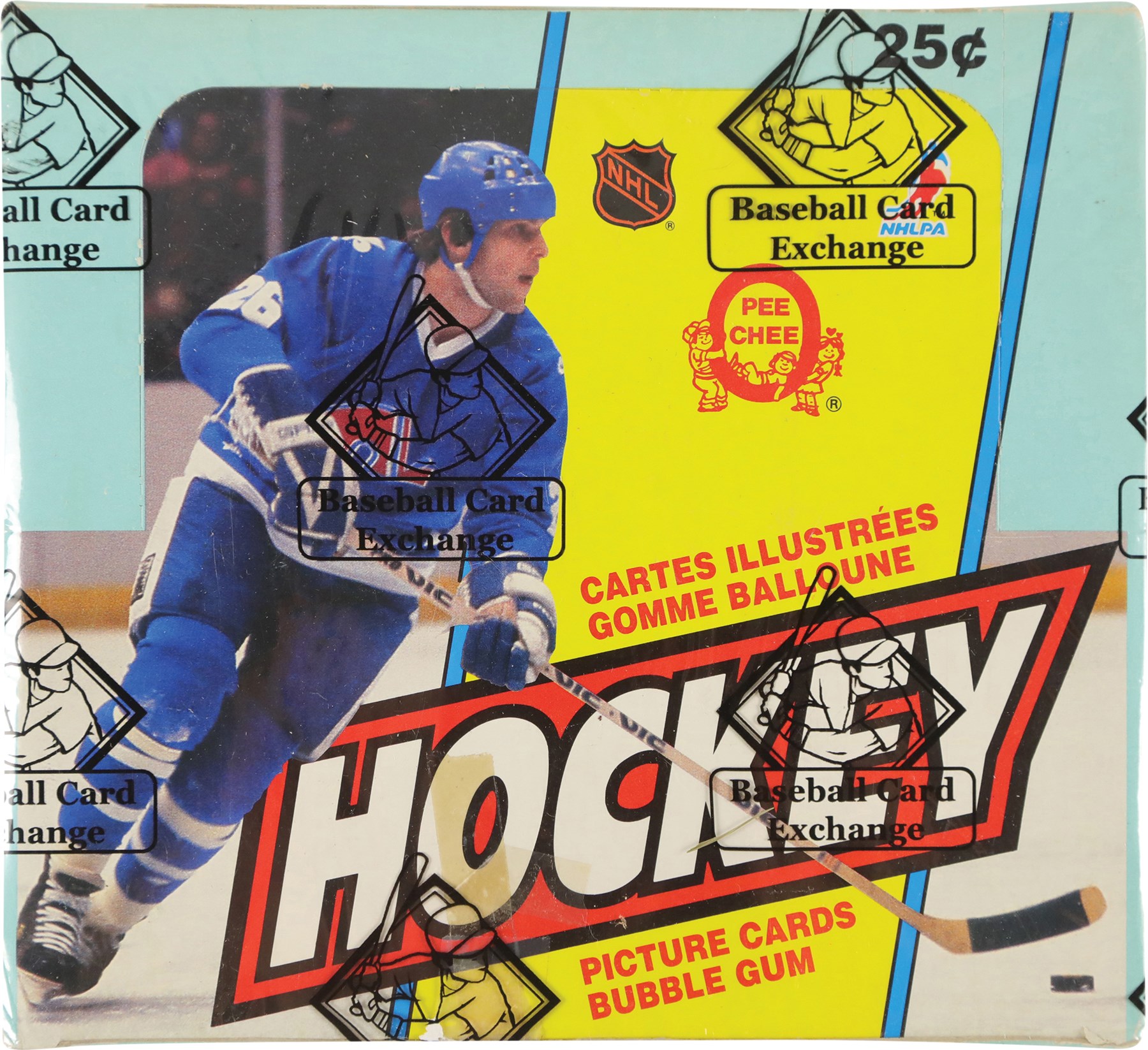 1983-84 OPC Hockey 48-count unopened wax box. The box has been authenticated and wrapped by Baseball Card Exchange. It comes with BBCE wrap; BBCE bottom label; and BBCE bottom hologram sticker. The box exhibits light corner and shelf wear while the white box bottom displays scattered light soiling. The top die cut appears unpunched. Possible rookie cards include: Phil Housley; Scott Stevens; Steve Larmer; Bernie Nicholls; Pelle Lindbergh; Brian Bellows; Guy Carboneau; Mats Naslund; Chris Nilan; Walt Poddubny; and many others. Cards are assumed to be in NM or better condition.