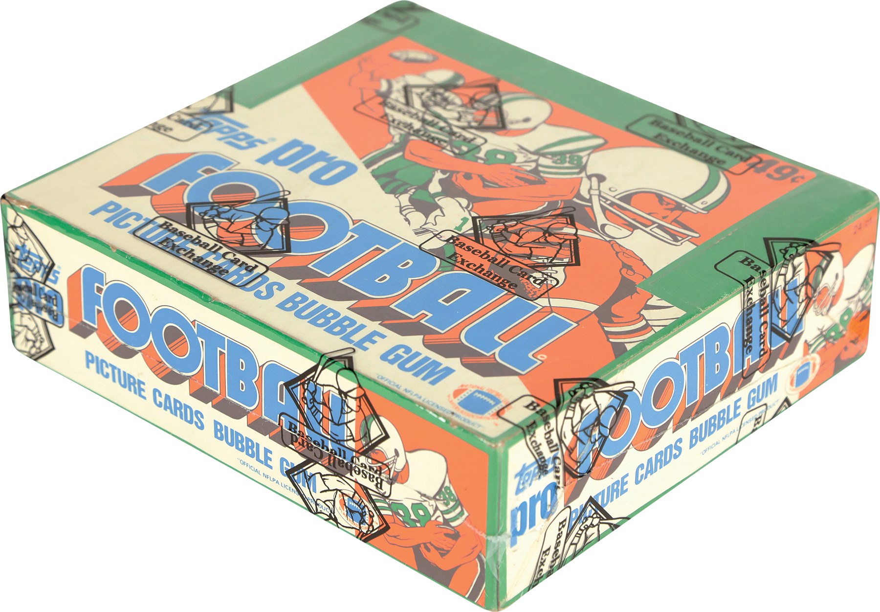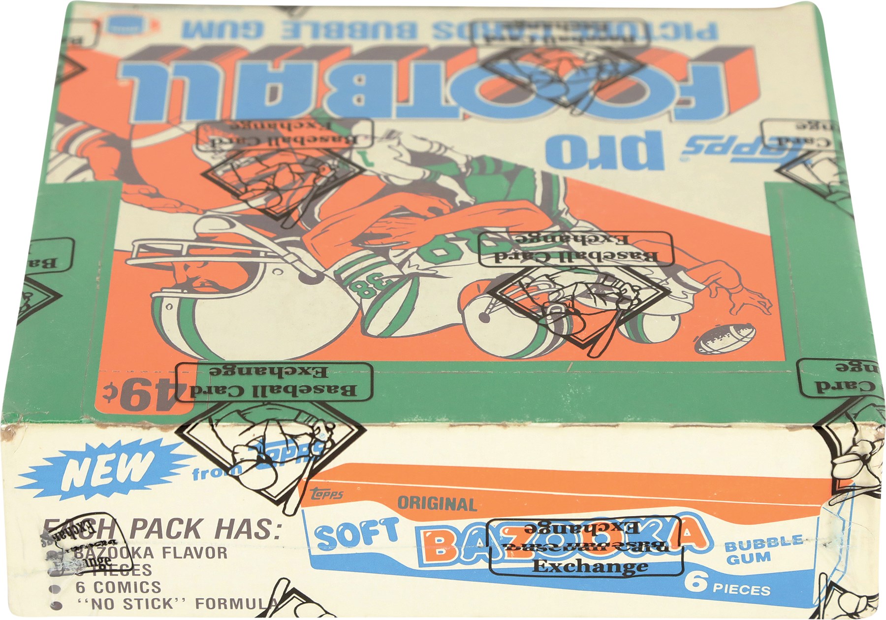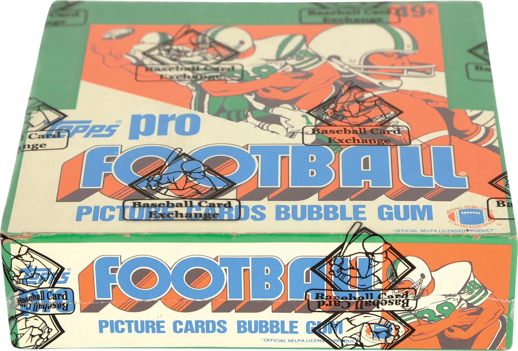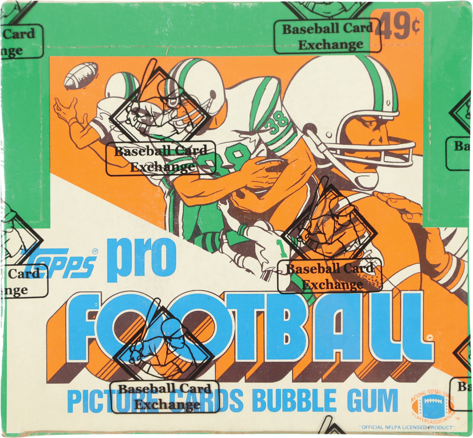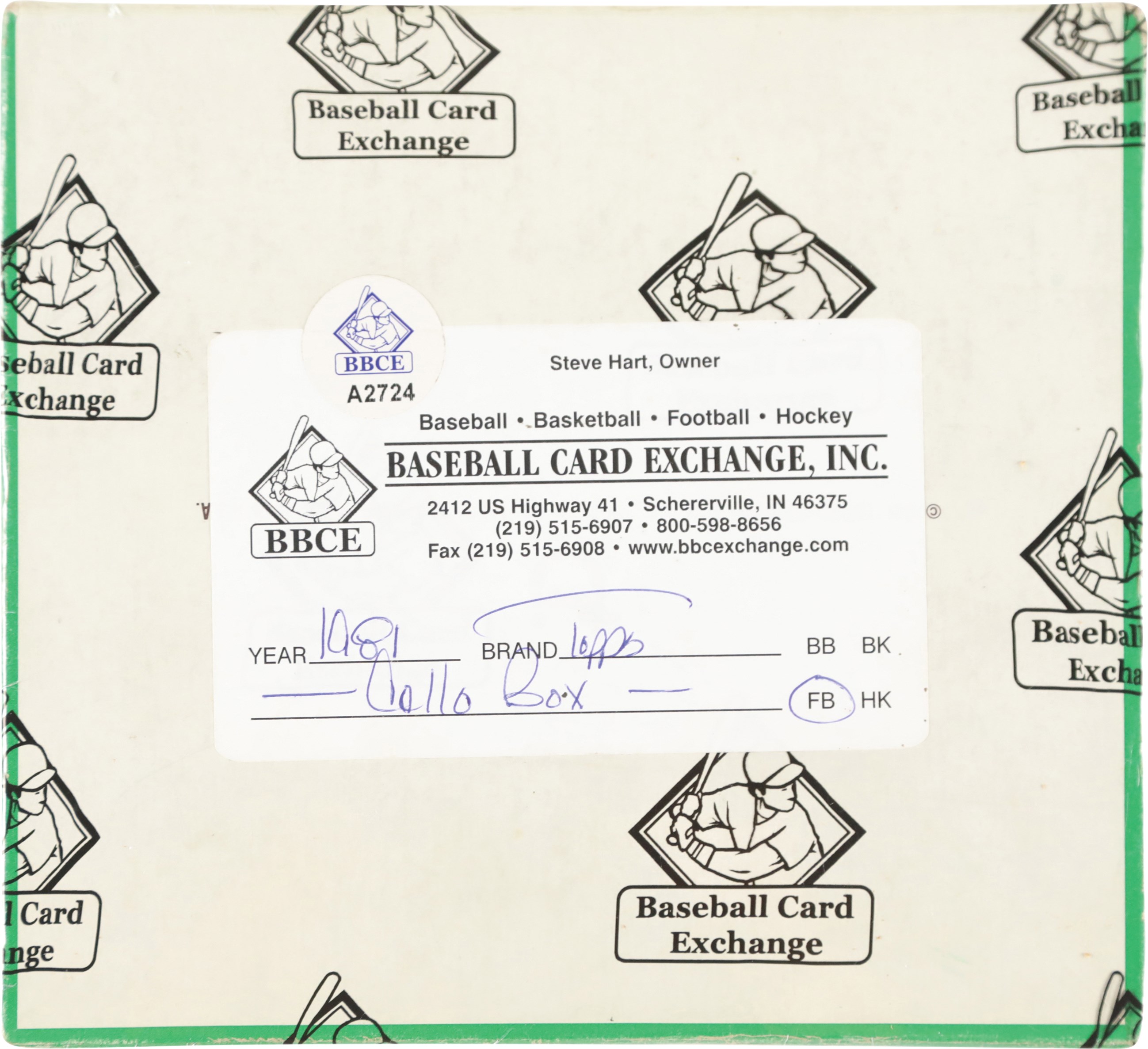 1981 Topps Football 24-Count Unopened Cello box. The box has been authenticated and wrapped by Baseball Card Exchange. It comes with BBCE wrap; BBCE bottom label; and BBCE bottom sticker #A2724. Overall, the box exhibits light to moderate corner; edge; and shelf wear with some scattered light color rubs. The blank white box bottom has light scattered soiling. The top die-cut appears unpunched. Possible rookie cards include: Joe Montana; Art Monk; Dan Hampton; Kellen Winslow; Dwight Clark; Billy Sims; Charles White; Nick Lowery; Marty Lyons; Mark Gastineau; Joe Cribbs; and many others. Cards are assumed to be in NM or better condition.