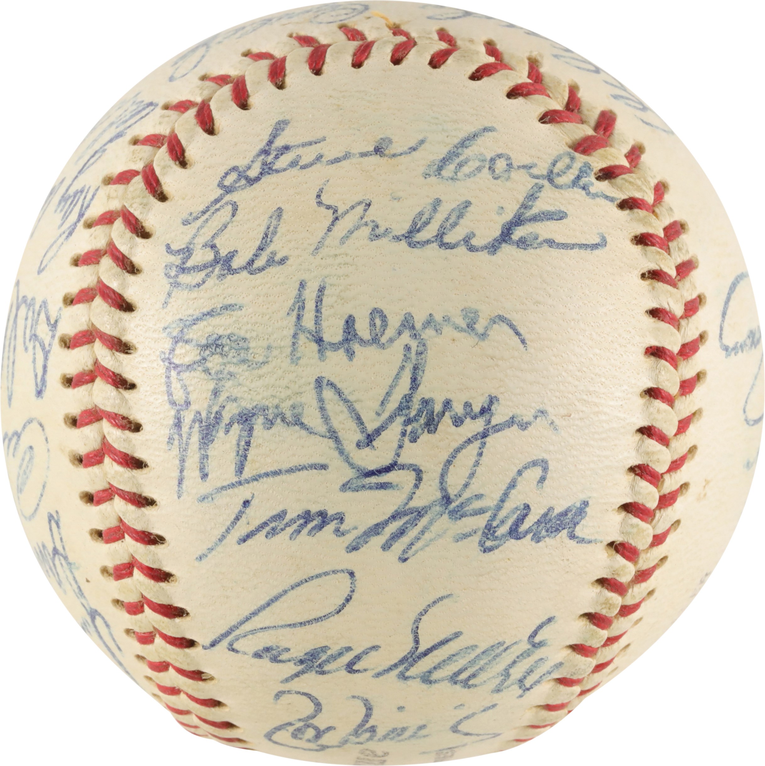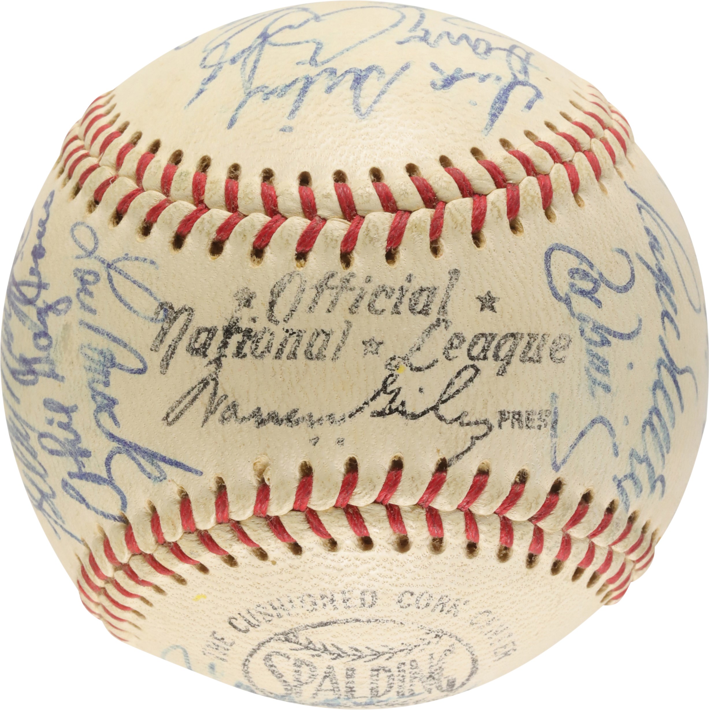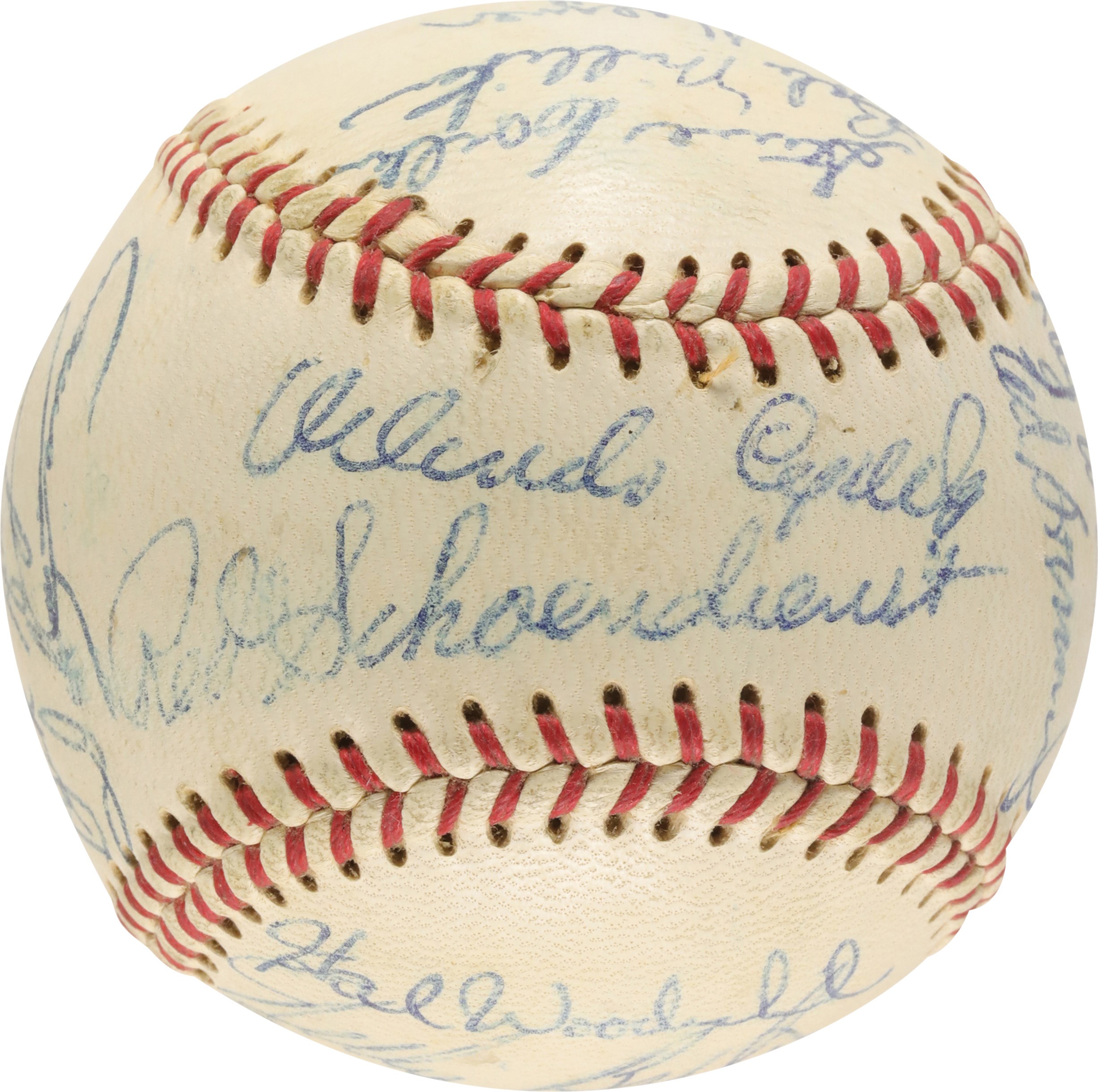 The Official National League Ball (Giles) exhibits signatures that are in blue ballpoint ink and are mostly 7 or 8/10. A few of the signatures are not legible, and the Schoendienst autograph shows some fading, particularly where "Red" signed. The ball has a few small spots, but is in overall EXCELLENT condition. The signed ball comes with a PSA LOA for the signatures.