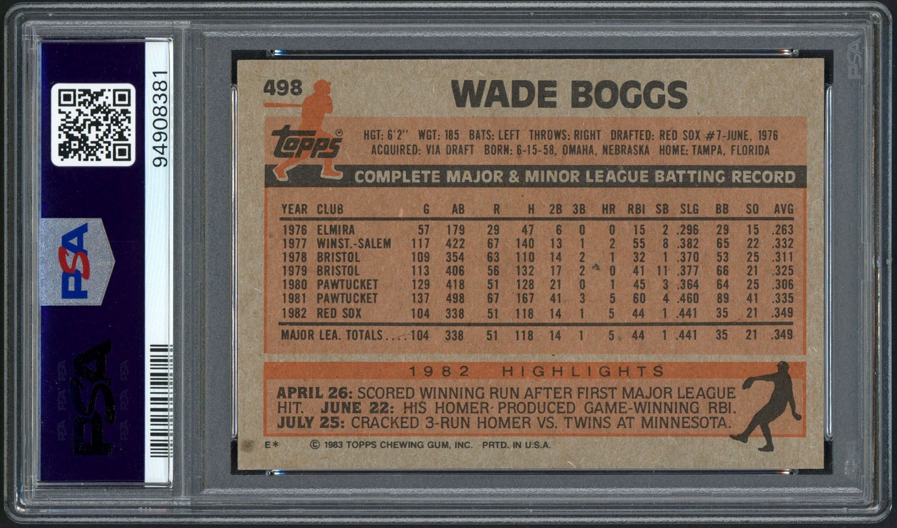 1983 Topps Baseball 498 Wade Boggs (R) card. The card has been graded and encapsulated by PSA MT 9. It has a colorful image of Boggs with hands at knees with a smaller color head shot image beneath. The borders remain bright white while the edges are crisp. All four corners are sharp and centering is excellent. The reverse is bright and clean.