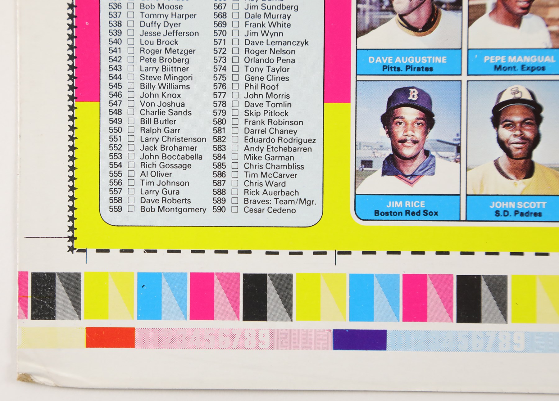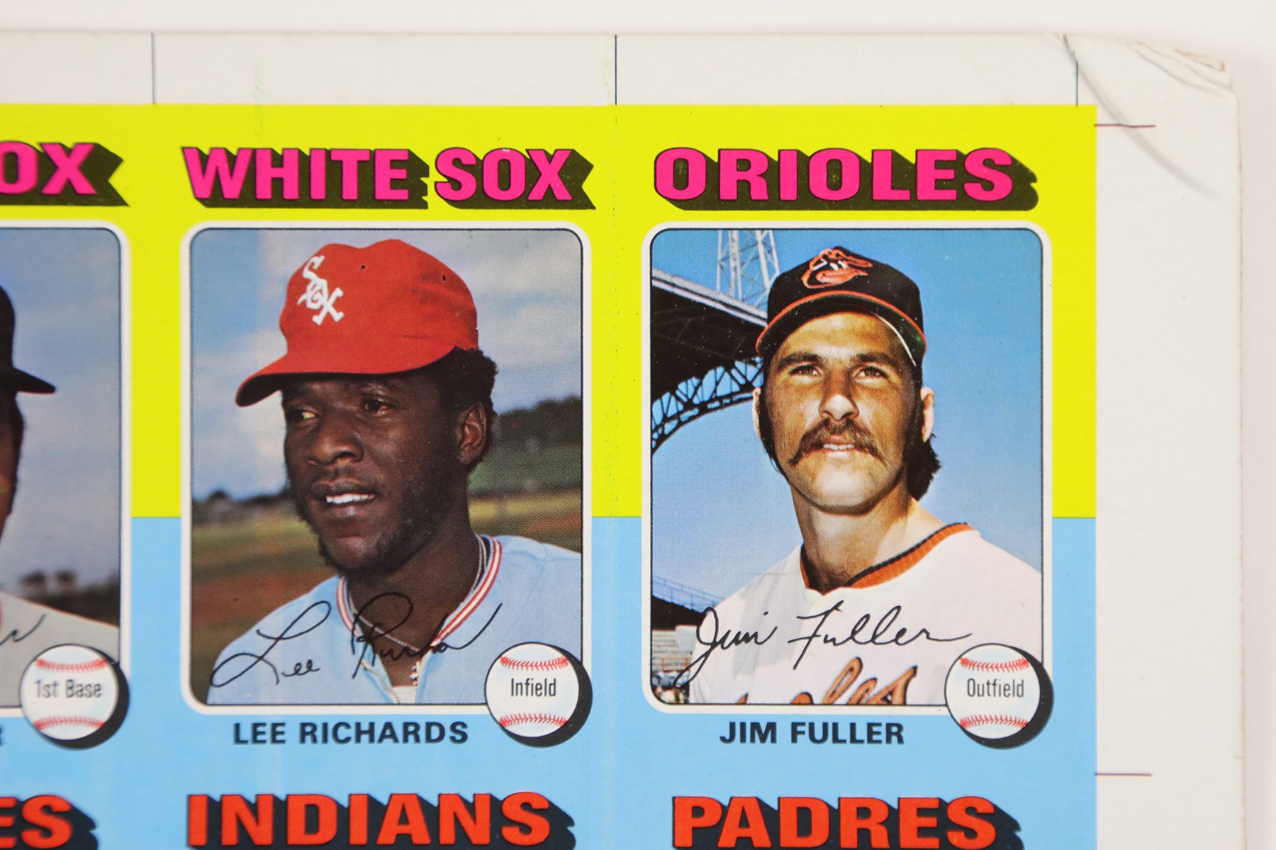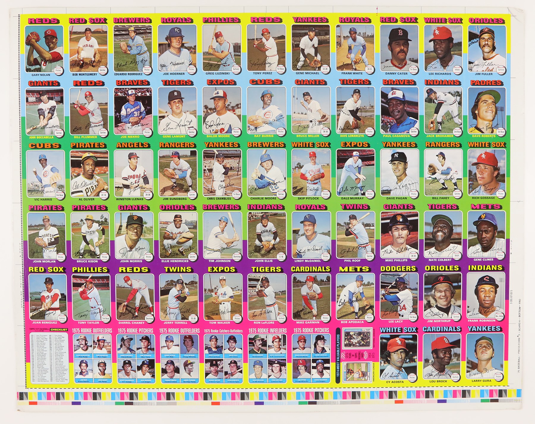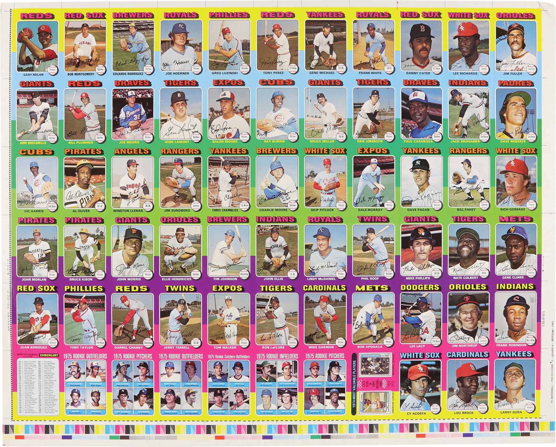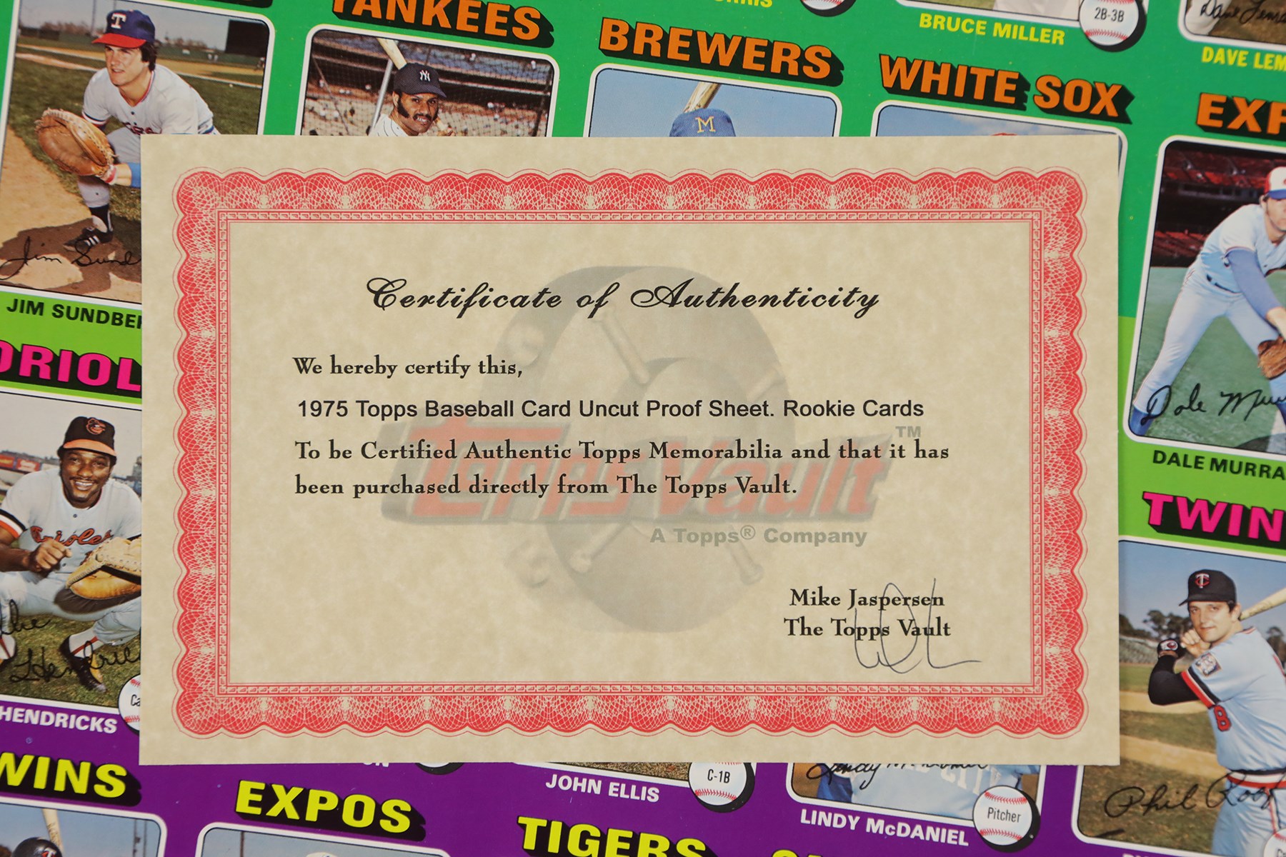 1975 Topps Baseball 66-Card Proof Sheet. The sheet displays well and is blank-backed. All four corners have wear with the top right having the most severe wear as well as a deep crease. There are scattered minor creases and small tears along the borders throughout. There is a tear/deep crease running into the Jim Fuller card on the top right. Important rookies and stars include: Jim Rice (R); Gary Carter (R); Keith Hernandez (R); Lou Brock; Frank Robinson; Rich Gossage; Tony Perez; and others. It comes with a certificate from the Topps Vault.