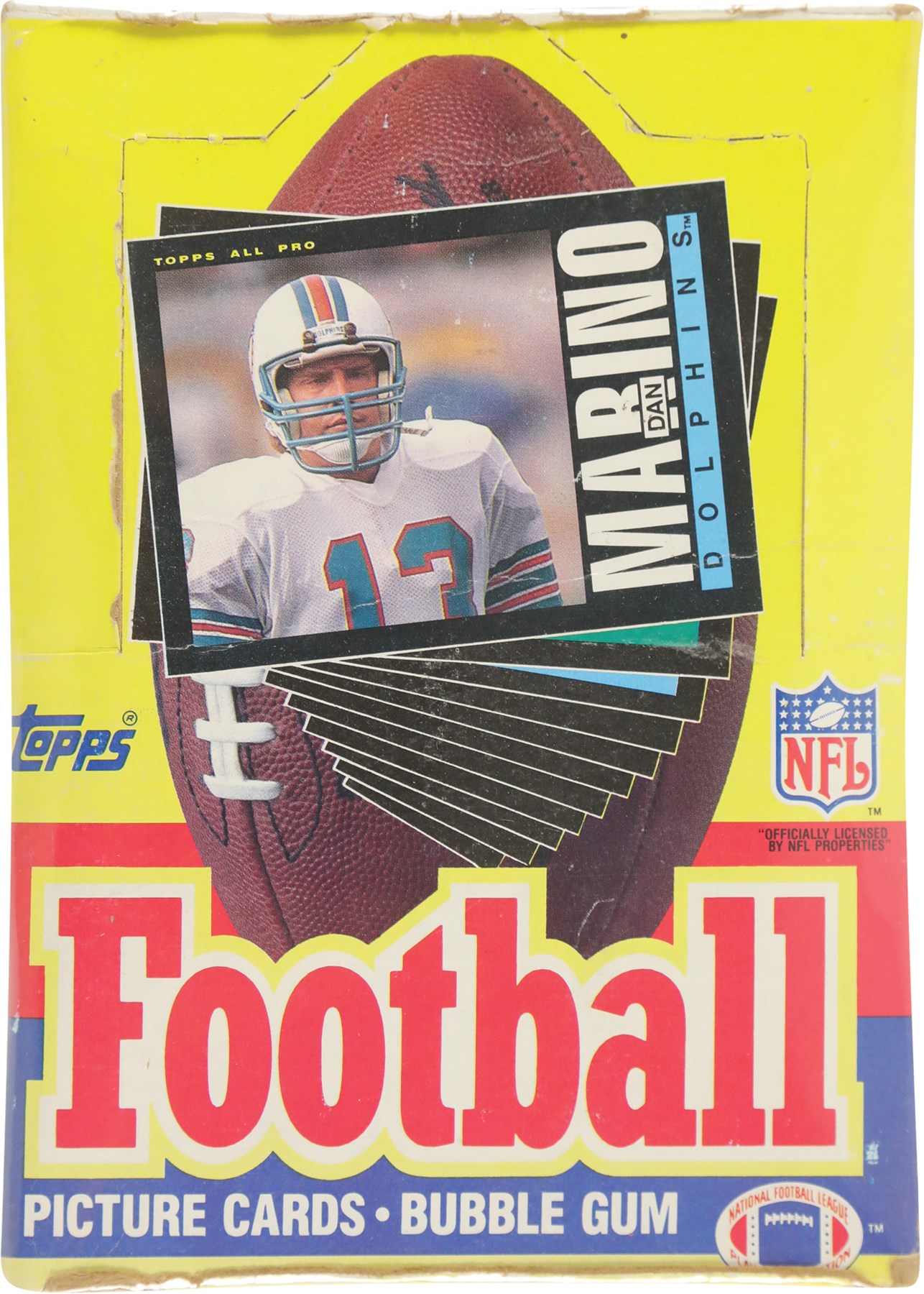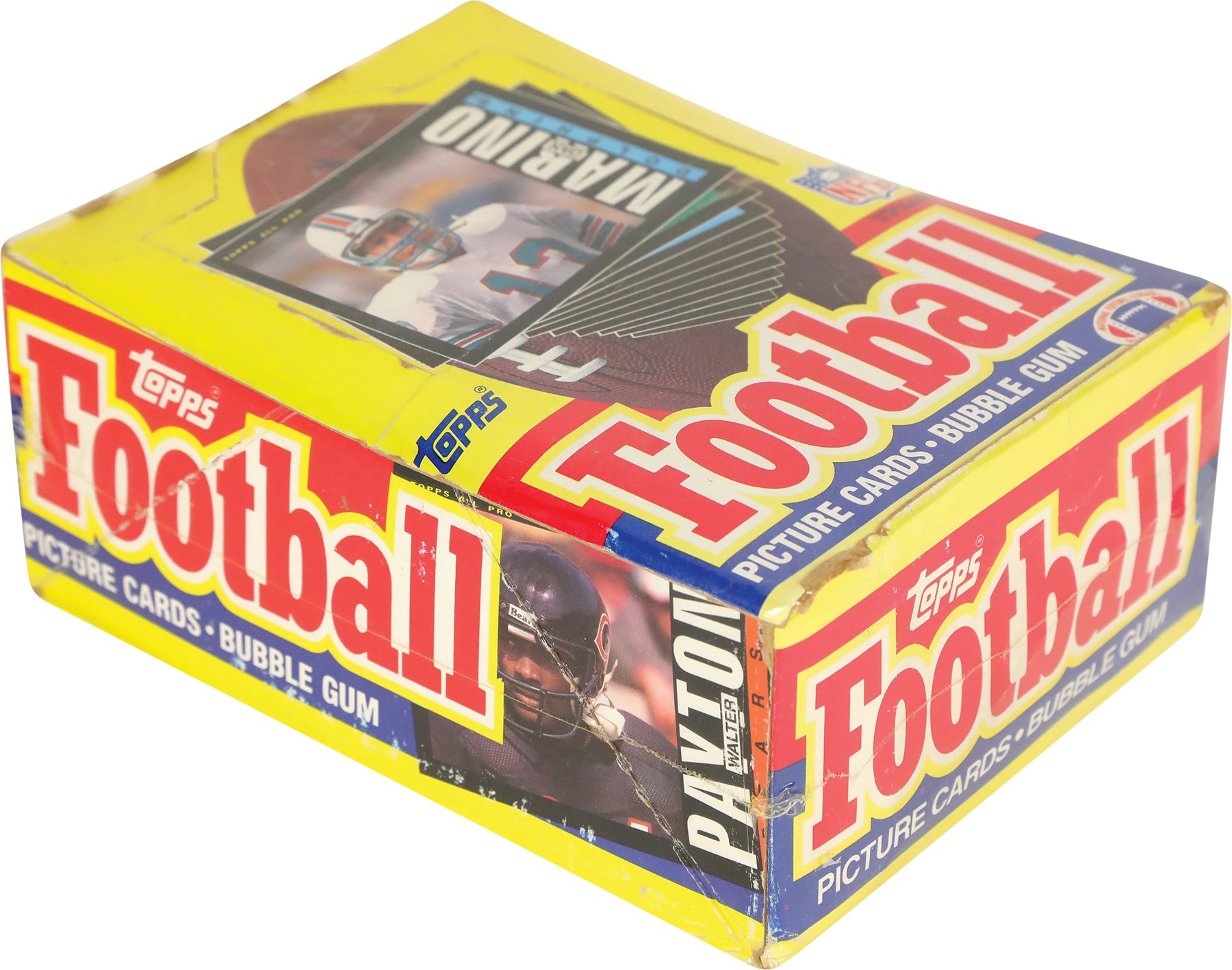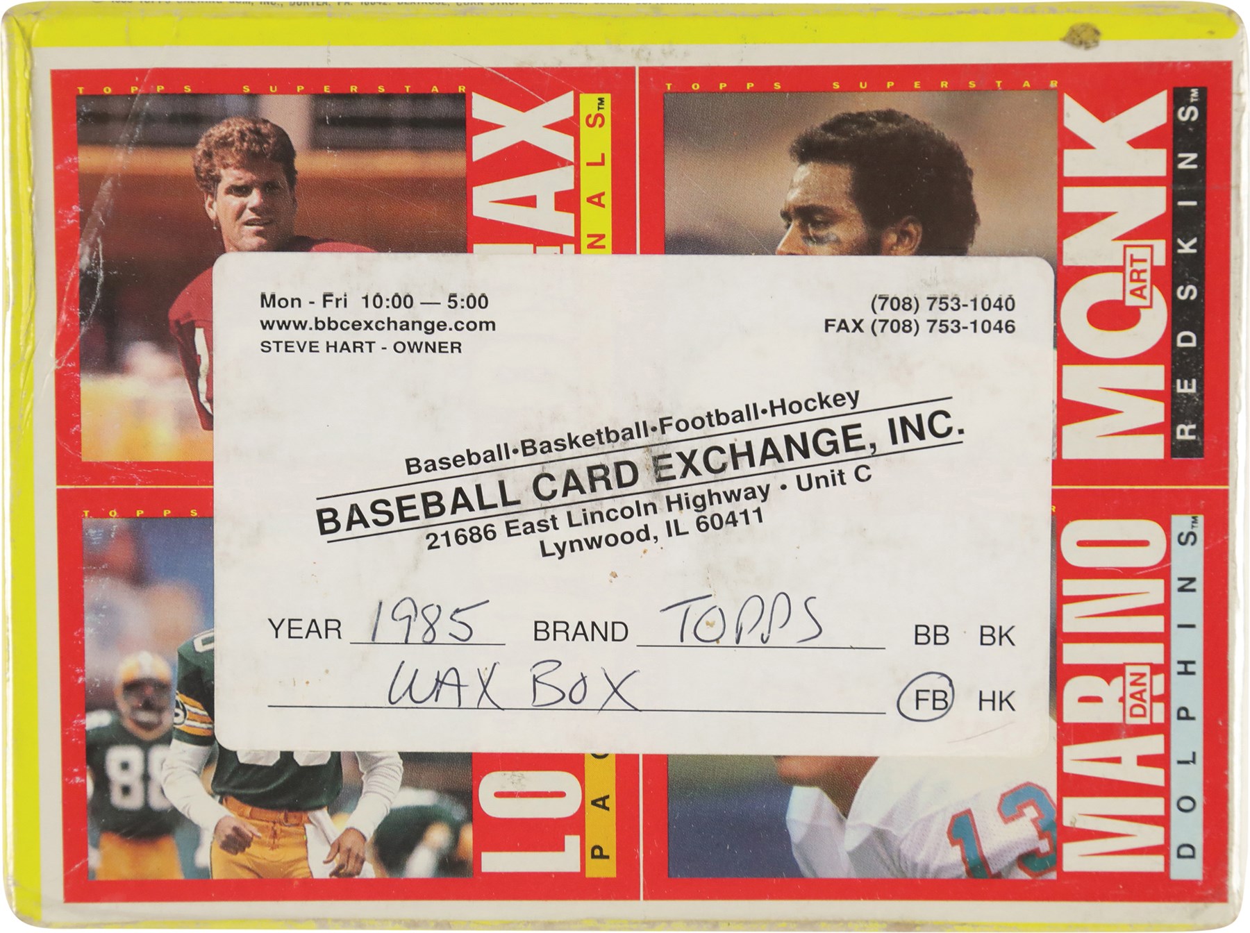 1985 Topps Football 36-Count Unopened Wax Box. The box has been authenticated and wrapped by Baseball Card Exchange. It comes with clear wrap and BBCE bottom label. The box exhibits light to moderate corner; edge; and shelf wear throughout. The front box panel has multiple creases and tears. The box bottom has multiple creases and color rubs throughout the 4-card bottom. The top die-cut appears punched. Possible rookie cards include: Warren Moon; Richard Dent; Mike Munchak; Steve McMichael; Mark Clayton; Irving Fryar; Henry Ellard; Carl Banks; Darryl Talley; and others. Cards are assumed to be in NM or better condition.
