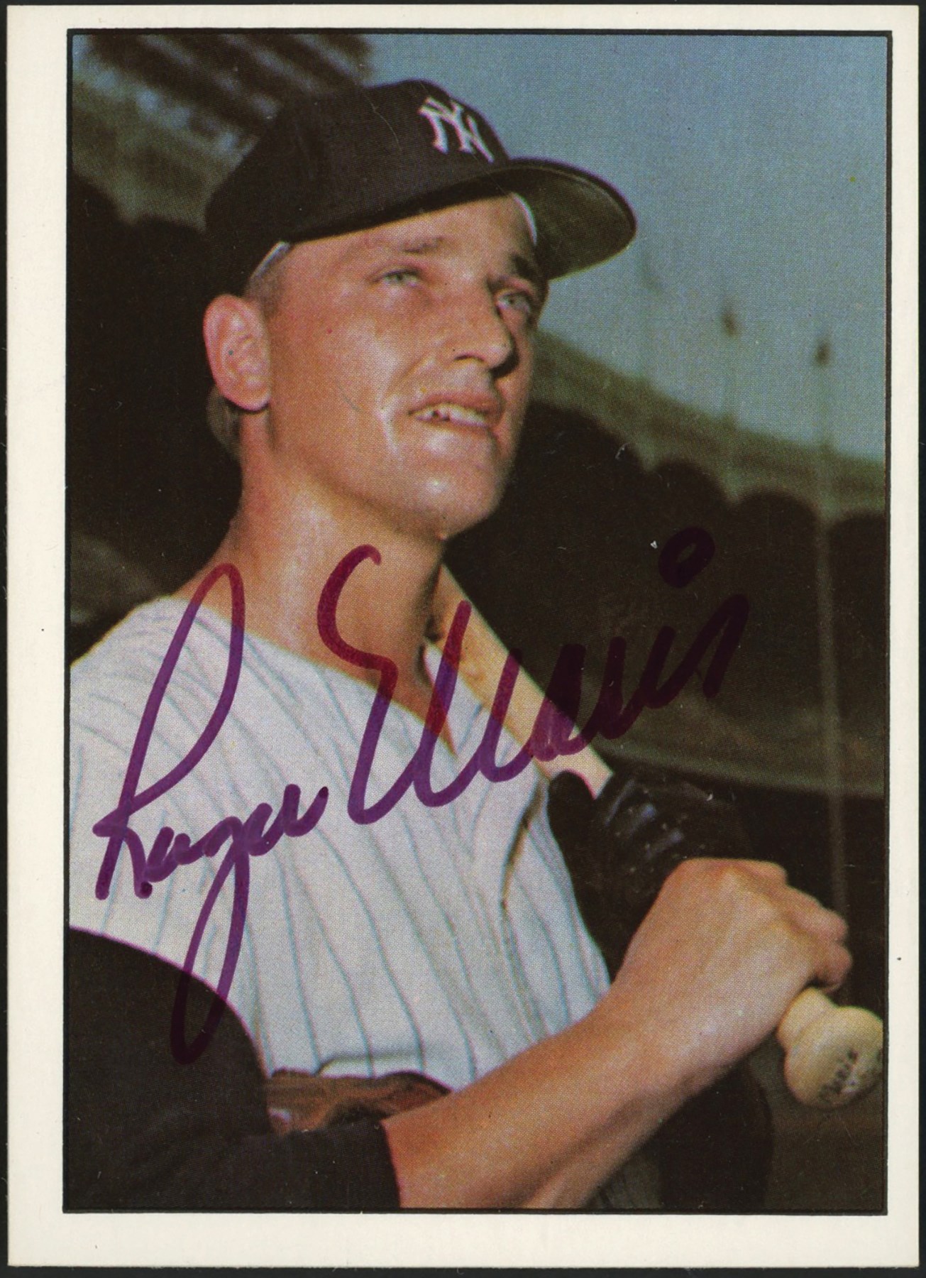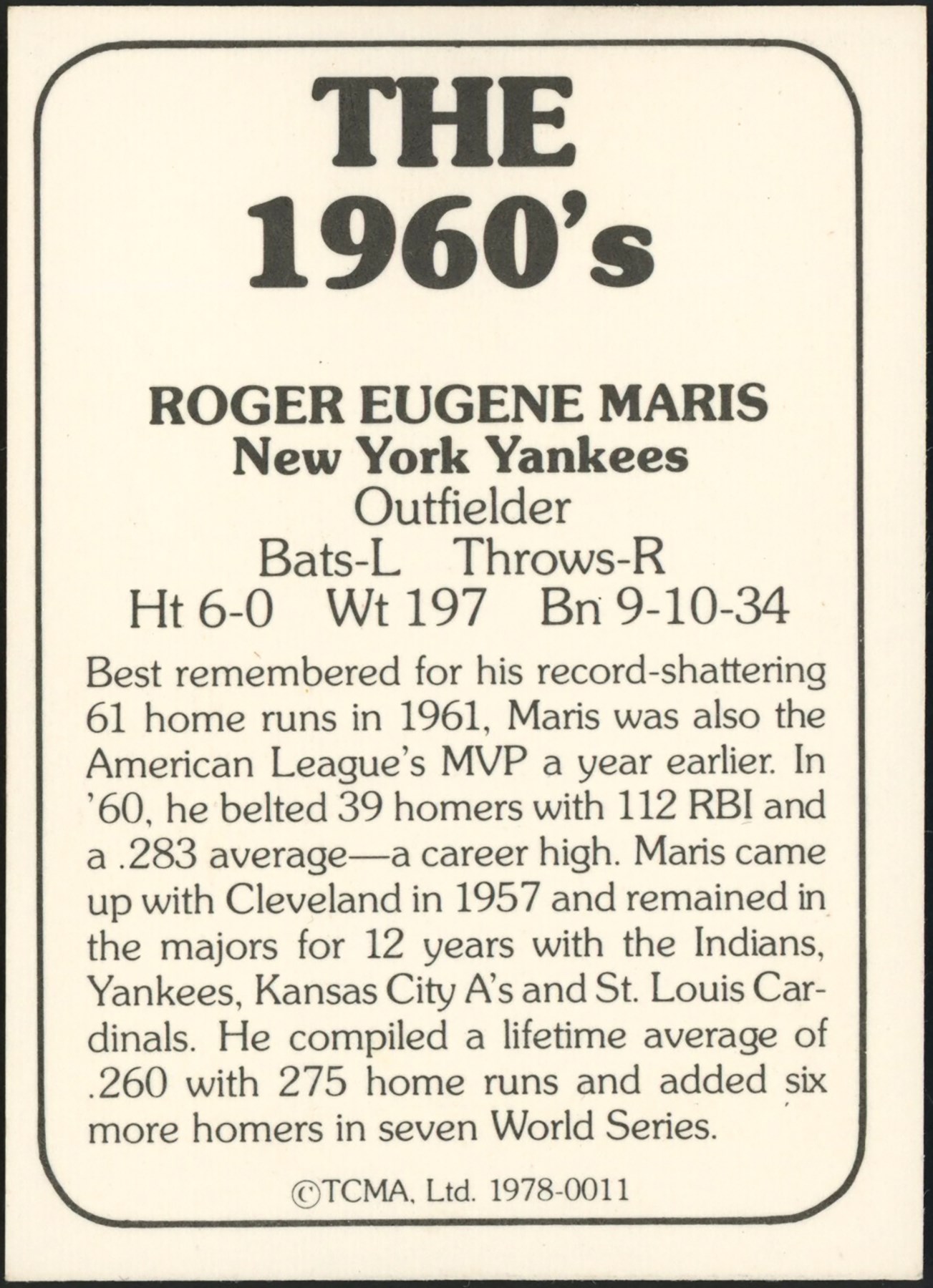 Roger Maris is most remembered for his 1961 season, when he broke Babe Ruth's single-season home run record of 60 by hitting number 61 on the final day of the regular season. Presented is a 1978 TCMA Stars Roger Maris signed. baseball card. Maris had a perfect left-handed swing for Yankee Stadium's short right field porch, but he was more than just a slugger. Maris had good speed, and he was a heady baserunner. In right field, Maris had a powerful and accurate arm, and he got good jumps on balls hit in his territory. When Mickey Mantle was out of the Yankee line-up, Maris would often play center field and do well.