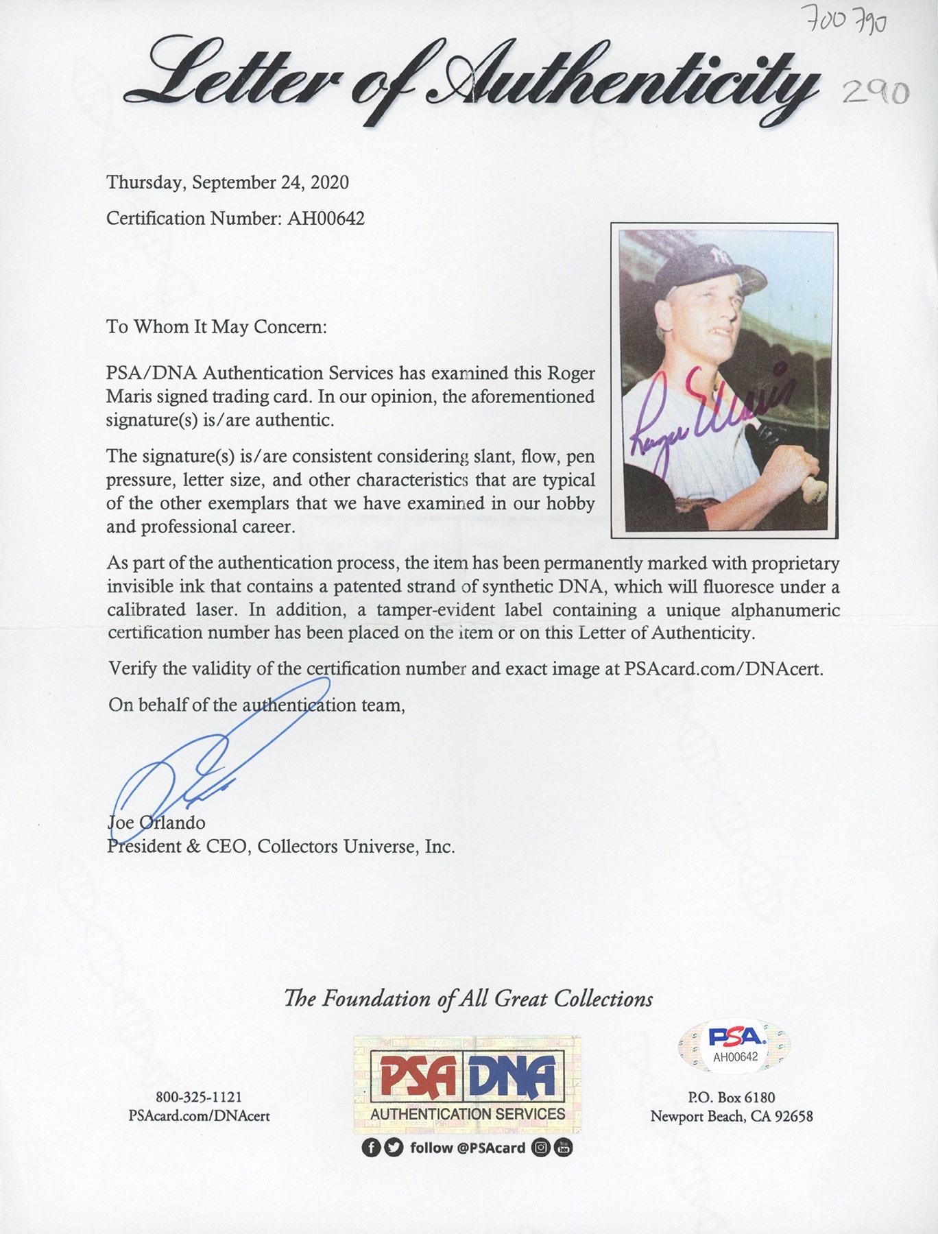 The offered signed MCMA card has a color photo of Maris holding a bat, with the famed frieze of Yankee Stadium in the background. The back of the shows, in part, "THE 1960's/ROGER EUGENE MARIS/New York Yankees". The card measures 2.5x3.5". Maris signed with a blue (bordering on purple) fine-tip marker, with a flowing script - really a beautiful autograph. The signed card is in EXCELLENT condition and the offering comes with a PSA/DNA LOA for the signature.
