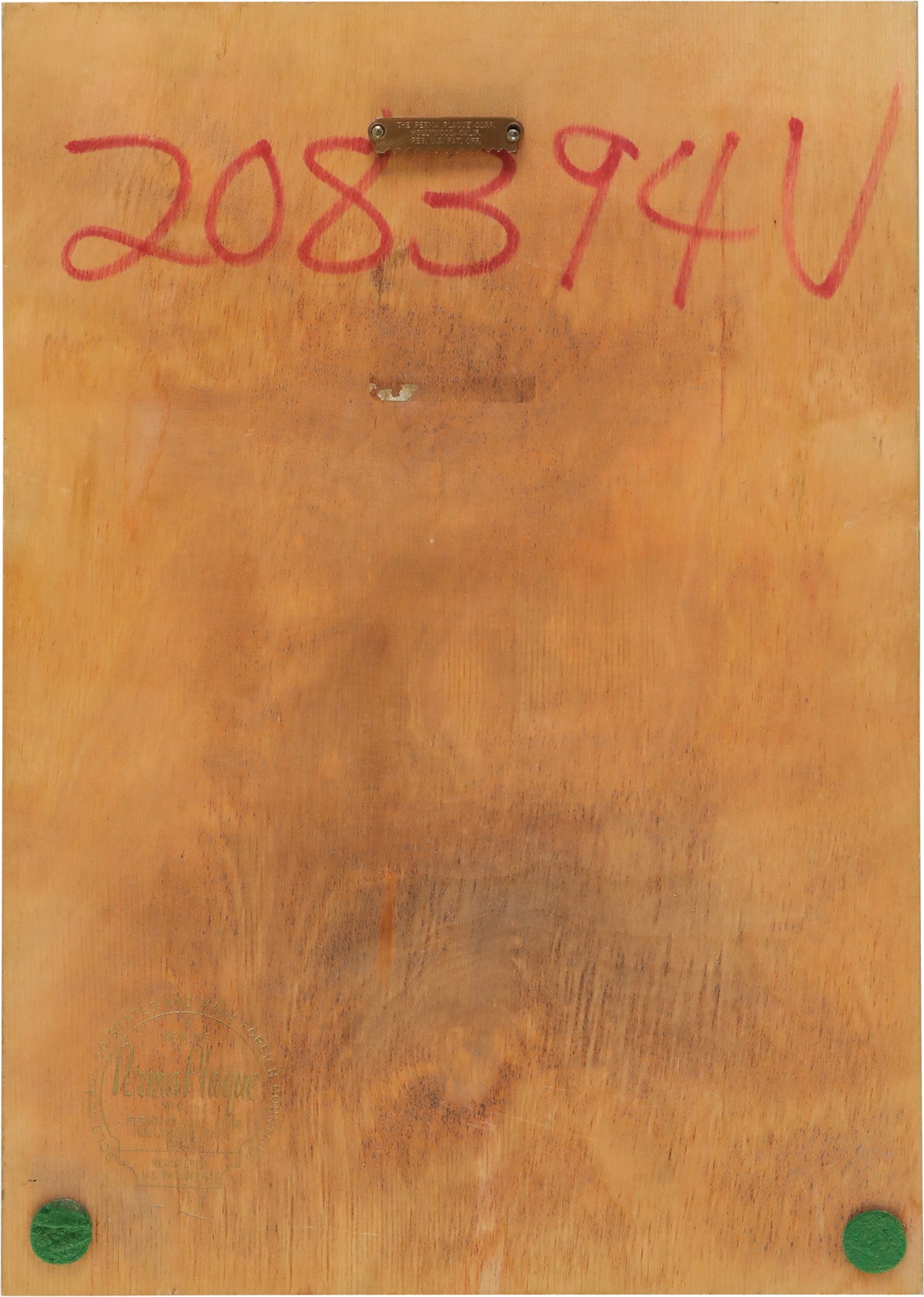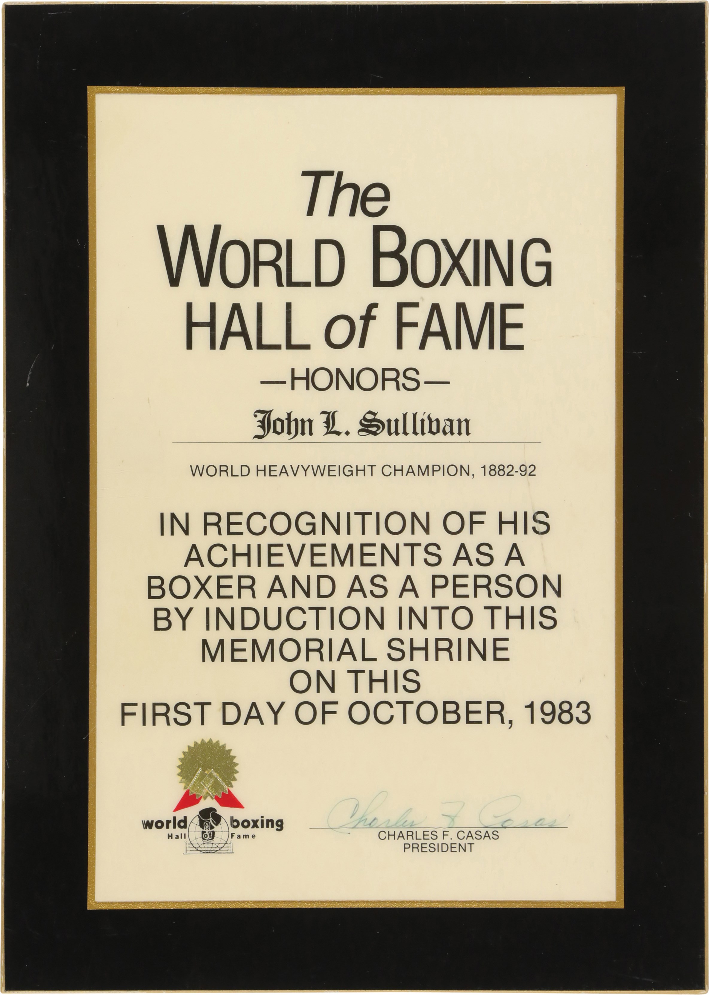 Presented is a World Boxing Hall of Fame plaque that honors the first heavyweight champion of gloved boxing, John L. Sullivan. The wooden plaque is 11x15.5" and is signed by Charles F. Casas, President of the World Boxing Hall of Fame. "The World Boxing Hall of Fame honors John L. Sullivan, World Heavyweight Champion, 1882-92," reads the plaque. He was inducted into the Hall of Fame on the, "First day of October, 1983." The plaque is painted black with gold trim. The front of the plaque is coated in a glossy finish.