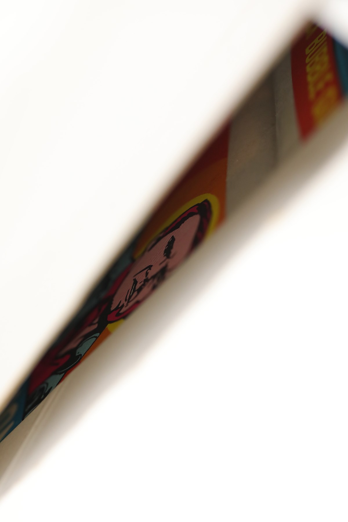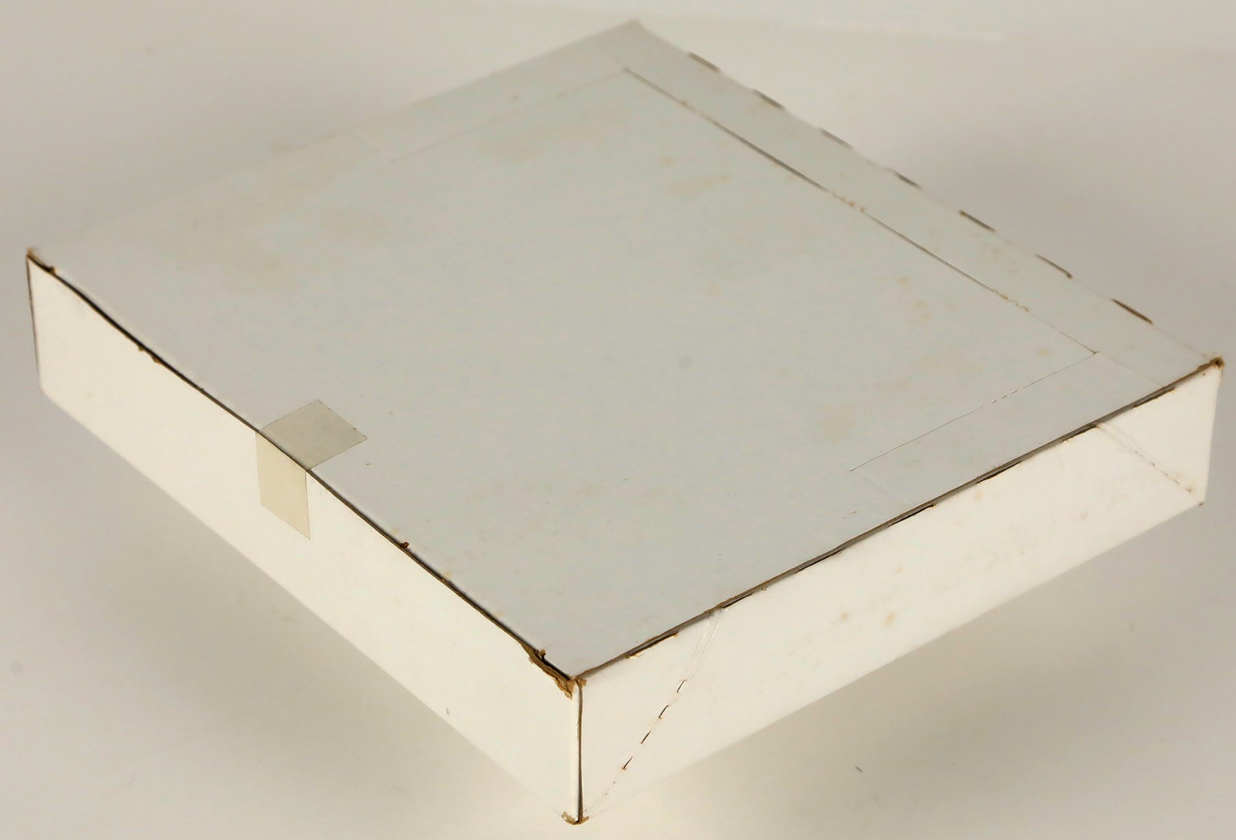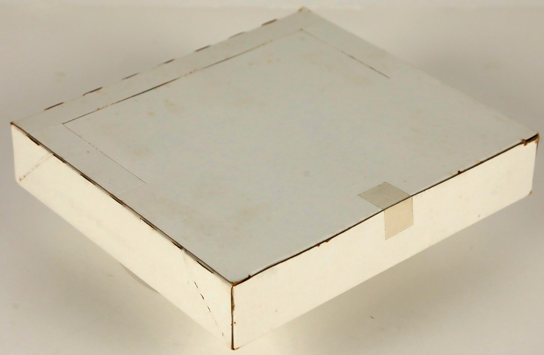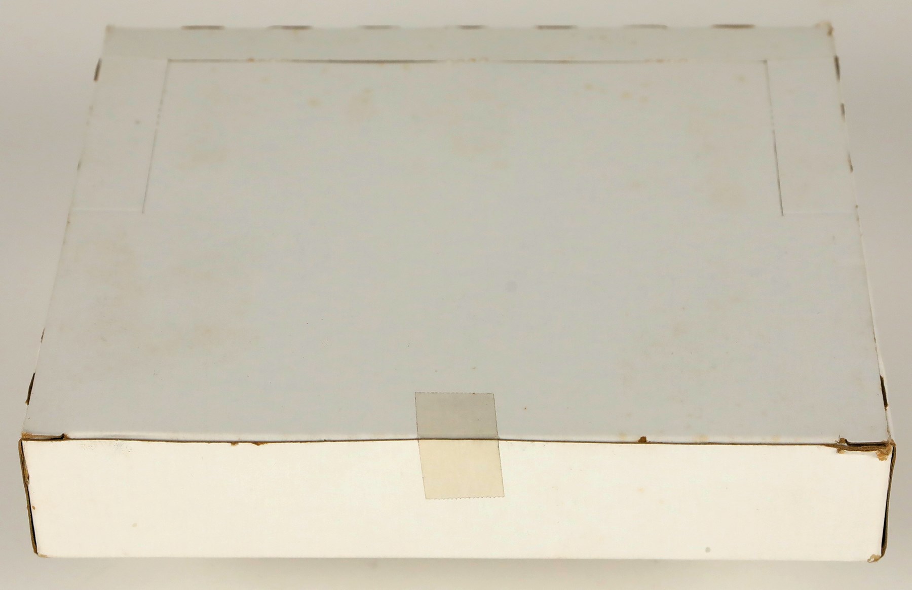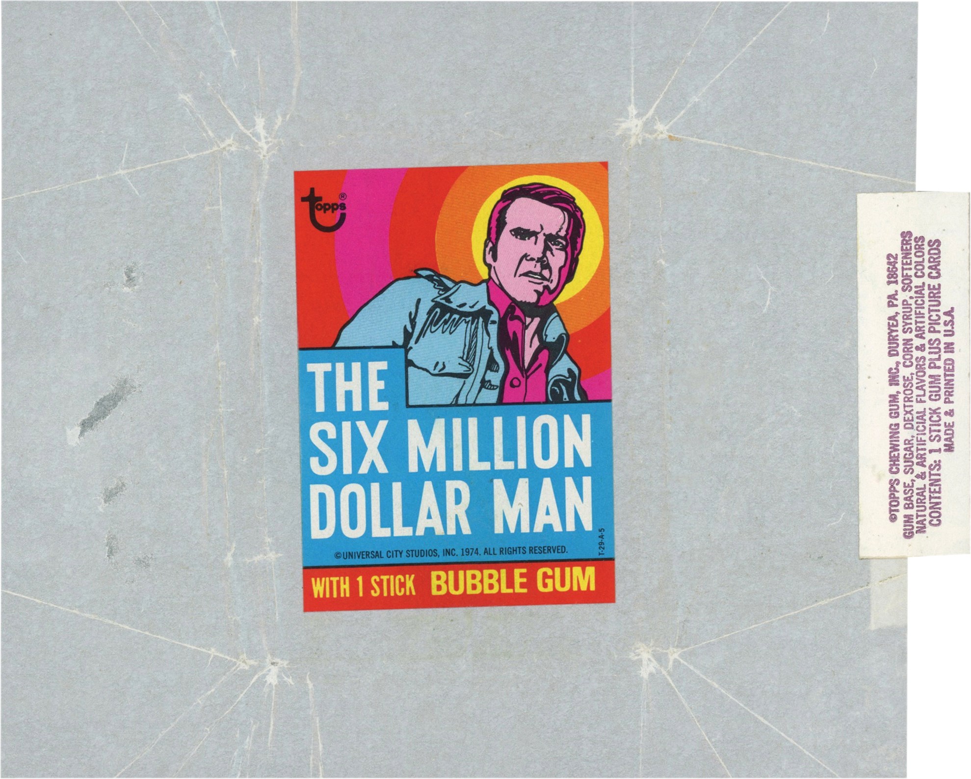 1974 Topps Six Million Dollar Man 24-count unopened test wax box obtained from the Topps Vault. The box is completely white and is sealed with a strip of tape on the box front as acquired from Topps. The top die cut is unpunched. When peeking into the box, two rows of three packs each can be seen making us believe that 24 packs in total are inside. The box exhibits light corner and shelf wear overall. There is a light penciled t2919 in a corner of the box bottom. It comes with a wrapper. Cards are assumed to be in NM or better condition.