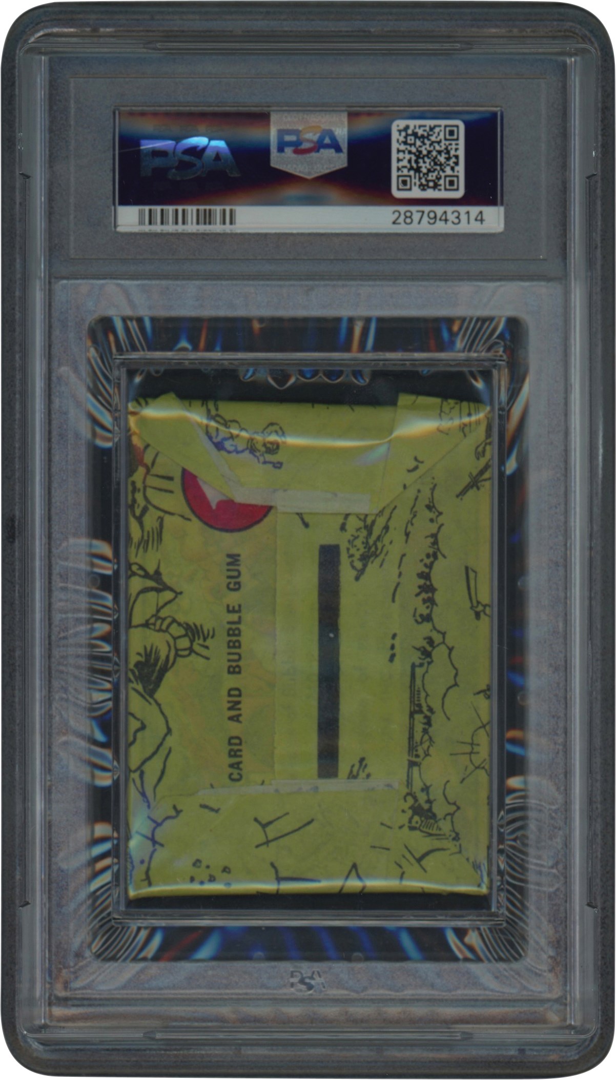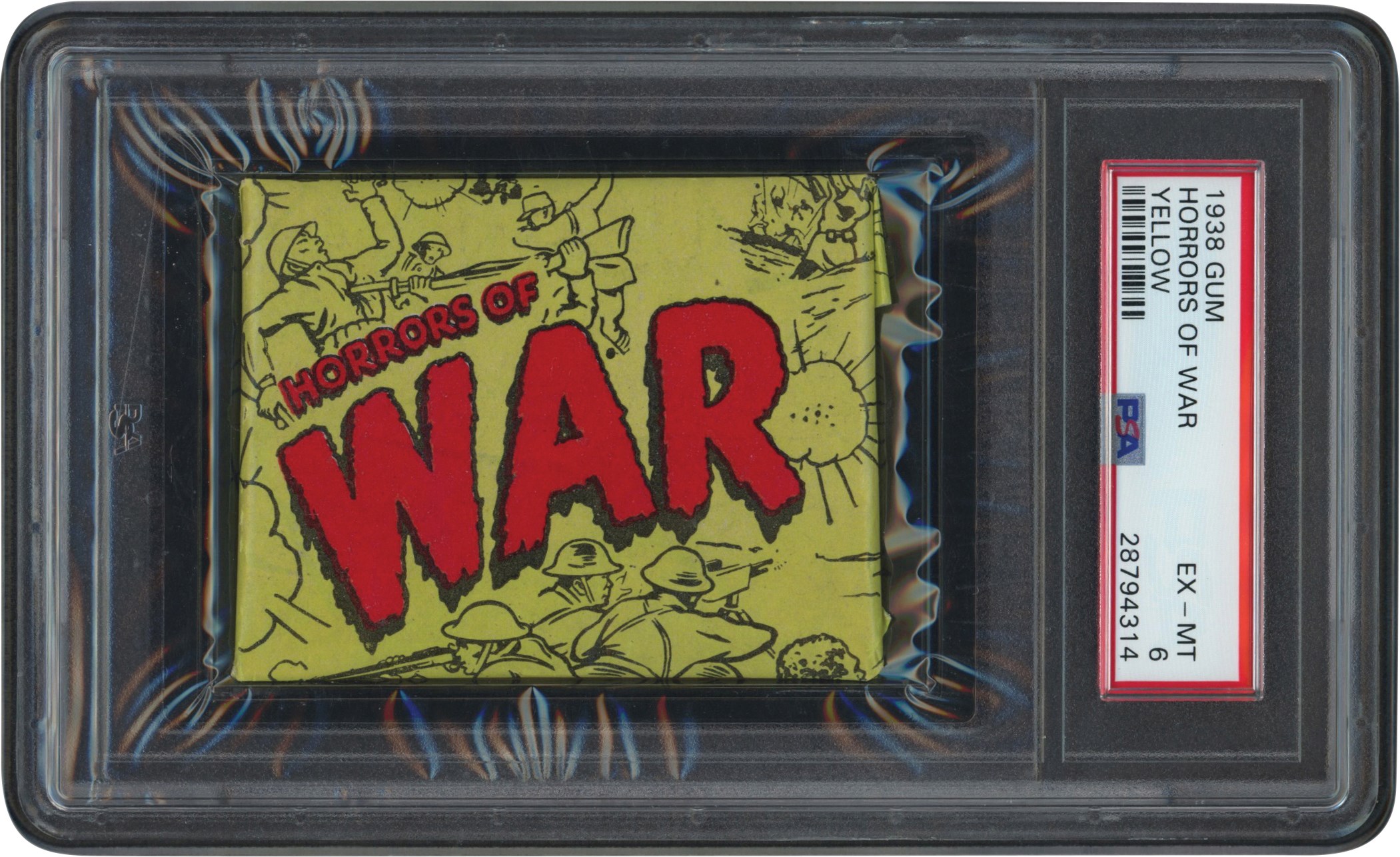 1938 Gum Inc Horrors of War Unopened Wax Pack. The pack has been graded and encapsulated by PSA EX-MT 6. The pack has a deep red Horrors of War across a green-yellow background with cartoonish war scenes. The reverse appears securely sealed with one flap having both flap sides upturned.