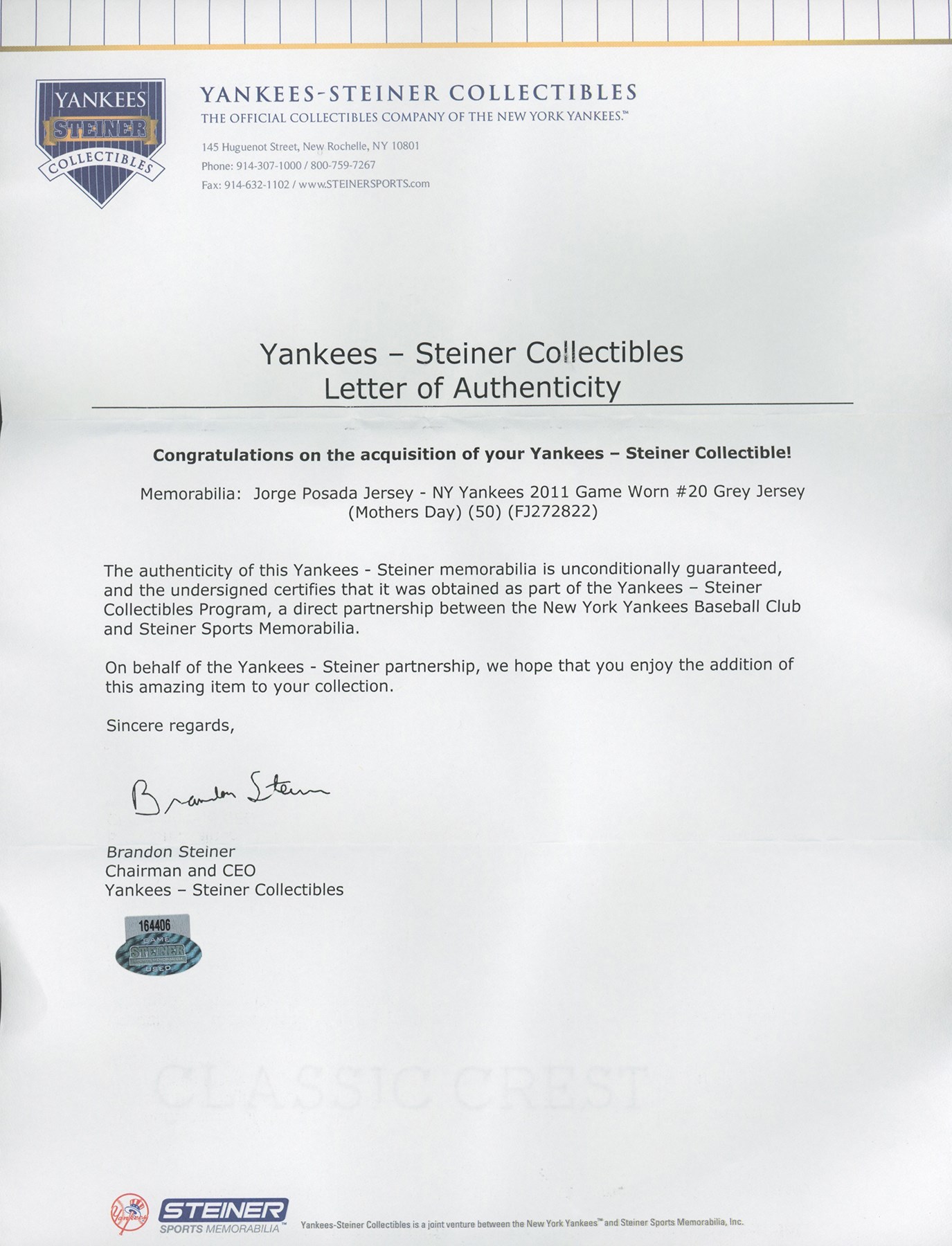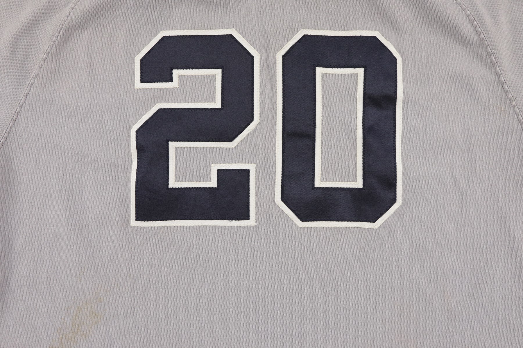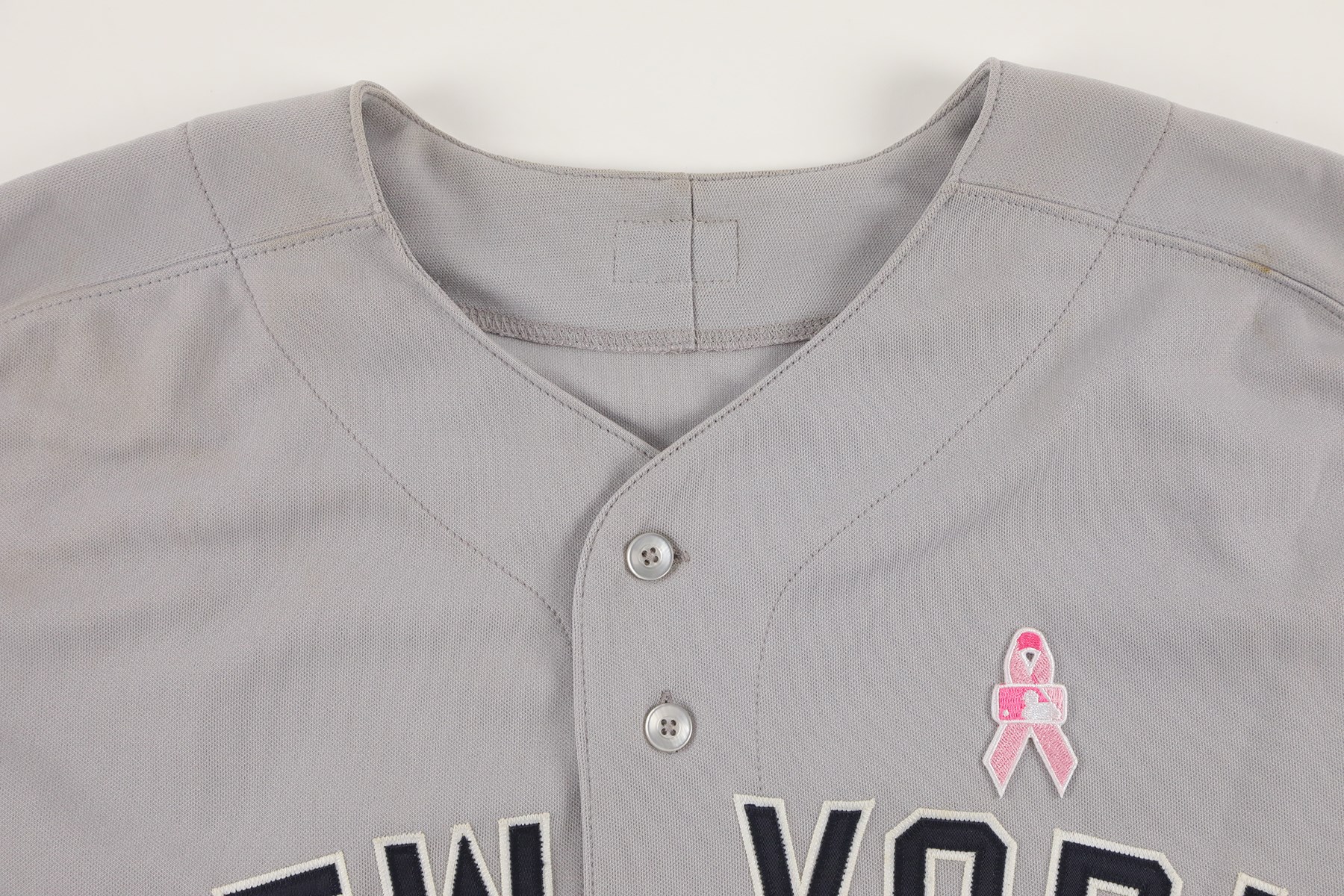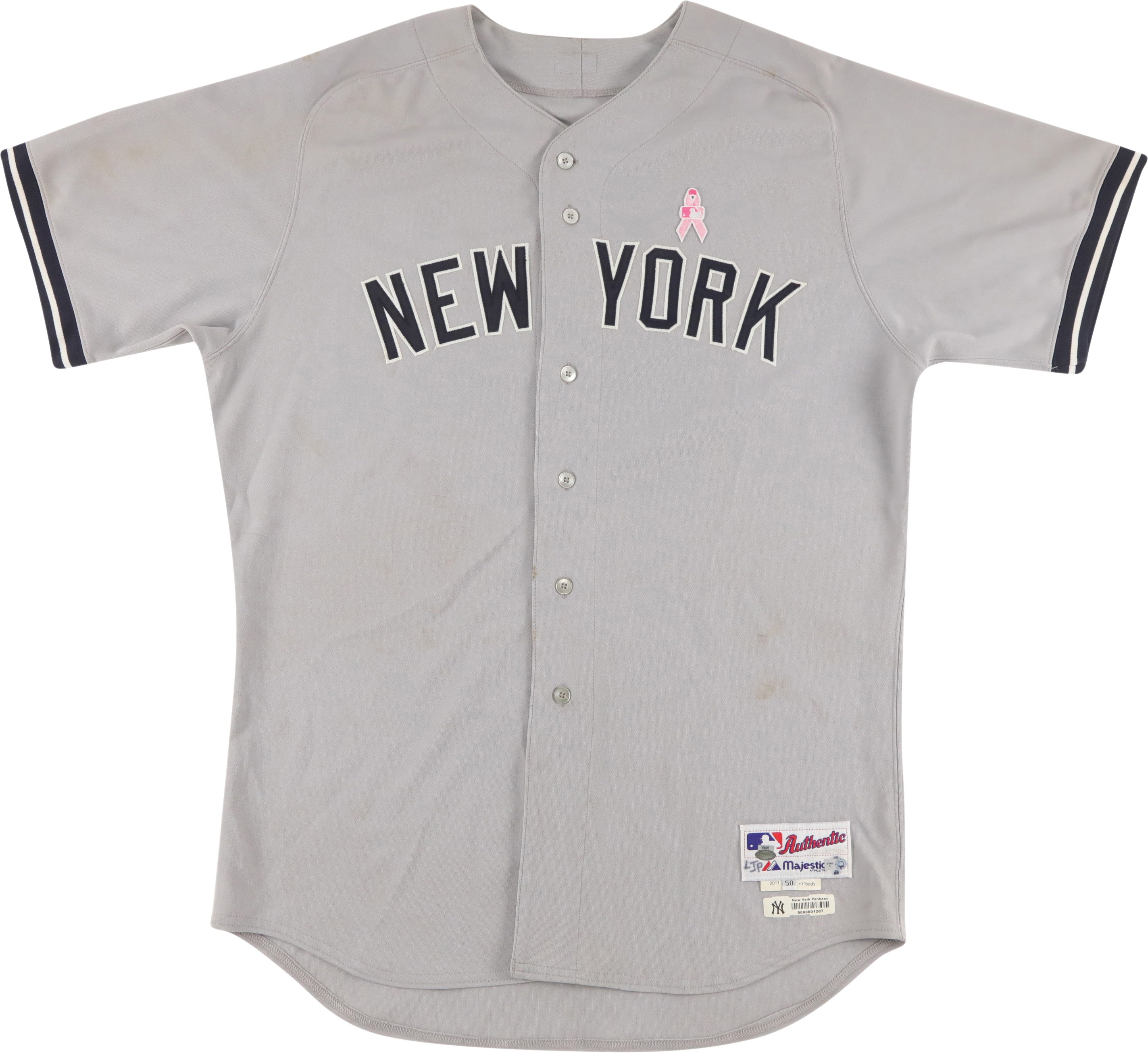 2011 Jorge Posada New York Yankees Mother's Day game worn road jersey. Posada wore this jersey on May 8, 2011, in a game vs. the Texas Rangers. An MLB Authentic Collection patch is sewn to the front left tail of the jersey. Attached to the patch are three small tags. They read, "2011," "50," and "+1"body." A Steiner Sports and MLB Authentic hologram sticker are stuck to the MLB Authentic Collection patch. "NEW YORK" is sewn across the chest of the jersey, and a pink breast cancer awareness ribbon patch is sewn to the left chest. Number 20 is sewn to the back of the jersey. The jersey shows outstanding signs of use as there are dirt stains visible throughout. Includes a full LOA from Steiner Sports.