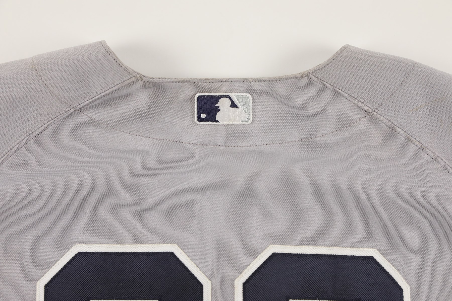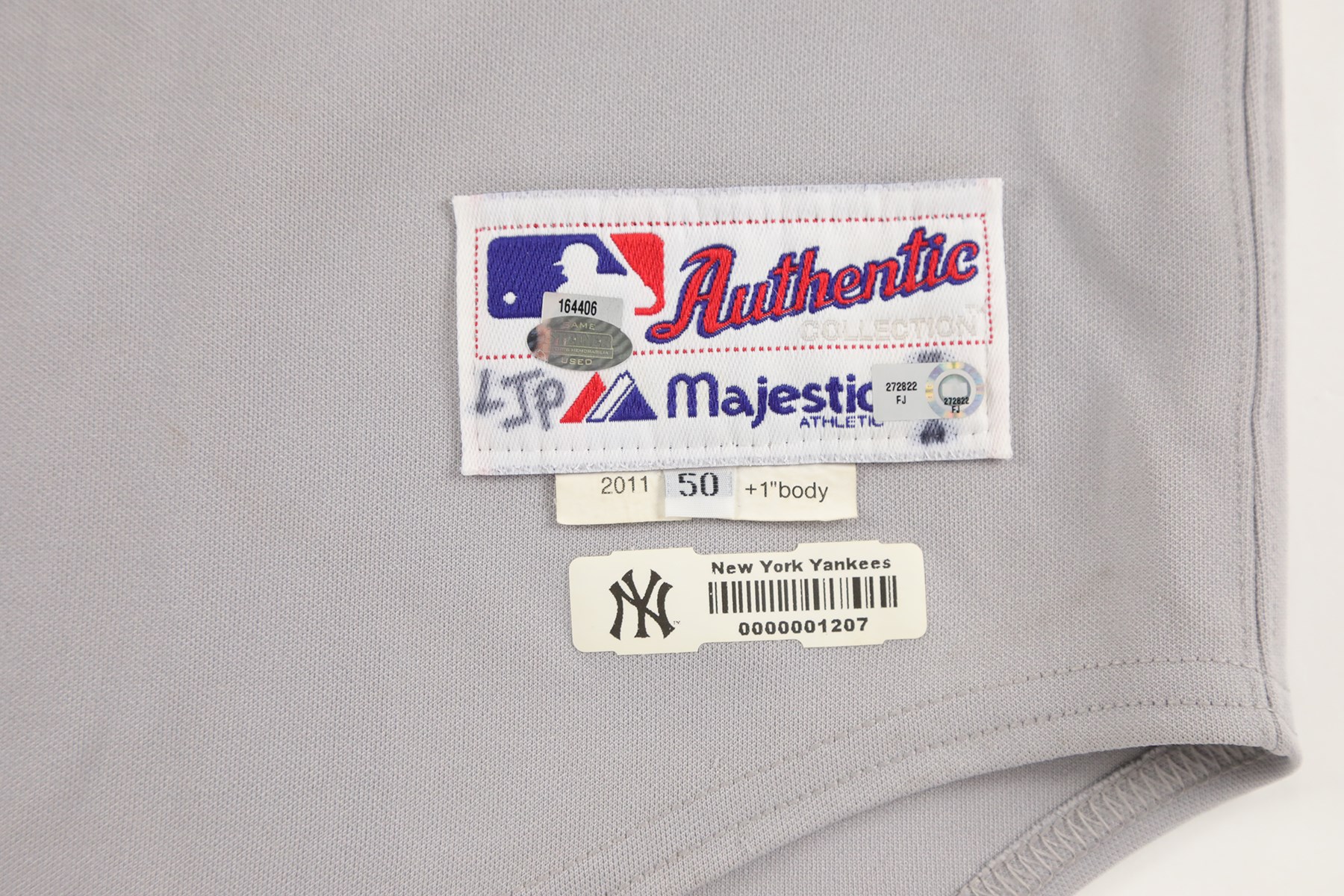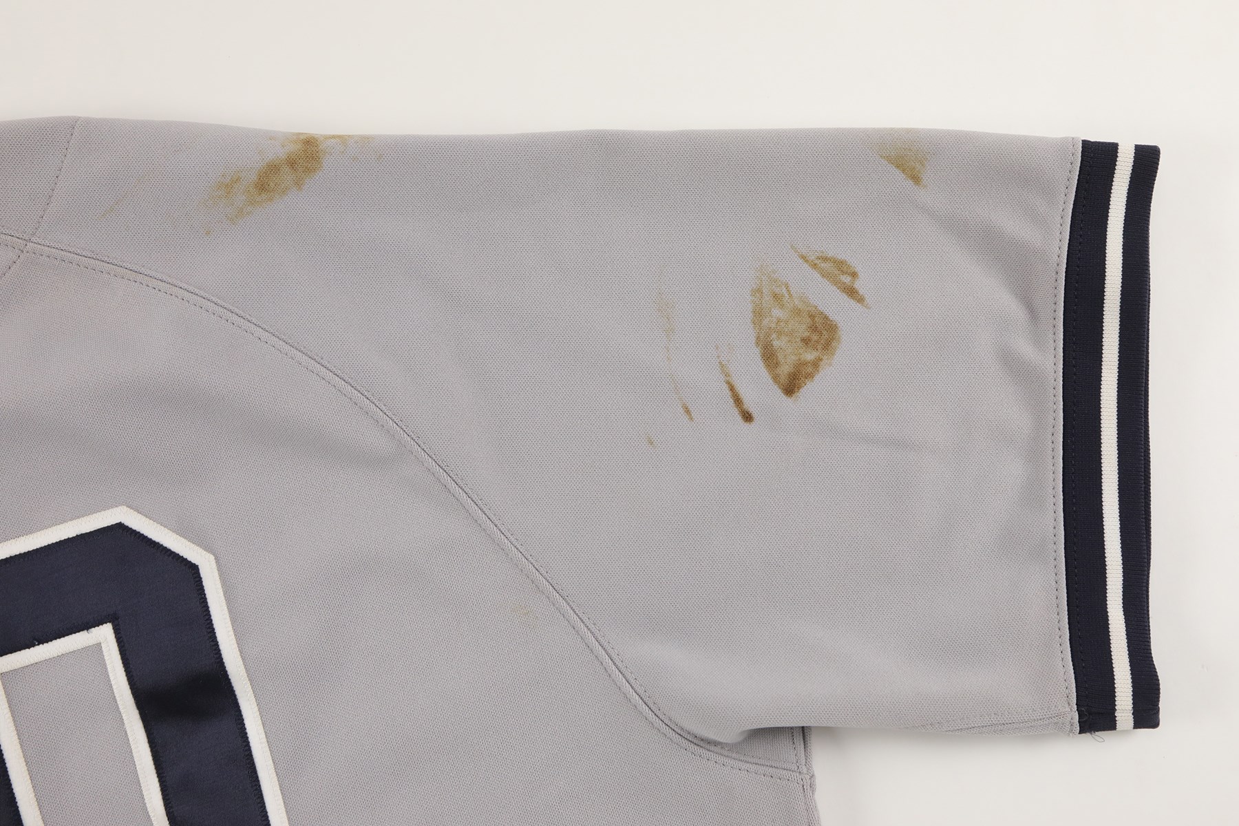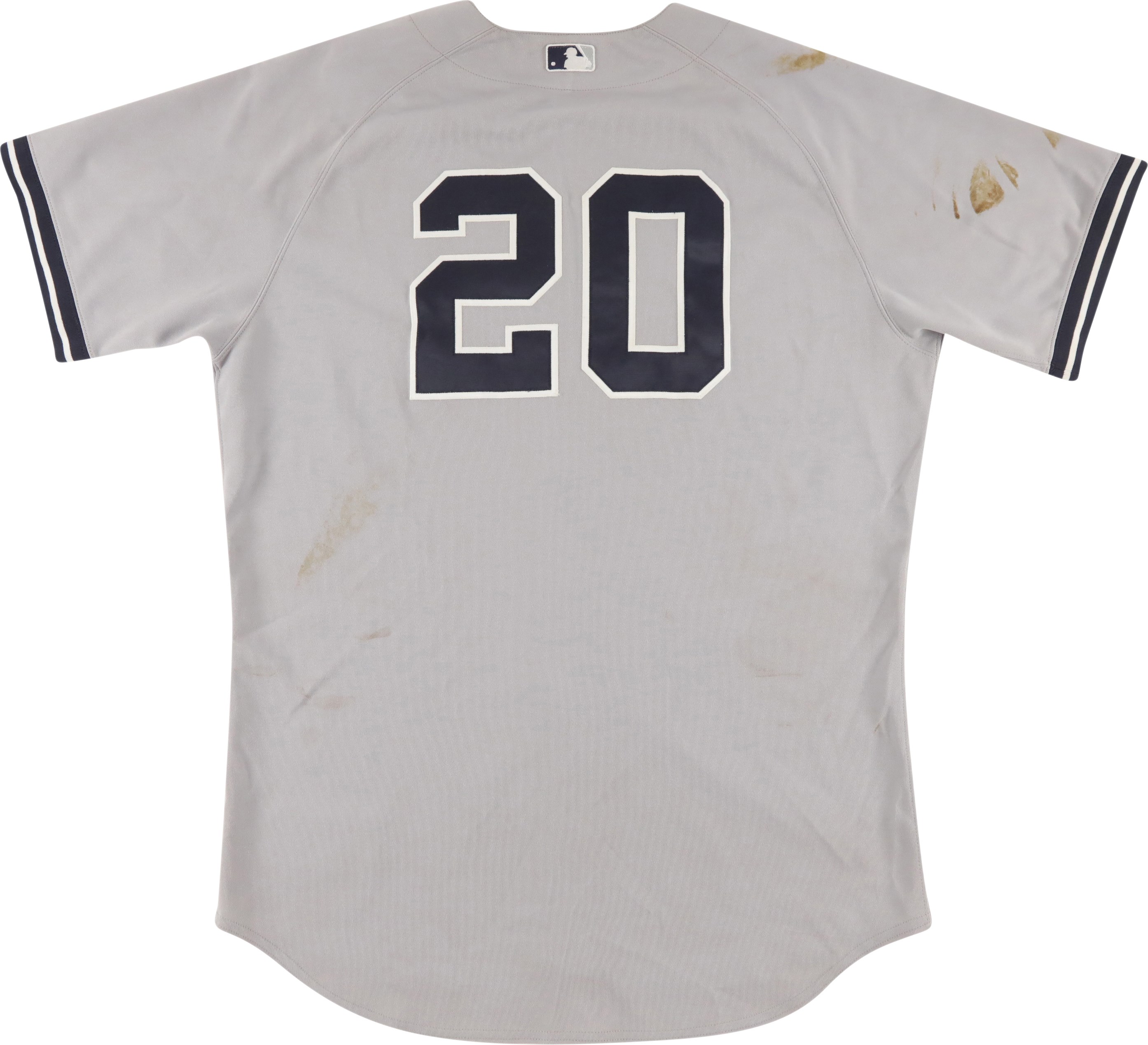 2011 Jorge Posada New York Yankees Mother's Day game worn road jersey. Posada wore this jersey on May 8, 2011, in a game vs. the Texas Rangers. An MLB Authentic Collection patch is sewn to the front left tail of the jersey. Attached to the patch are three small tags. They read, "2011," "50," and "+1"body." A Steiner Sports and MLB Authentic hologram sticker are stuck to the MLB Authentic Collection patch. "NEW YORK" is sewn across the chest of the jersey, and a pink breast cancer awareness ribbon patch is sewn to the left chest. Number 20 is sewn to the back of the jersey. The jersey shows outstanding signs of use as there are dirt stains visible throughout. Includes a full LOA from Steiner Sports.
