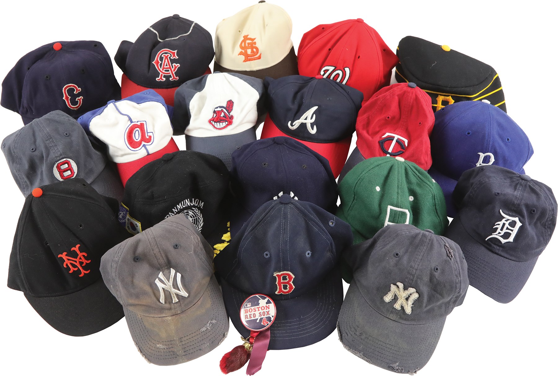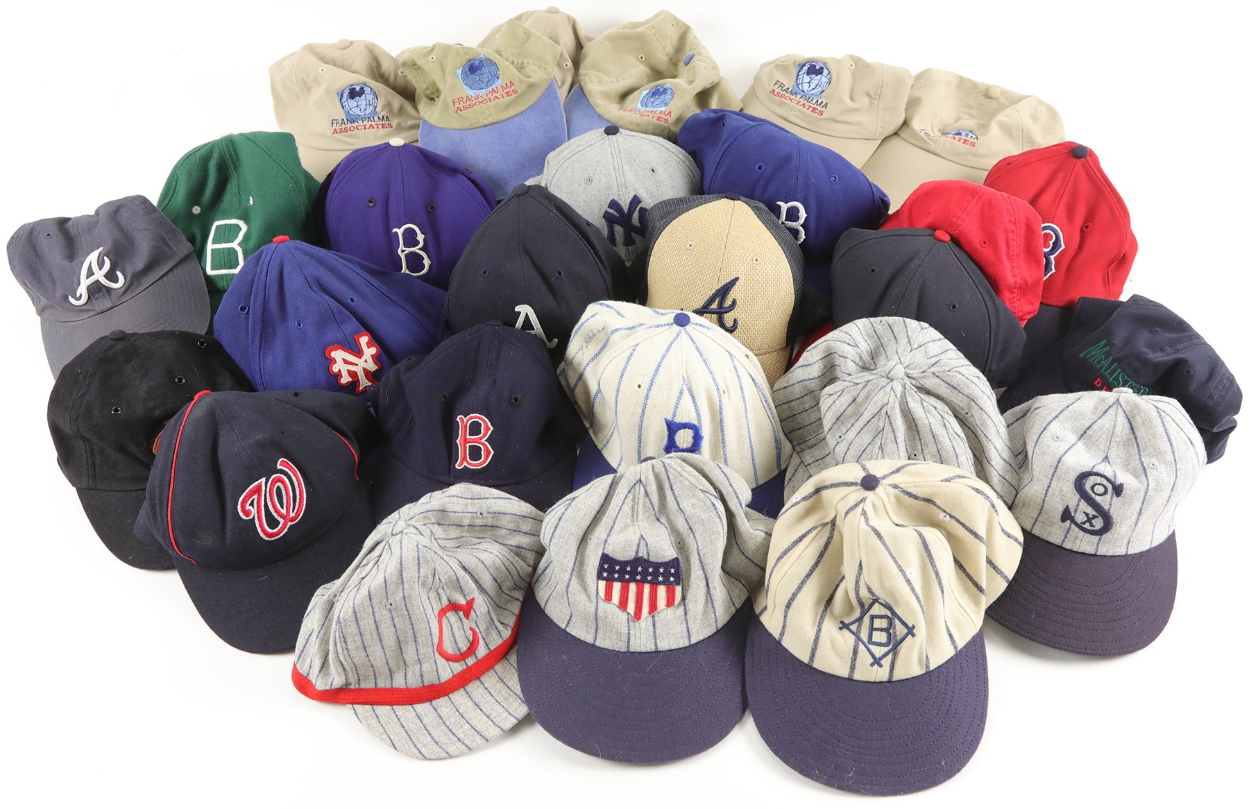 Included in this lot are the following hats: Detroit Tigers adjustable, Washington Nationals (Roman Pro) size 7 1/2 and 7 3/8, Boston Red Sox (Roman Pro), California Angels (Roman Pro) size 7 3/8, Boston Red Sox (KM Pro Cap) size 7 1/8, Cleveland Indians (KM Pro Cap) size 7 1/8, Boston Red Sox adjustable, New York Giants (Cosby) size 7 1/4, New York Yankees adjustable (2), New York Yankees (New Era) size 7 1/4, Panmunjom (military hat), 1970s Atlanta Braves (Cooperstown Collection) size XL, Cleveland Indians Chief Wahoo logo adjustable, Ted Williams number 8 (Fenway Collection) adjustable, Atlanta Braves (Nike), adjustable, Minnesota Twins adjustable, Brooklyn Dodgers (2) size 7 3/8, and more. The hats have been previously worn and are in used condition.