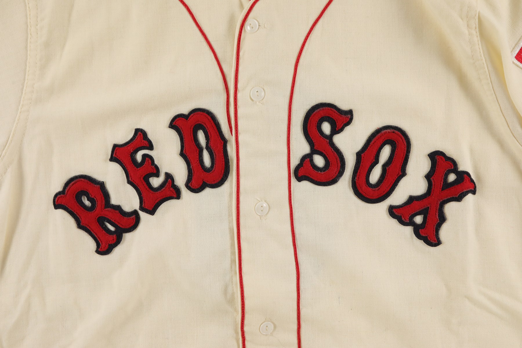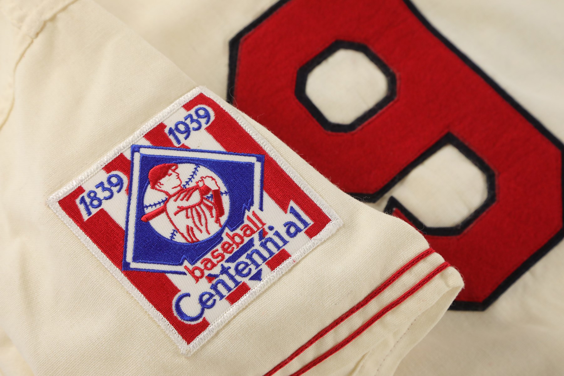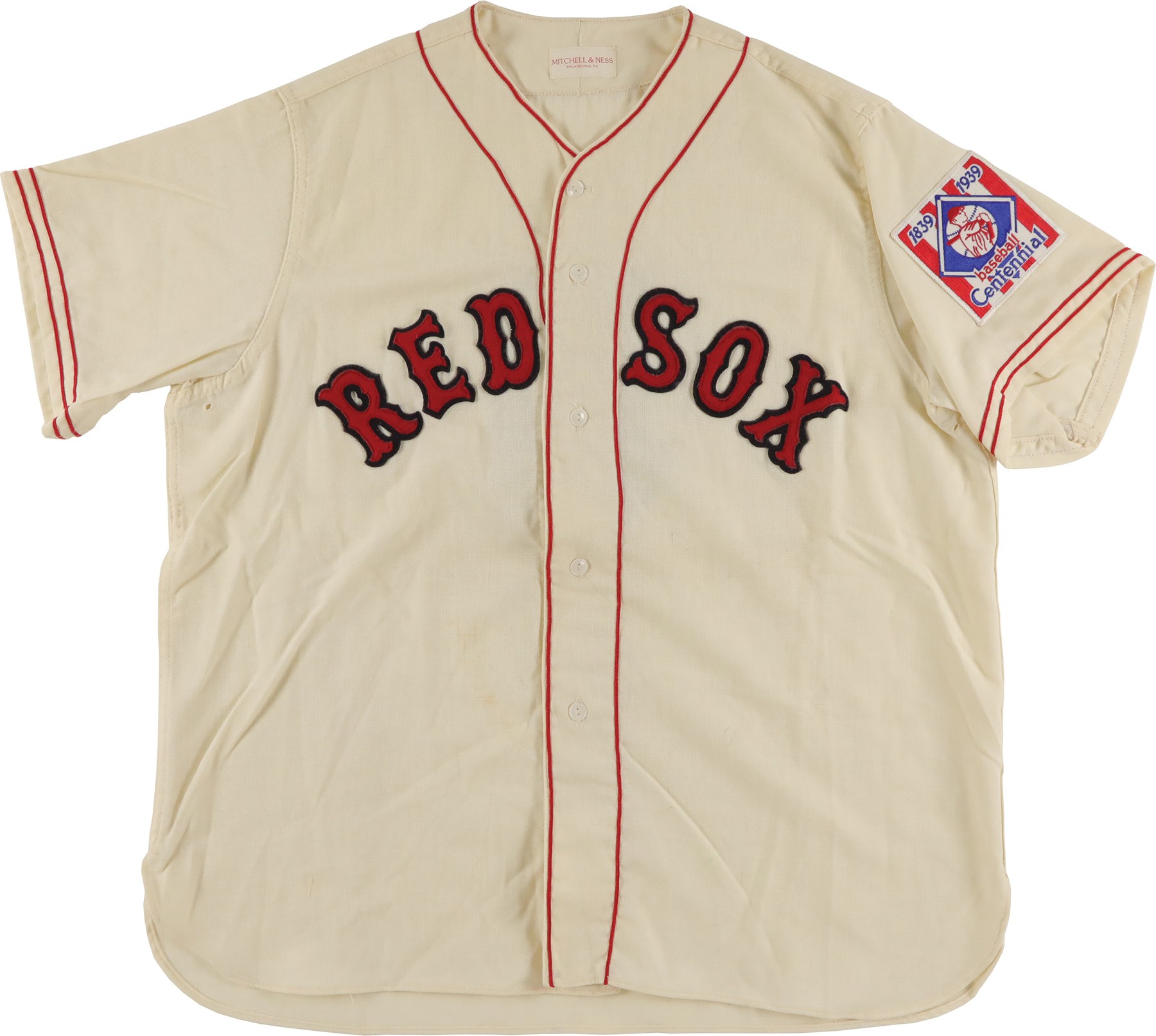 Vintage-appearing white Boston Red Sox Ted Williams Mitchell & Ness jersey is simply decorated with red binding, "Baseball Centennial" patch on the left shoulder and reads "Red Sox" across the front with the famous number "9" on the back. Mitchell & Ness tag in the collar. A few light stains noticed.