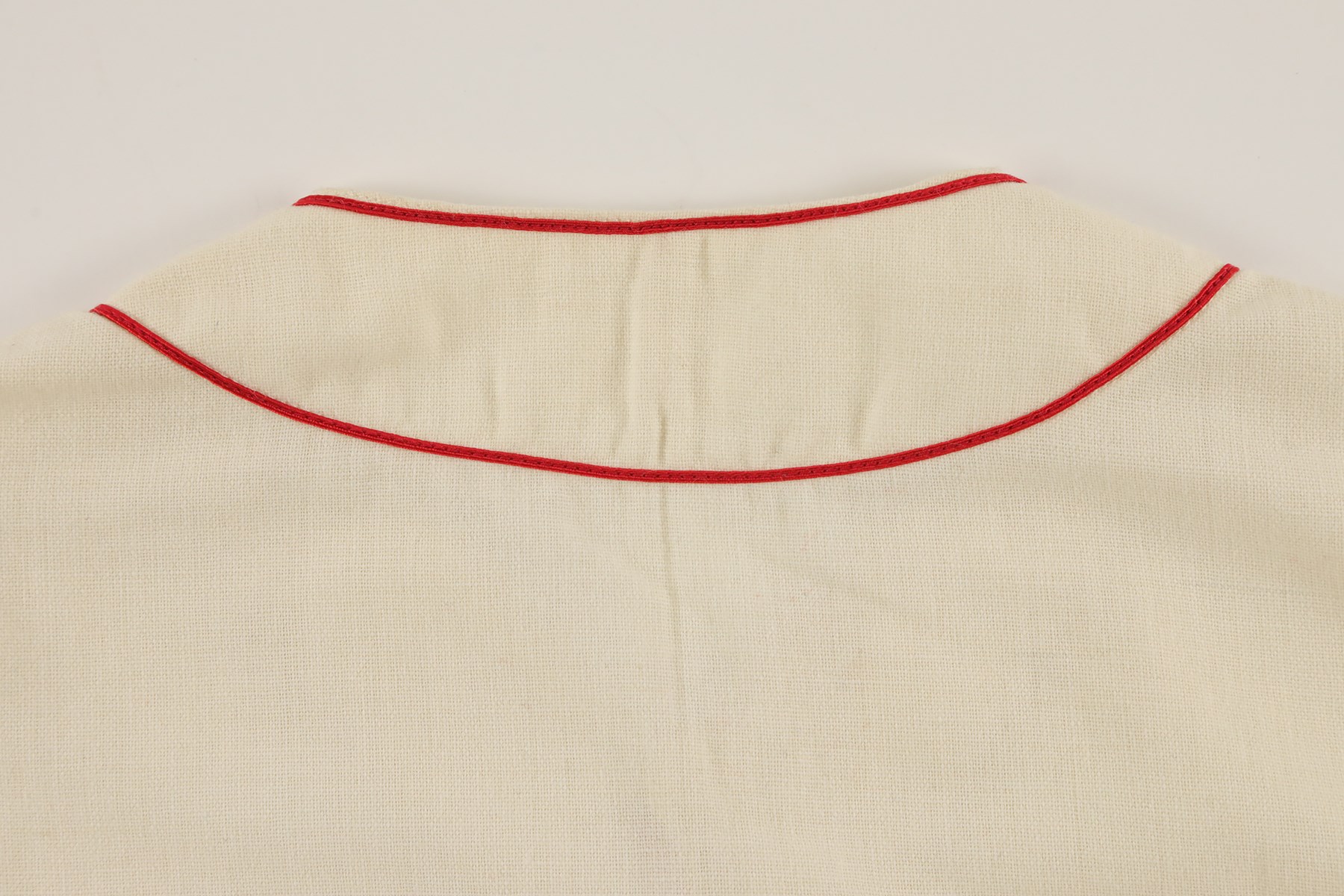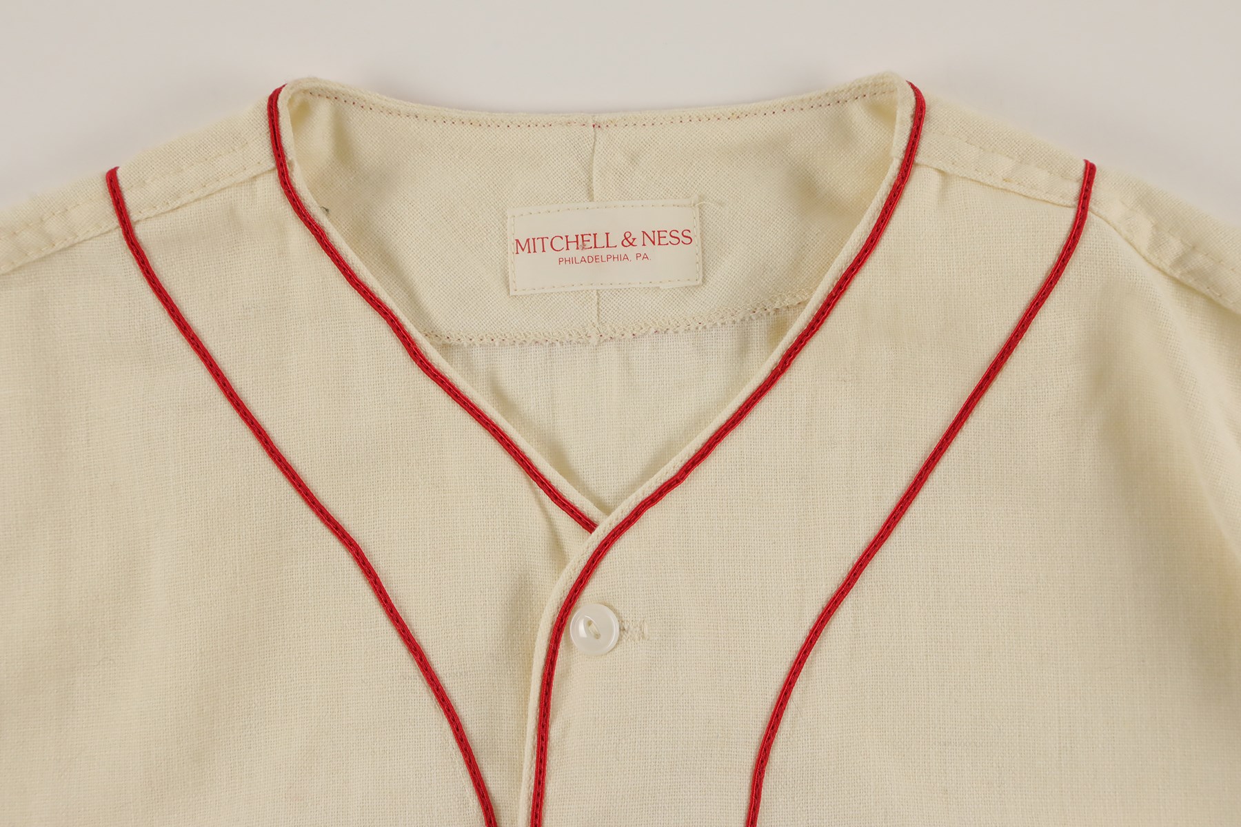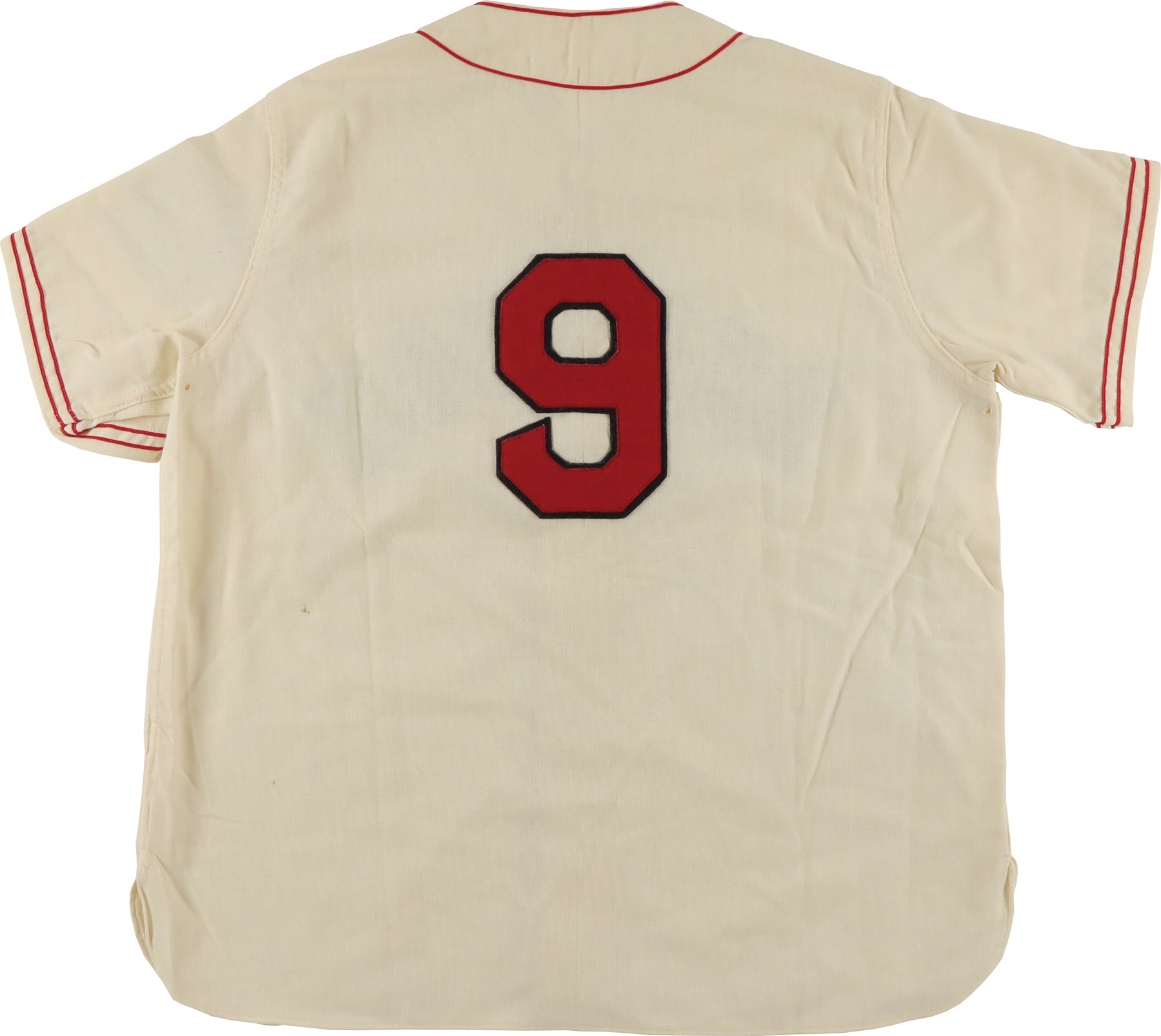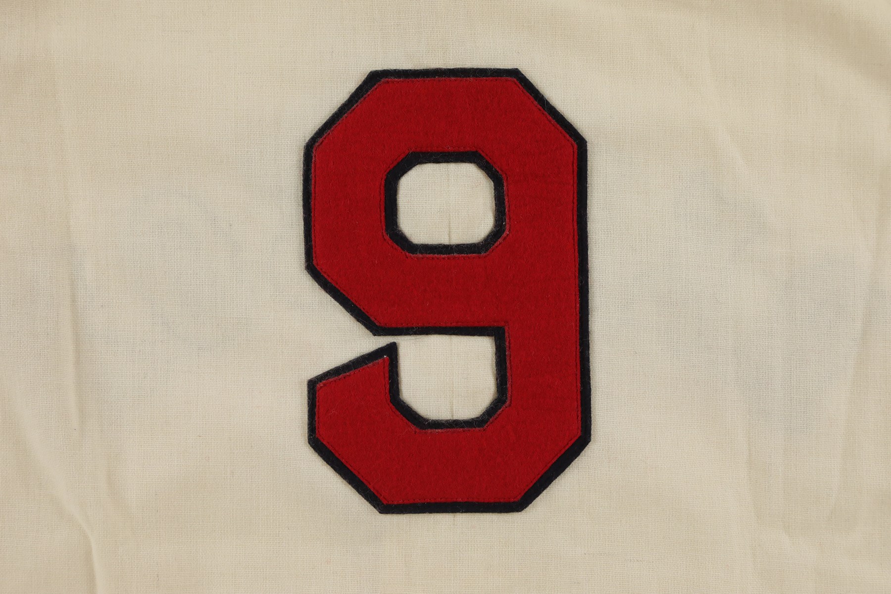 Vintage-appearing white Boston Red Sox Ted Williams Mitchell & Ness jersey is simply decorated with red binding, "Baseball Centennial" patch on the left shoulder and reads "Red Sox" across the front with the famous number "9" on the back. Mitchell & Ness tag in the collar. A few light stains noticed.
