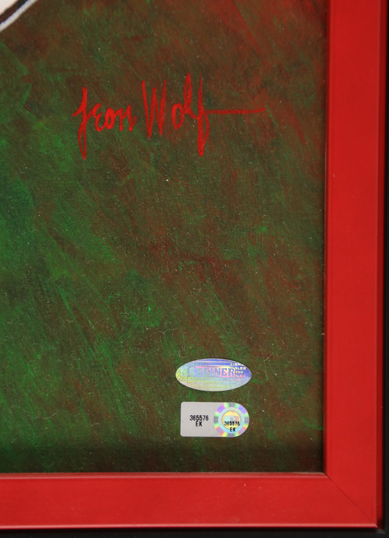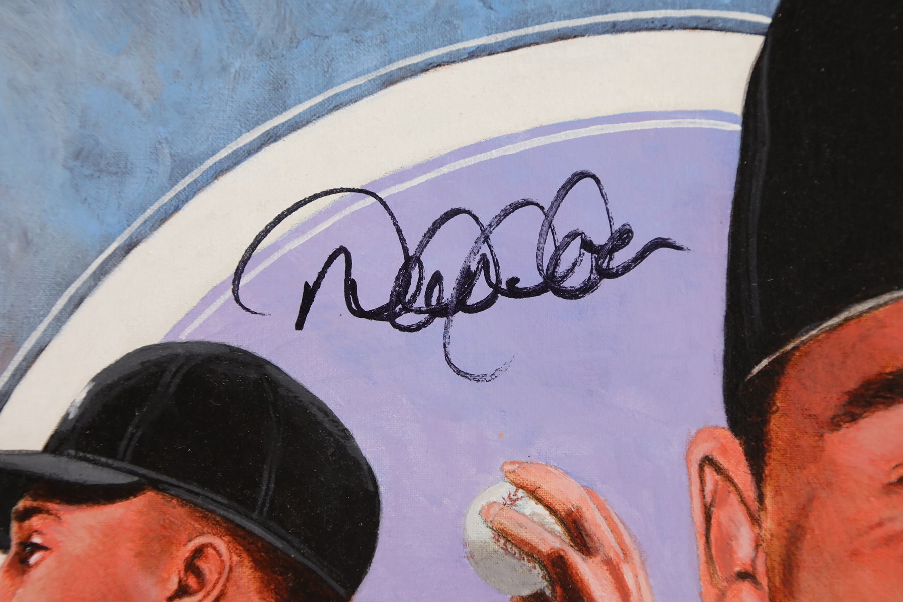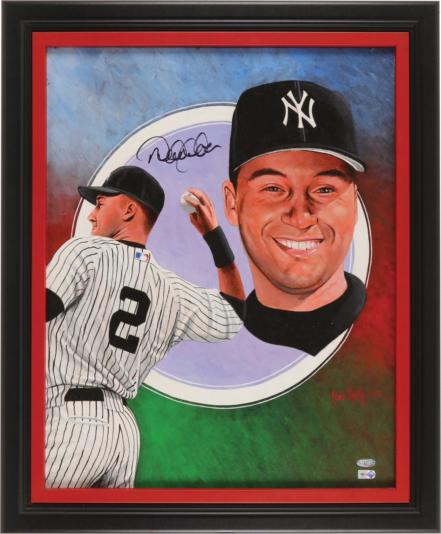 Beautiful oil-on-canvas painting depicts Derek Jeter in magnificent form. The Captain is depicted with his trademark grin next to a shot of him "in action" with his retired number 2 front-and-center. In this one-of-a-kind classic, Jeter's distinctive signature in black Sharpie is nestled between the two images in 8/10 form, and it's signed on the bottom left side by artist Leon Wolf. As he smiled down on Yankee Stadium for two decades, now the Hall of Famer can grace whatever room you choose in this splendidly-detailed piece. Measures 17x21" and is actually double-framed, with a red inner frame surrounded by a black one, with the entire piece measuring to 20x24". Comes with both a Steiner Sports and MLB Hologram label (#365576 EK) for the signature, each of which is affixed to the front. According to the MLB database, Jeter signed this piece on May 3, 2013, in the presence of an MLB representative.