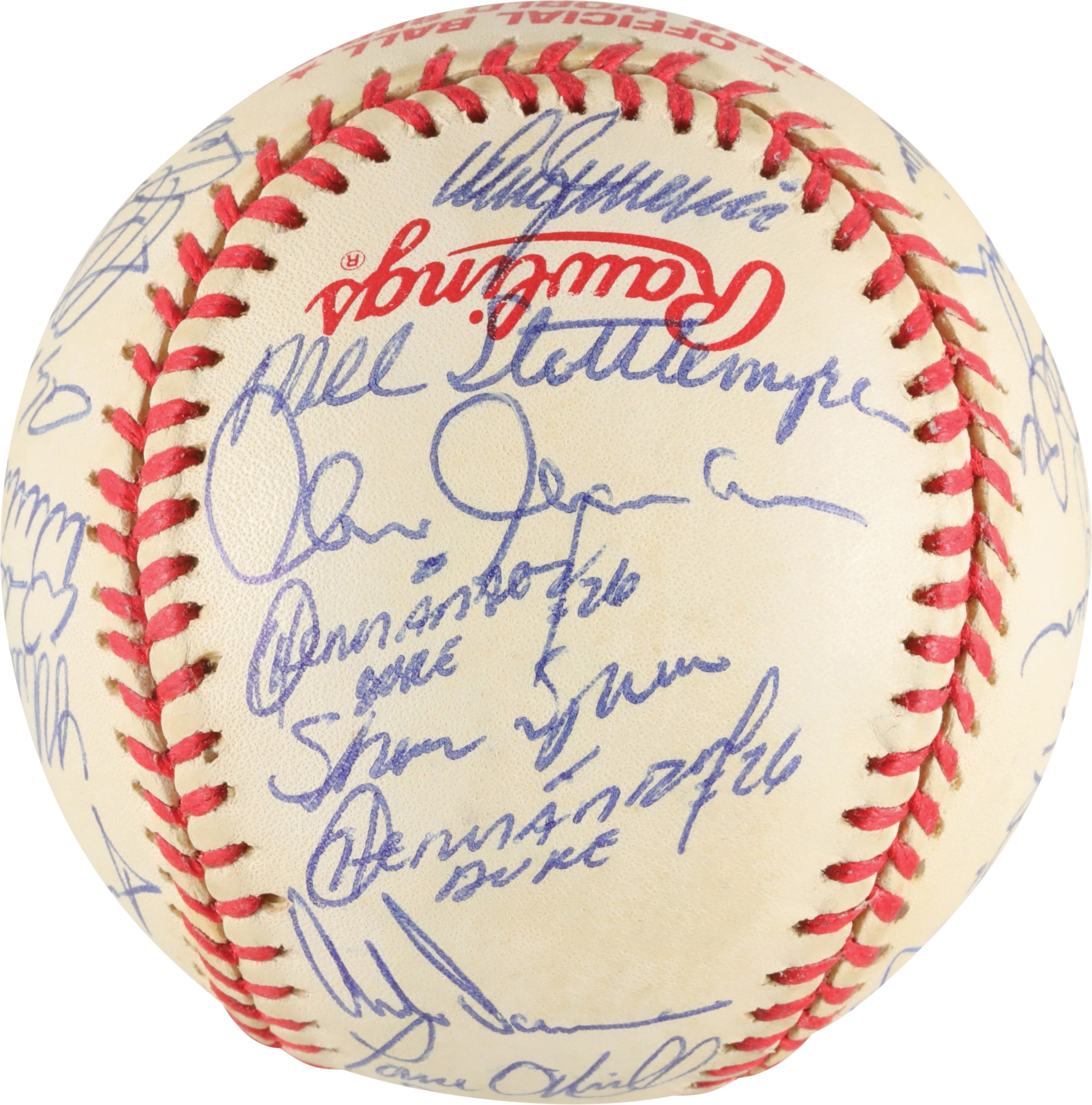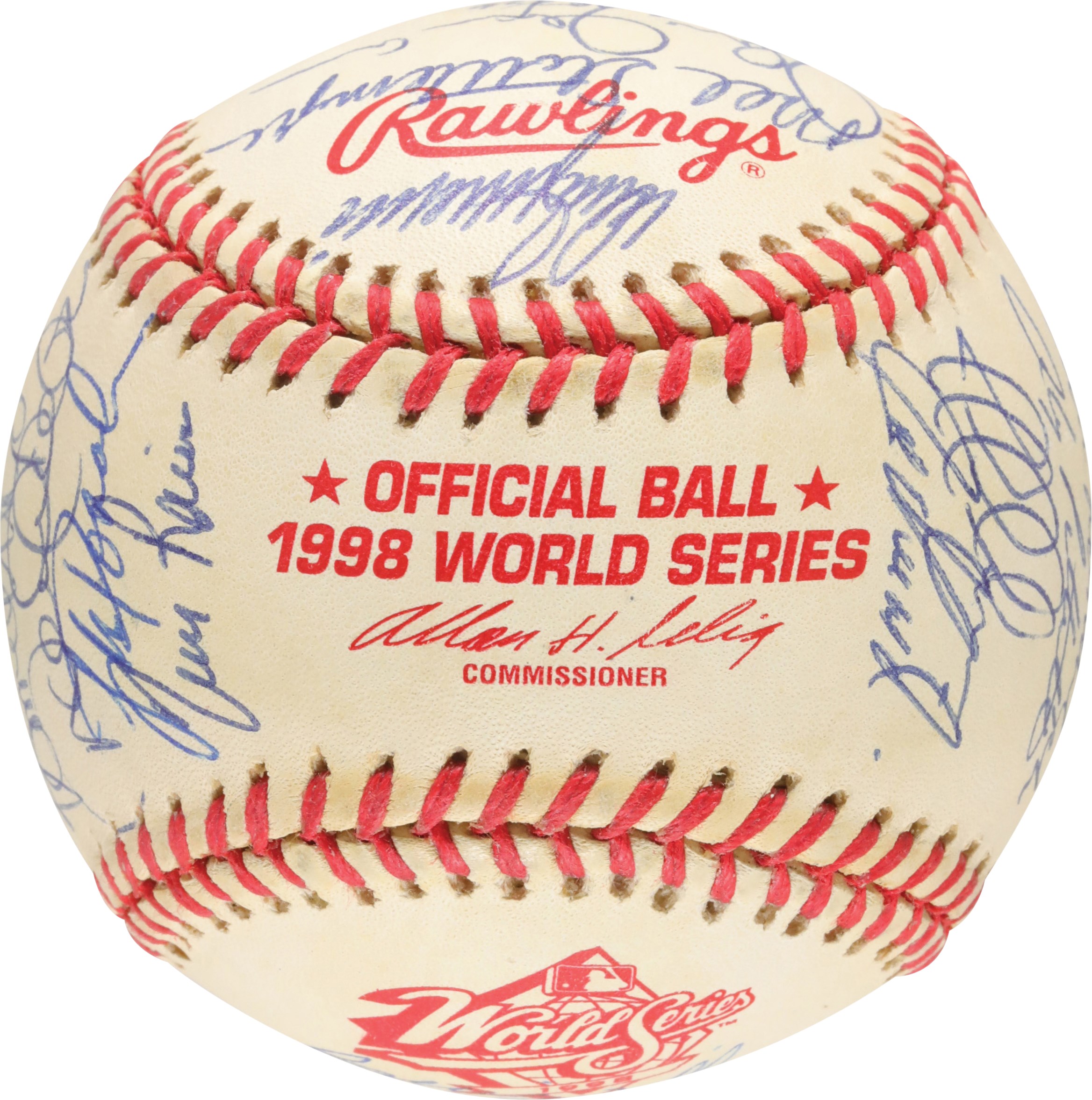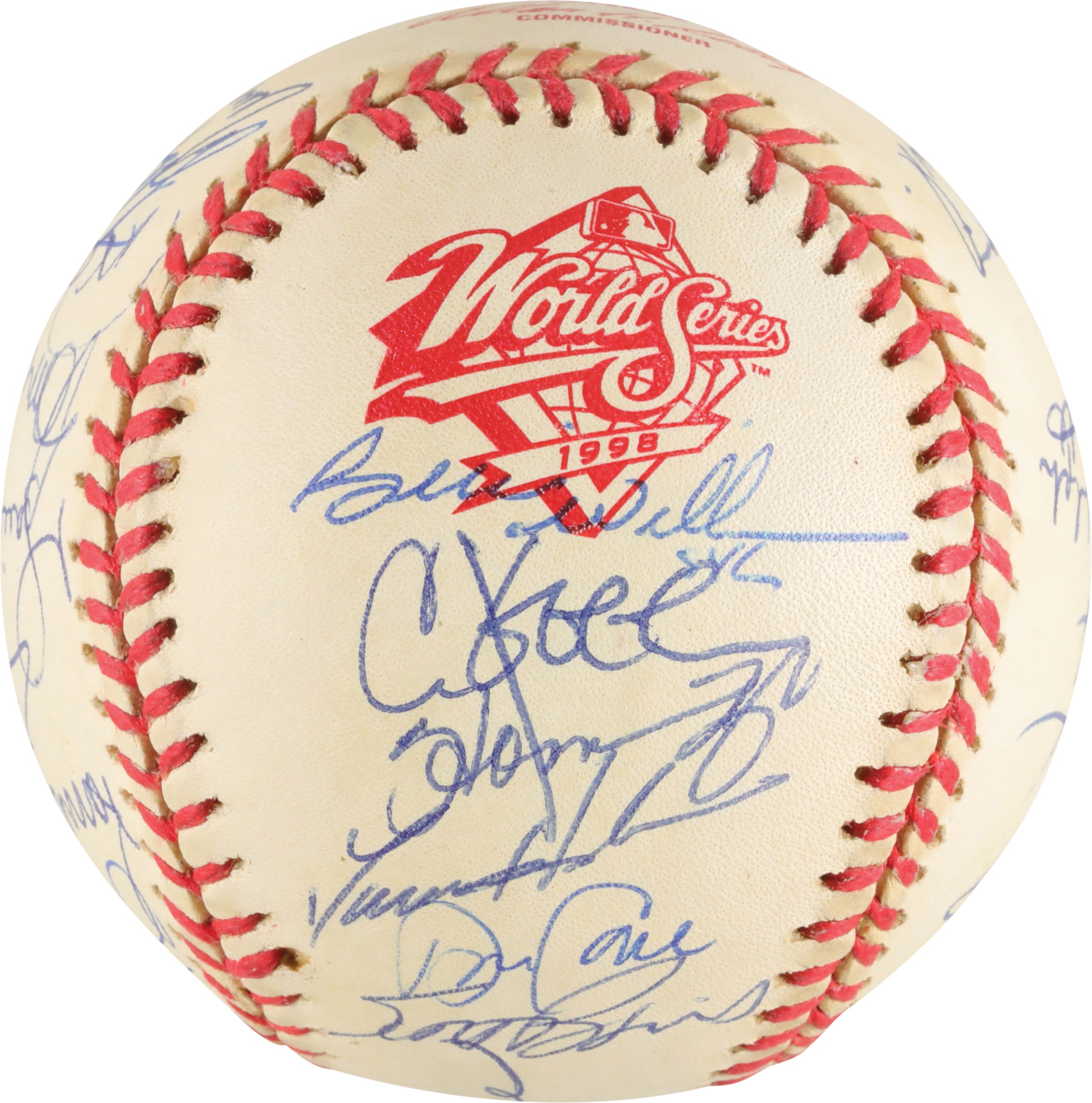 Official 1998 World Series baseball signed in blue ink by thirty-one members of the 1998 World Champion New York Yankees, including Jeter, Torre (Mgr., sweet spot), Rivera, Raines, Pettitte, Wells, Stanton, Hernandez (twice), Spencer, O'Neill, Williams, Knoblauch, Cone, Brosius, Nelson, Randolph (coach), Chambliss (coach), Stottlemyre (coach), Nelson, Cardenal (coach), Zimmer (coach), and Girardi. The signatures average 9/10. Near Mint to Mint condition. Full LOA from PSA.