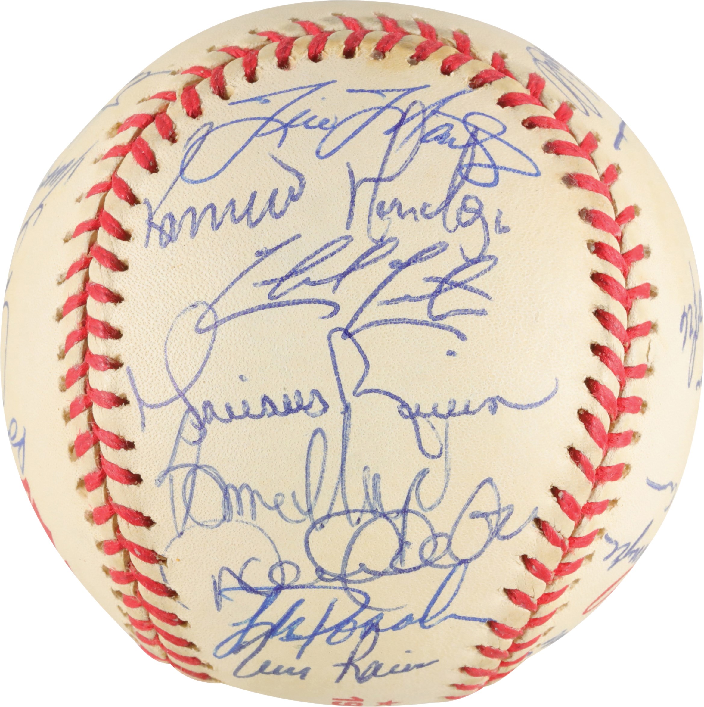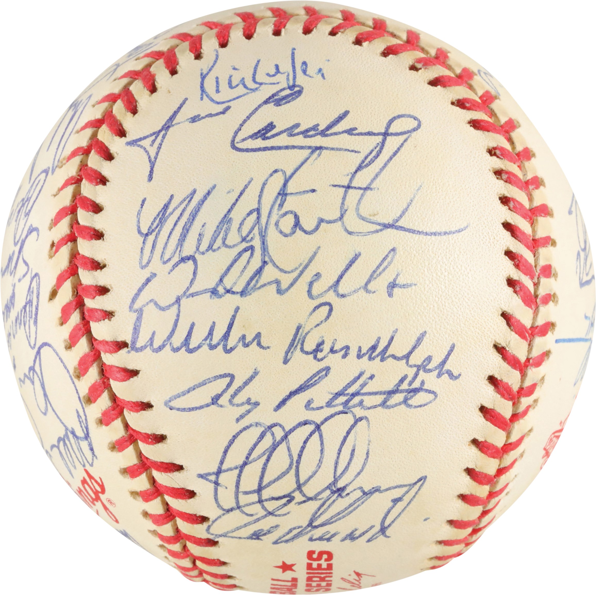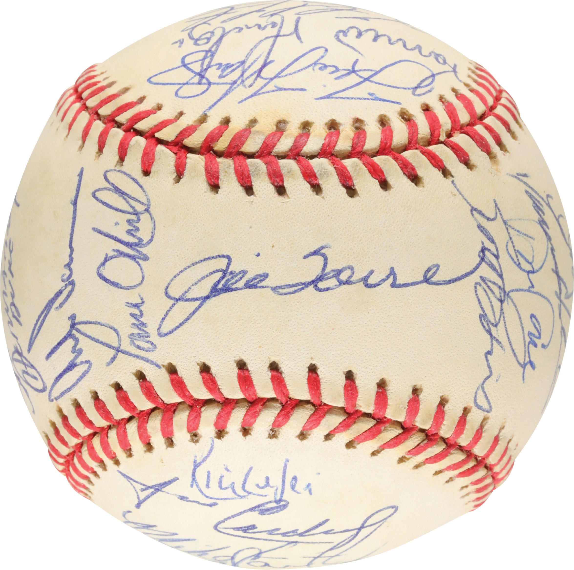 Official 1998 World Series baseball signed in blue ink by thirty-one members of the 1998 World Champion New York Yankees, including Jeter, Torre (Mgr., sweet spot), Rivera, Raines, Pettitte, Wells, Stanton, Hernandez (twice), Spencer, O'Neill, Williams, Knoblauch, Cone, Brosius, Nelson, Randolph (coach), Chambliss (coach), Stottlemyre (coach), Nelson, Cardenal (coach), Zimmer (coach), and Girardi. The signatures average 9/10. Near Mint to Mint condition. Full LOA from PSA.