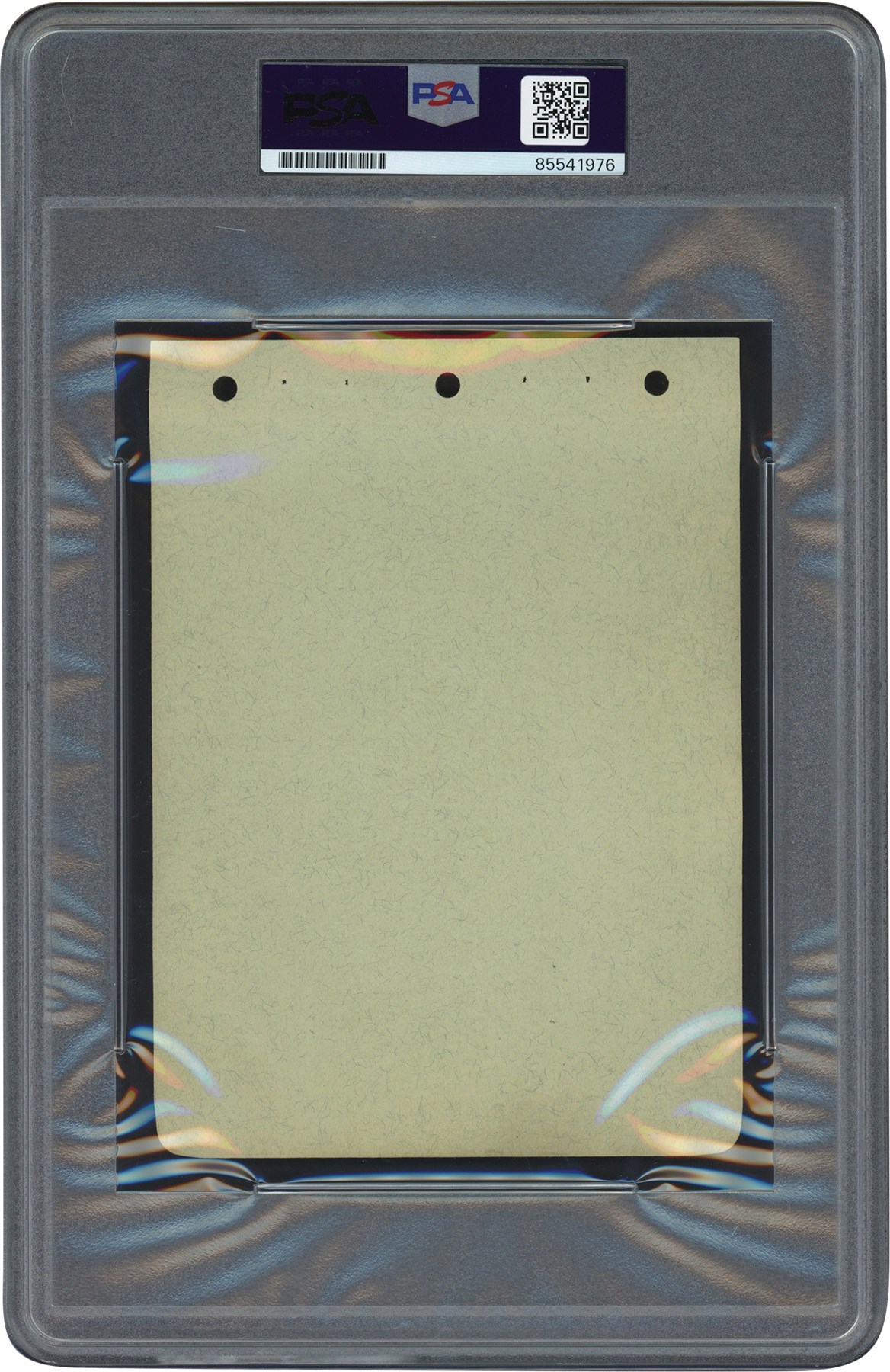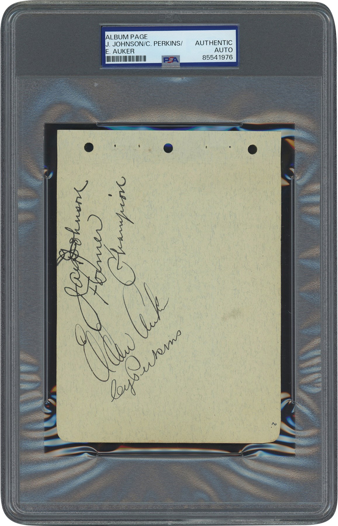 The autograph page measures approx. 4.3x6". Seven small holes are on the page so that it may be held in a spiral autograph album. Using blank, fountain ink, Johnson signed the album page in neat, bold script, as usual attaching the end of his first name to the beginning of a last name, writing on one plane, and adding his frequently used inscription "Former Champion." Also signing in black fountain ink were Auker and Perkins. The three signatures average about 8/10. The offering has been encapsulated and PSA Certified "AUTHENTIC AUTO" (85541976). The offered album page exhibits a very small "2" in black ink written by an unknown hand. The album page shows some darkening and a very small smudge, but the page is in overall very good condition. This same Lelands' Auction features other pages featuring autographs of notable athletes.