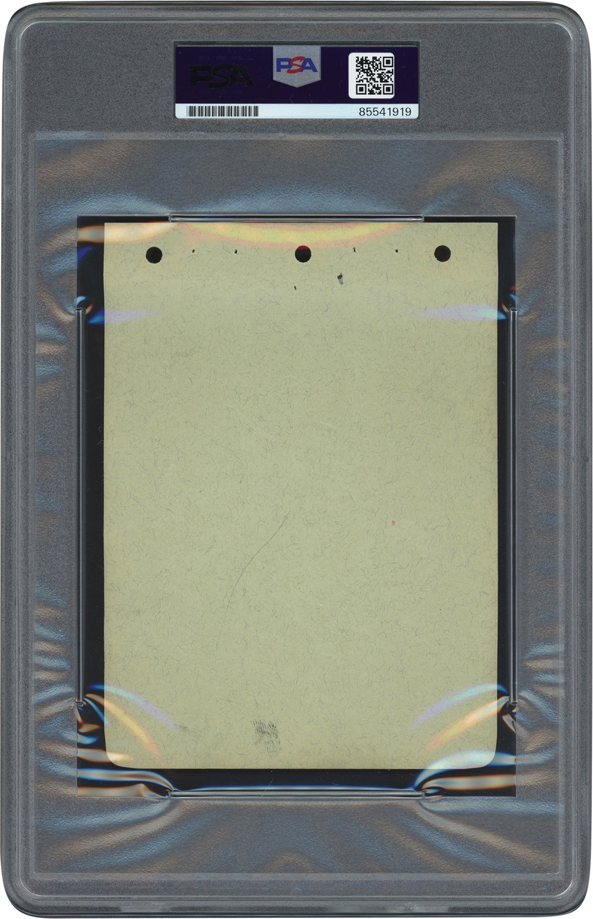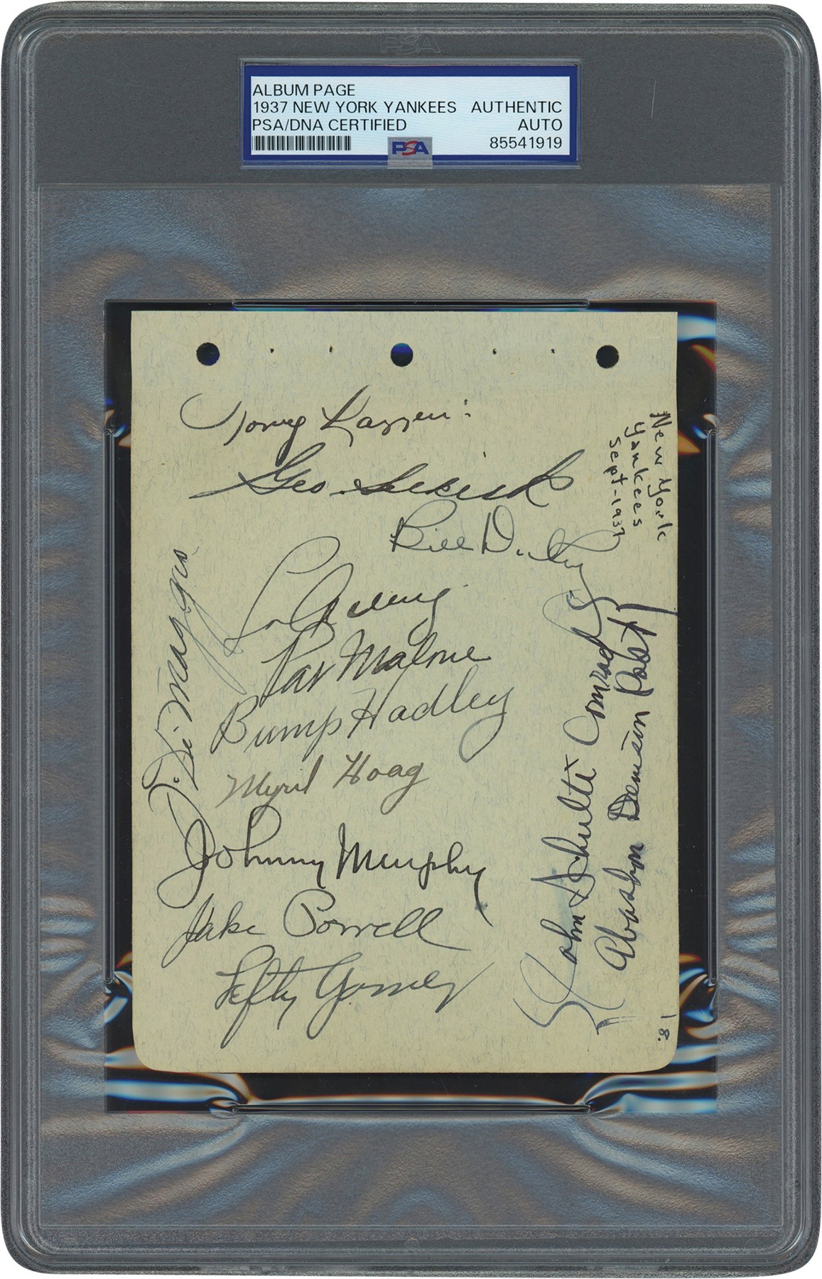 The team-signed album page measures 2.3x6". Written in black fountain ink by an unknown hand on the page, "New York Yankees/Sept - 1937" and on the top right "18." The 12 signatures are all in black or blue fountain ink, and the signatures average about 8/10. The album page exhibits some darkening, particularly above the signatures. The top of the album page has seven (7) punched holes that allow the page to be placed or removed from the album. The album page is in very good condition. The album page has been encapsulated and PSA/DNA CERTIFIED as "AUTHENTIC AUTO." This album page comes from an album of autographs that originated from a Boston Red Sox bat boy. Within this same auction, Lelands has other pages from this same album that feature notable players and teams.