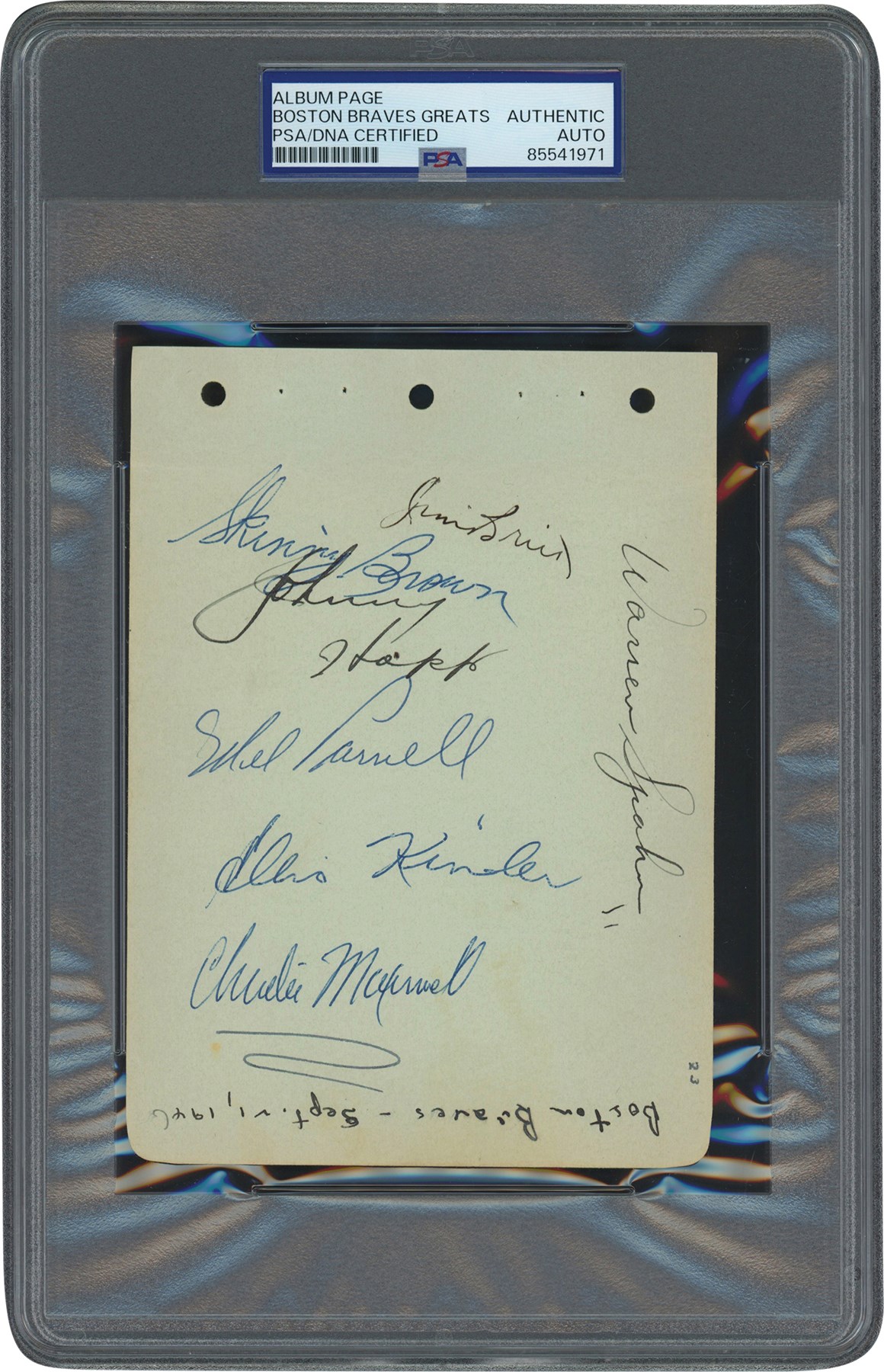 Displayed is a circa late 1940s-early 1950s album page with an early signature of Boston Braves Hall of Fame left-hander Warren Spahn and the autographs of six additional players from Boston's two modern Major League teams, the Braves and the Red Sox. The album page comes from an autograph album that originated from a Boston Red Sox batboy. Spahn pitched 21 Major League seasons: Boston/Milwaukee Braves (1942, 1946-64), New York Mets (1965), San Francisco Giants (1965). He served in combat while in the U.S. Army during World War II, and he was in the Battle of the Bulge and won a Bronze Star and a Purple Heart. While with the Boston Braves, Spahn and right-hander Johnny Sain became famous as the Braves' top starters, and the saying, "Spahn and Sain and pray for rain" became famous during Boston's pennant winning season in 1948. Spahn had a lifetime record of 363-245 with a 3.09 ERA. He was a 17-time All-Star, a Cy Young winner (1957), and a 3-time NL ERA champion. Other signatures on the album page: Mel Parnell, Boston Red Sox; Ellis Kinder, Boston Red Sox; Johnny Hopp, Boston Braves; Hal "Skinny" Brown, Boston Red Sox; Charlie Maxwell, Boston Red Sox.