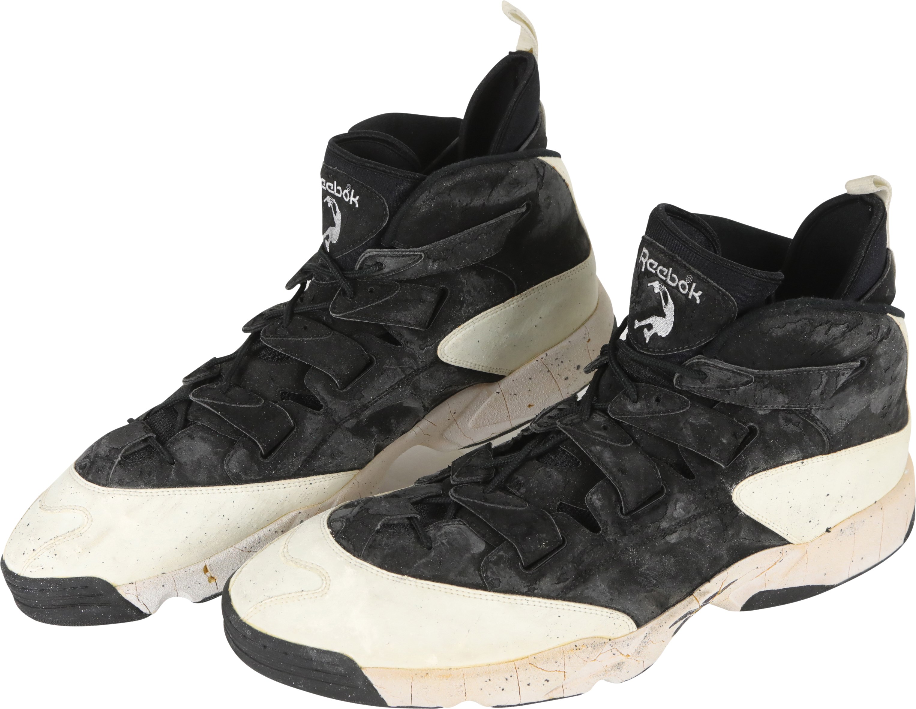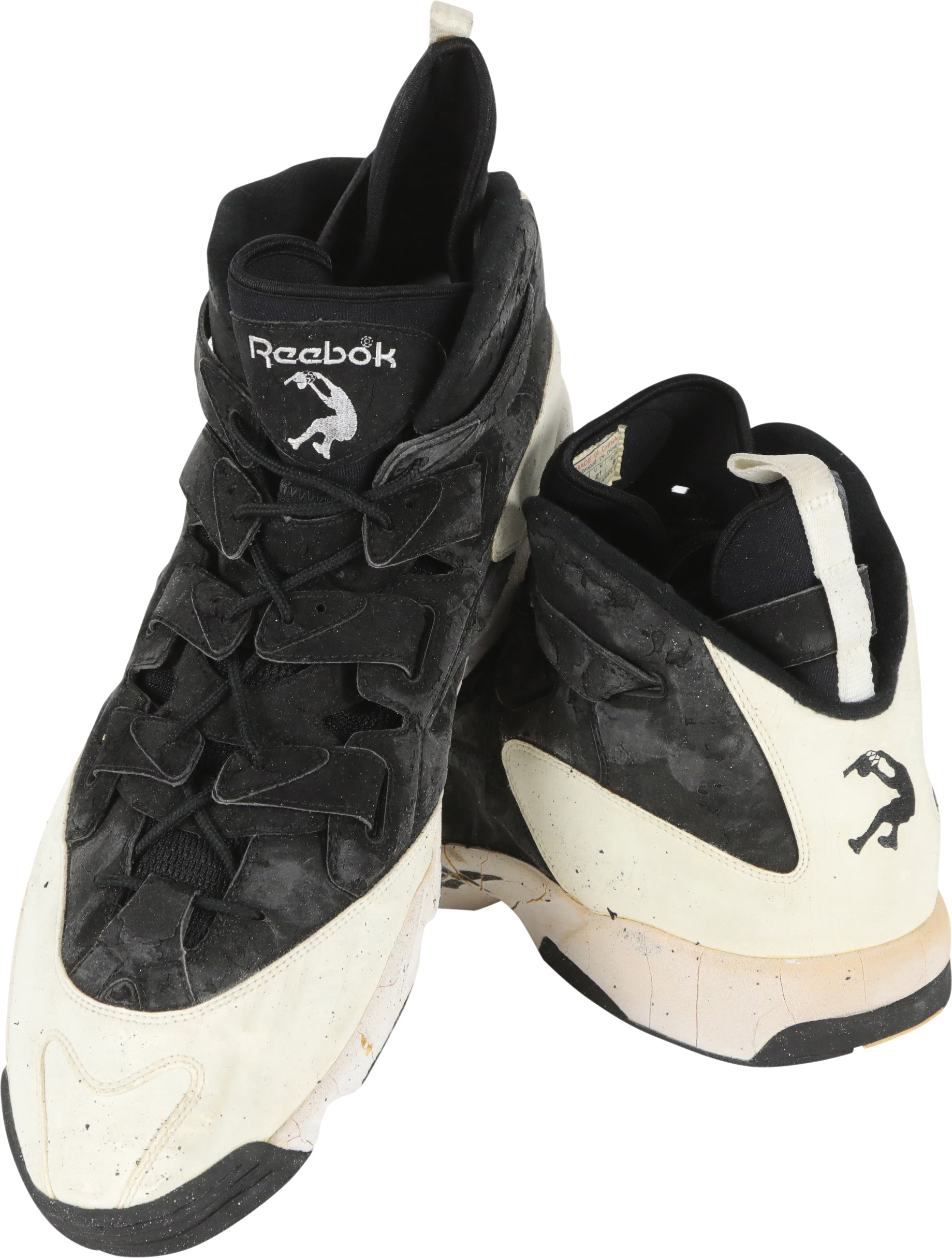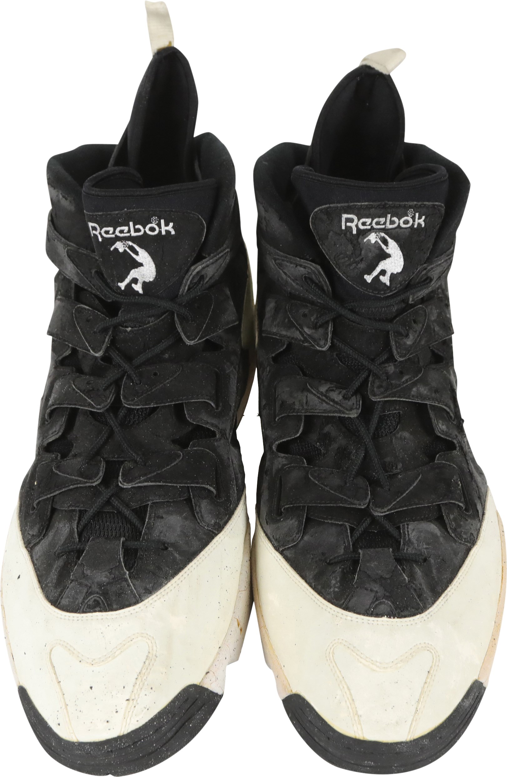 1994-95 Shaquille O'Neal Orlando Magic game worn sneakers. These massive size 22 Reebok sneakers are 16" long and show excellent signs of use as there are cracks in the rubber and scuff marks throughout. A silver silhouette logo of Shaq dunking the basketball is on the tongue of the sneakers, just below the Reebok logo. The same silhouette logo is on the back of each sneaker, in black. O'Neal played for the Magic from 1992 to 1996. He was inducted into the Naismith Memorial Basketball Hall of Fame in 2016.