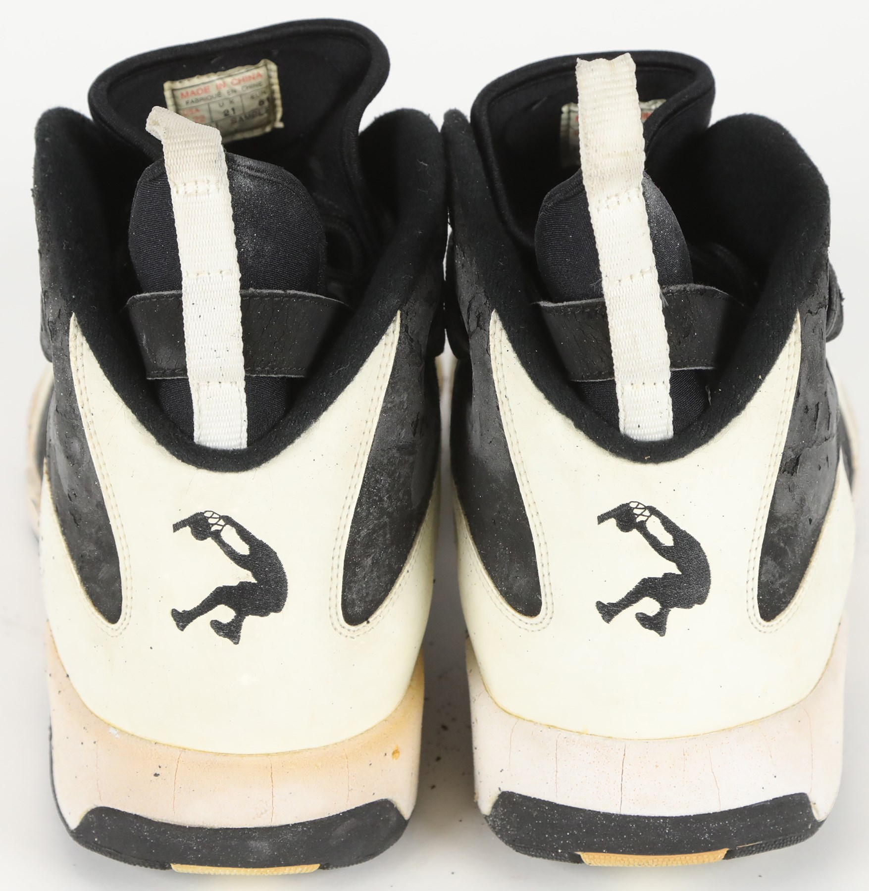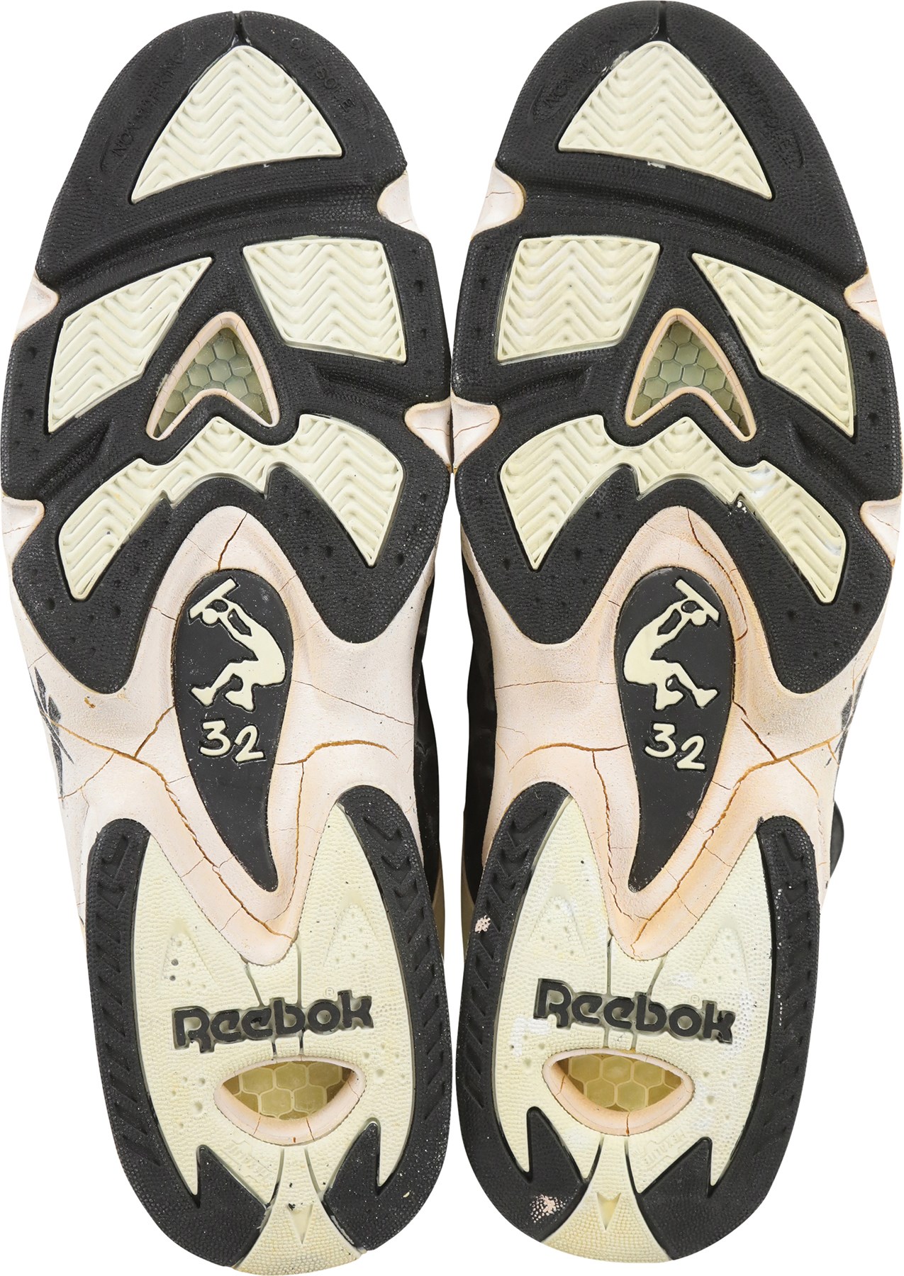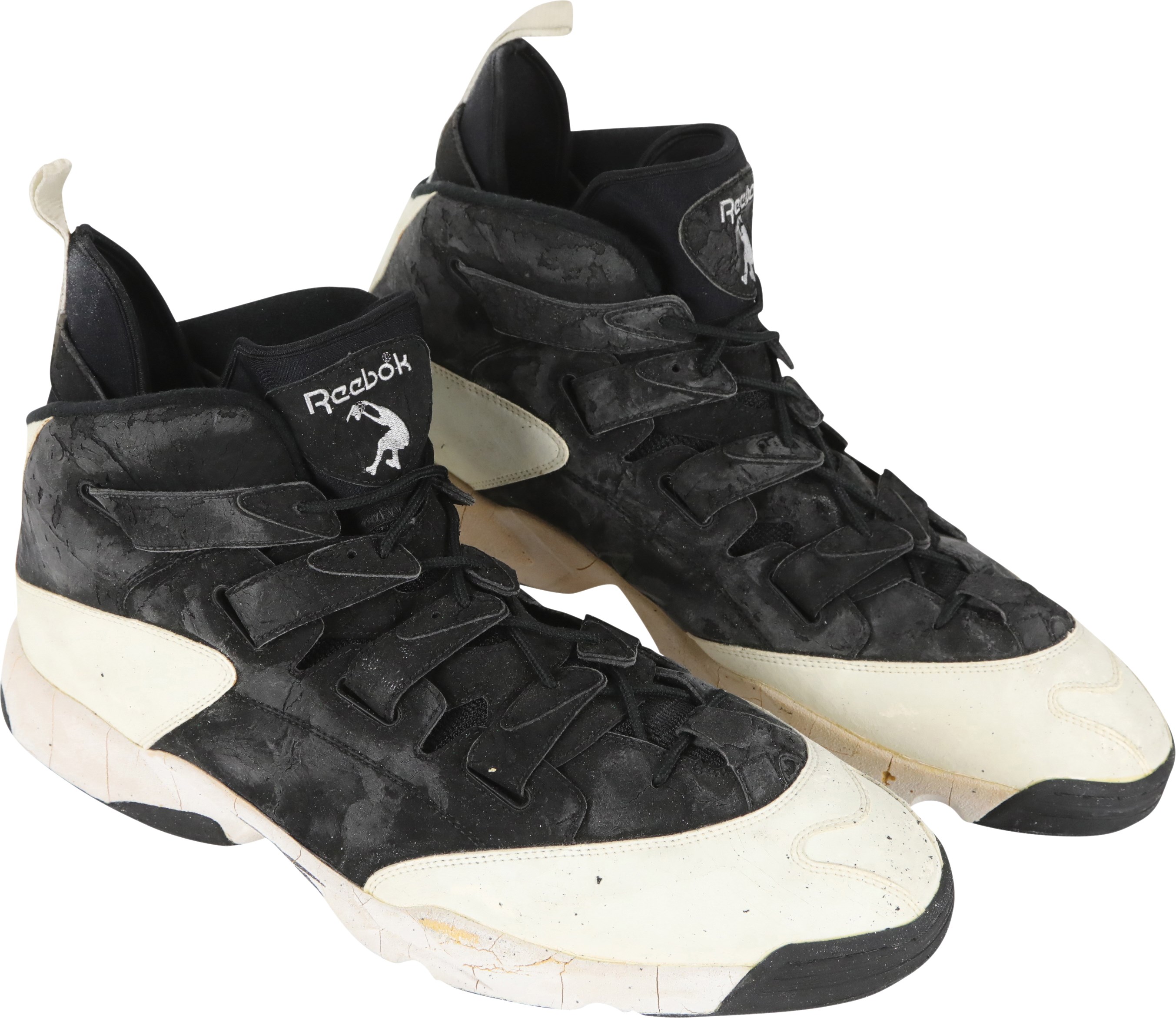 1994-95 Shaquille O'Neal Orlando Magic game worn sneakers. These massive size 22 Reebok sneakers are 16" long and show excellent signs of use as there are cracks in the rubber and scuff marks throughout. A silver silhouette logo of Shaq dunking the basketball is on the tongue of the sneakers, just below the Reebok logo. The same silhouette logo is on the back of each sneaker, in black. O'Neal played for the Magic from 1992 to 1996. He was inducted into the Naismith Memorial Basketball Hall of Fame in 2016.