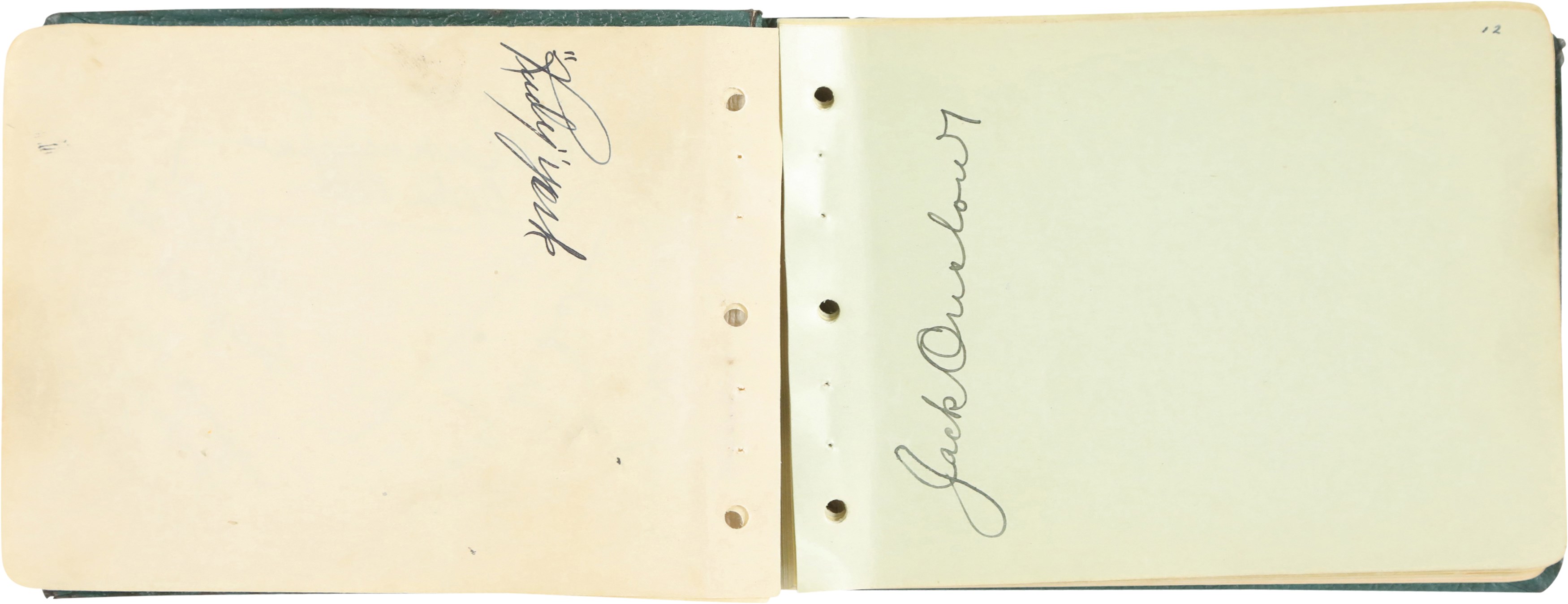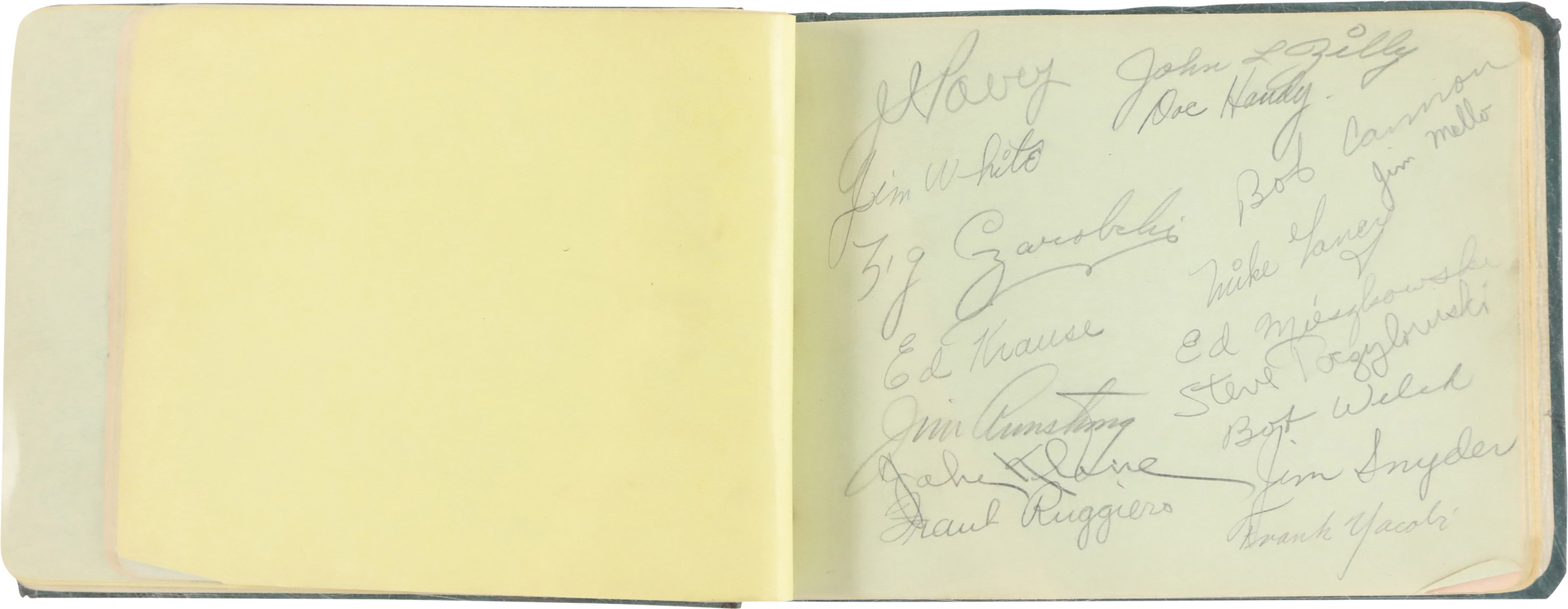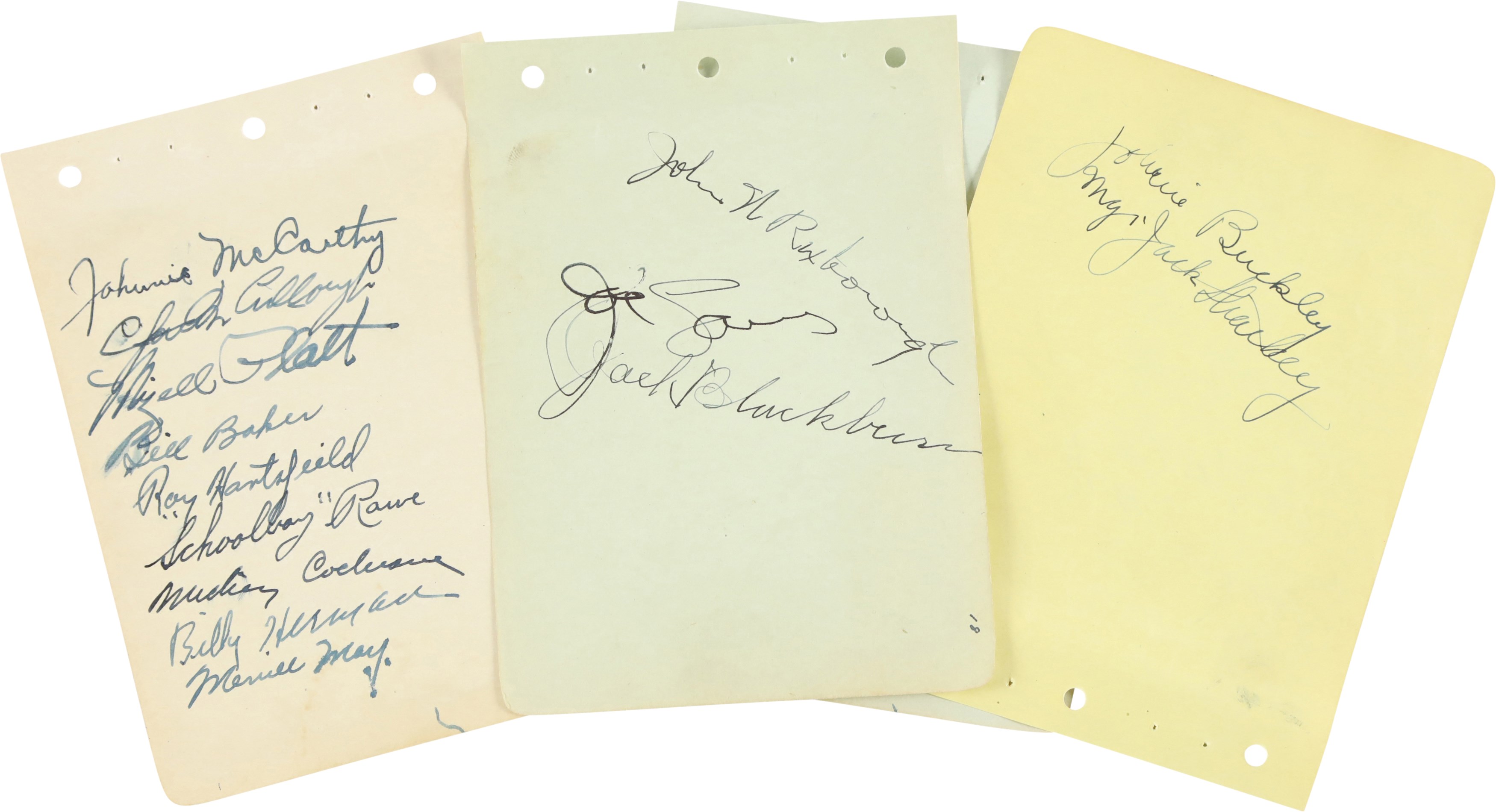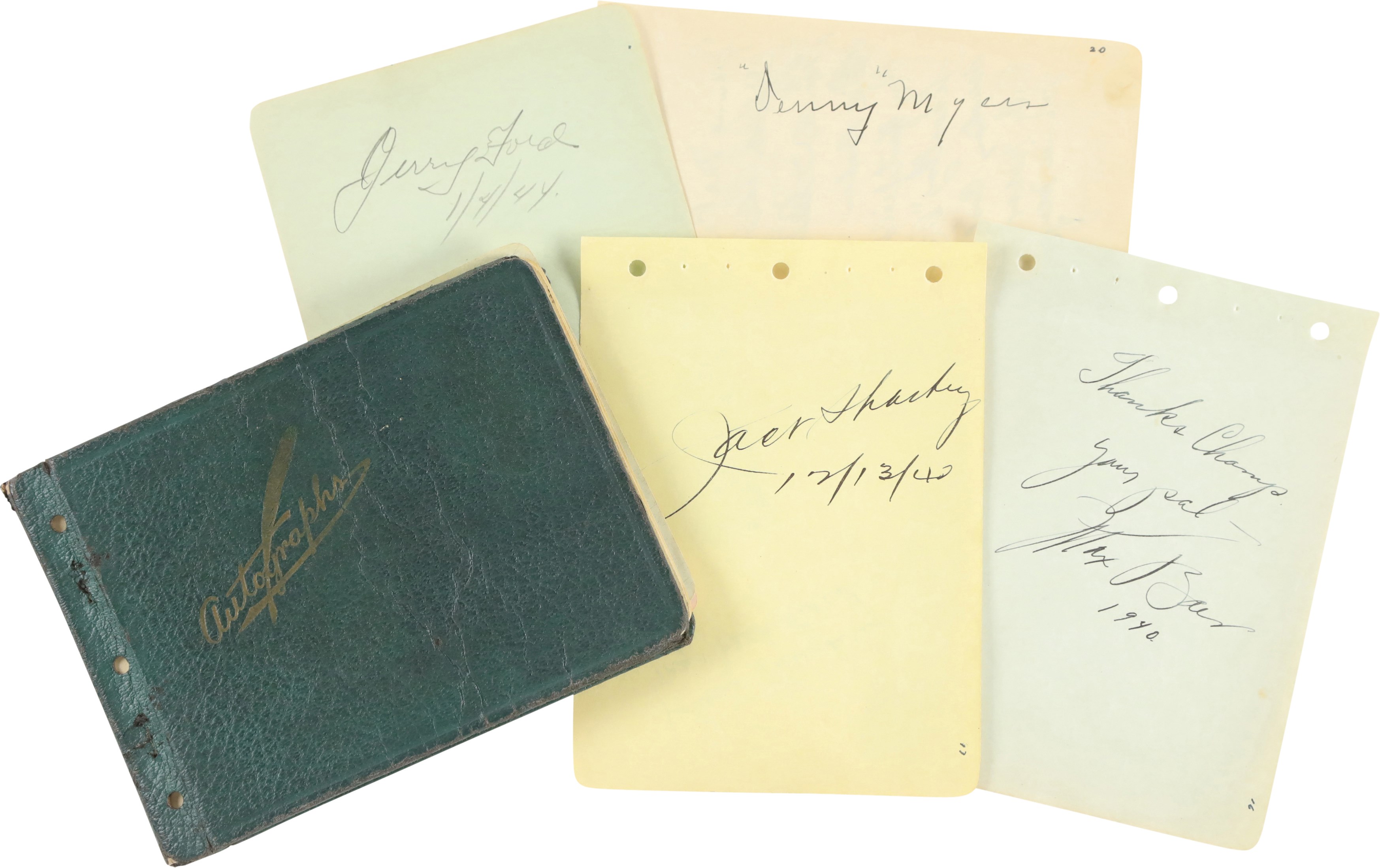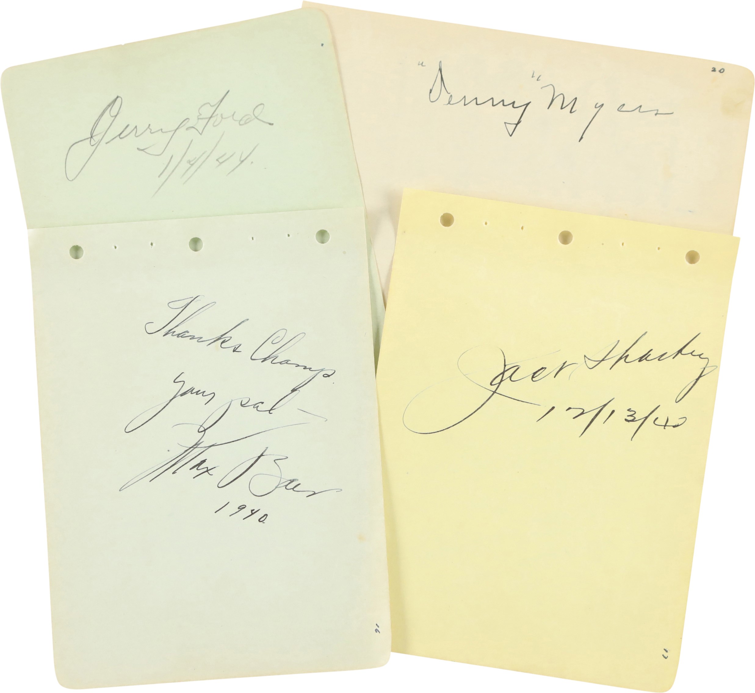 Multi-sport greats signed album pages with boxing legends Joe Louis and Max Baer. Included in the lot is an autograph book of a former Boston Red Sox bat boy. Most notably, the lot includes pages (4.5x6") that have been removed from the book, that are signed by Joe Louis, Max Baer, and Jack Sharkey. Baer wrote, "Thanks Champ, your pal, Max Baer, 1940." Sharkey added "12/13/40" below his signature. Each fighter signed their name on a separate page. Major League Baseball Hall of Famer Mickey Cochrane also signed a page from the album. That page has been signed by 9 MLB players, including Billy Herman, "Schoolboy" Rowe, Roy Hartsfield, Mizell Platt, and others. Aside from the individual pages mentioned, the album itself includes pages that have been signed by the classmates and acquaintances of the bat boy.