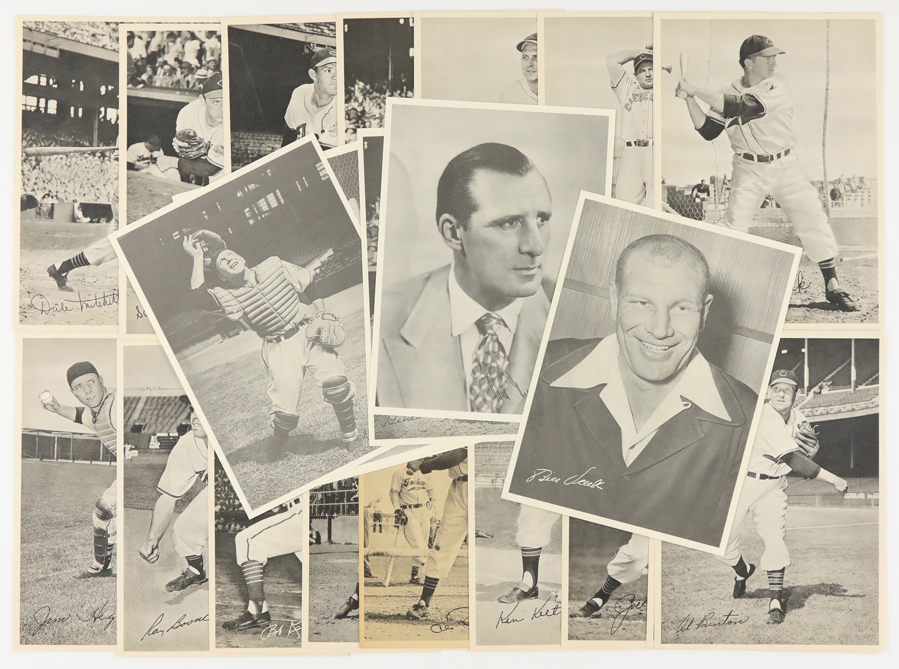 The photos have facsimile autographs. The photos come in a 7x9.5" envelope that reads, "Cleveland Indians OFFICIAL AUTOGRAPHED PICTURES/50 [cents]." The photo envelope has a number of tears and slight paper loss, and "25" is written in pencil by an unknown hand on the front of the envelope. The photos exhibit a slight darkening, but the Al Rosen photo has darkened more than the other pictures. There is no photo of Hall of Famer Leroy "Satchel" Paige, because Paige, the first African American pitcher to appear in a World Series for an American League team, did not join Cleveland until mid-season, after the photos were shot and the picture packs assembled. Except for the aforementioned slight darkening (more darkening for the Rosen photo), the picture pack photos are in EXCELLENT condition.