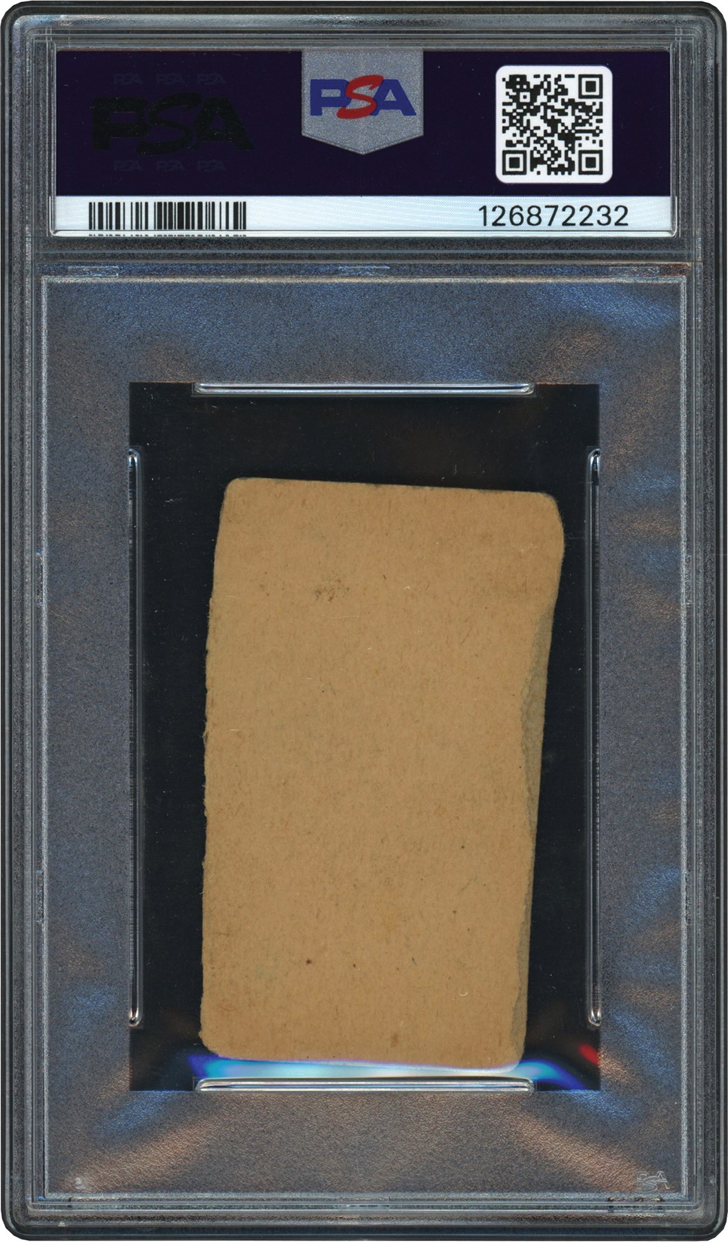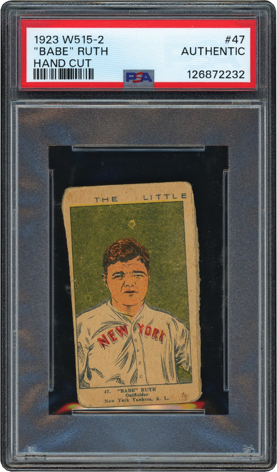1923 W515-2 #47 Babe Ruth card.  The card has been graded and encapsulated by PSA as Authentic-Hand Cut.  I has a crude hand drawn image of Ruth set against a blue background.  The cardstock is tan in color.  The hand cut borders are not straight on both the left and right sides.  All four corners are rounded.  The blank backed reverse appears clean.