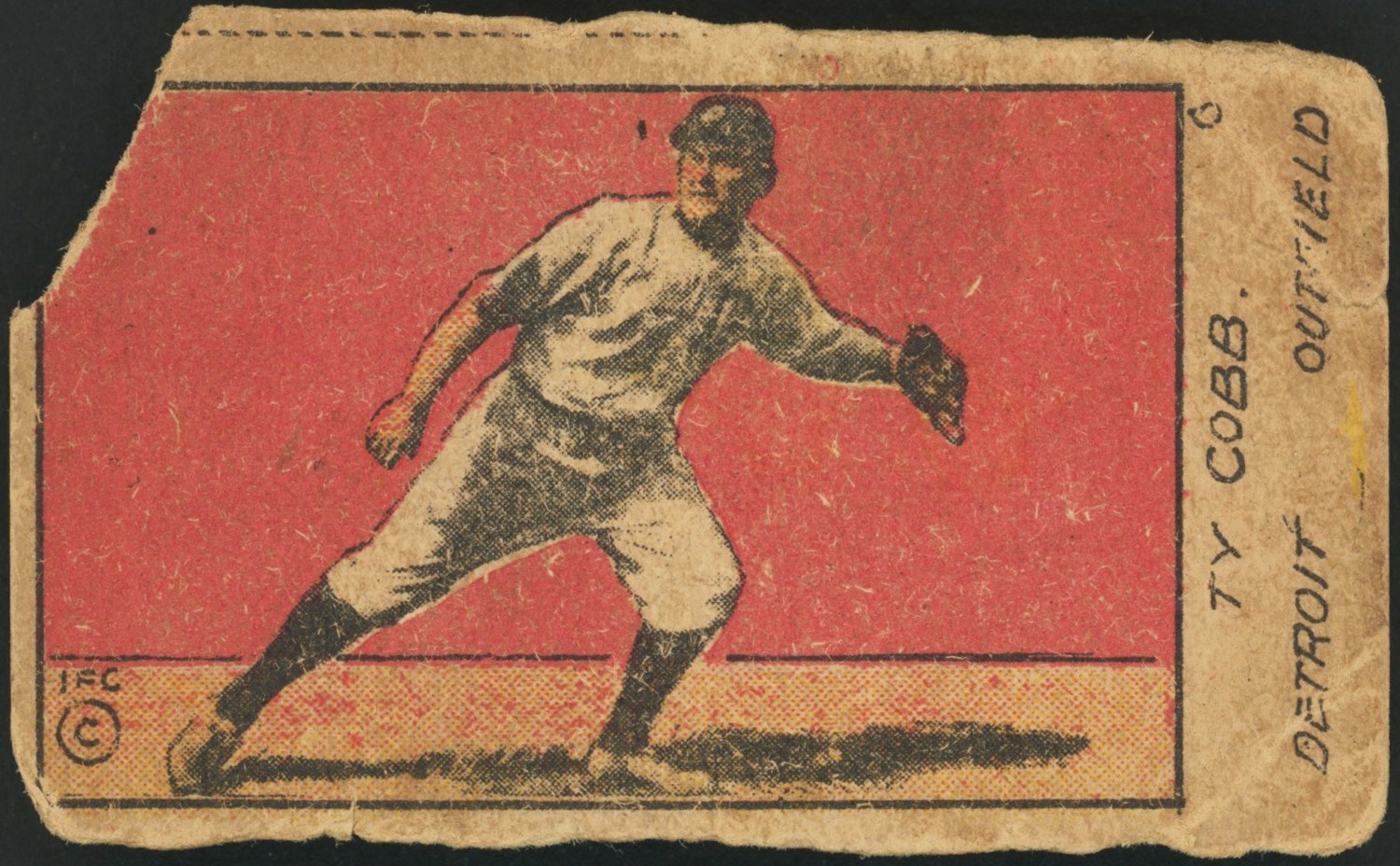 1920 W516-1 #6 Ty Cobb hand cut card.  It has a crudely hand drawn image of Cobb with glove on hand set against a red background.  The cardboard stock is dark tan in color.  The edges are rough and not straight due to the hand cut nature of the card.  There are multiple creases throughout.  It is missing the top left corner of the card when held horizontally.  The blank backed reverse is clean but creased.