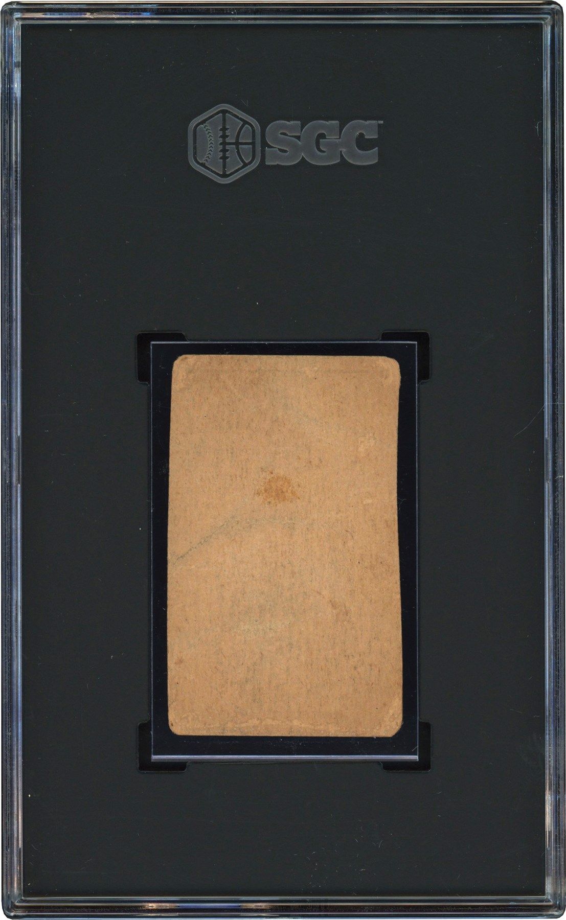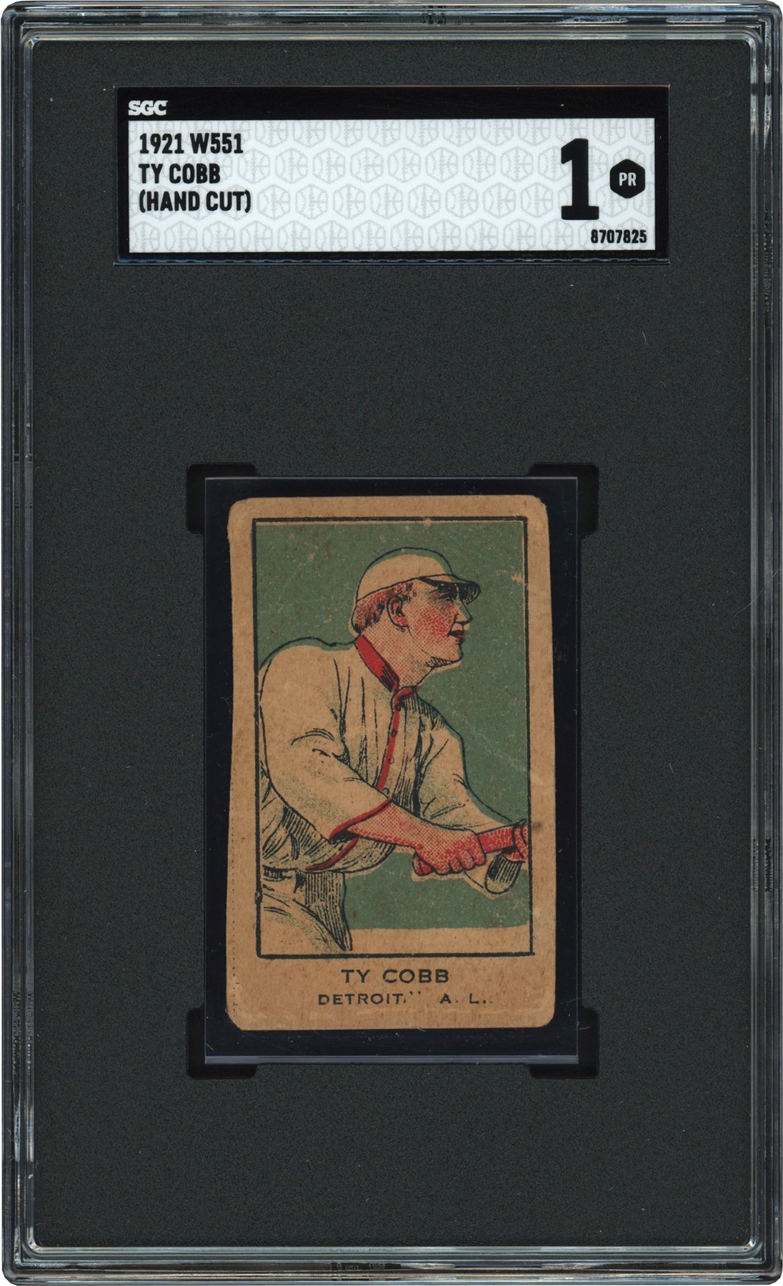 1921 W551 Ty Cobb card. The card has been graded and encapsulated by SGC PR 1-Hand Cut. It has a crude hand drawn image of Cobb with bat in hand set against a light blue background. The cardstock is tan in color. The hand cut borders are not straight. There are multiple creases throughout. All four corners are rounded. The reverse is clean but creased.