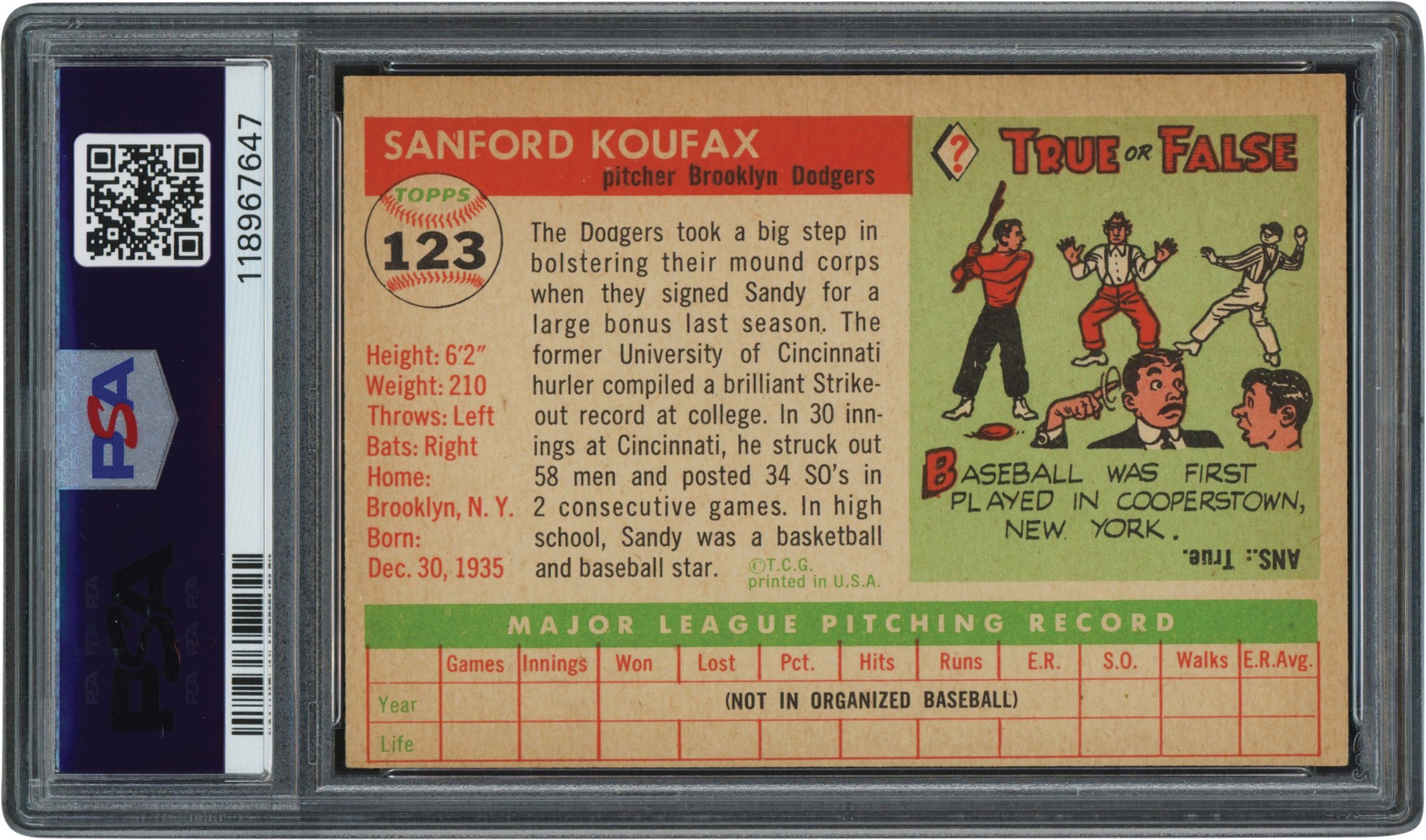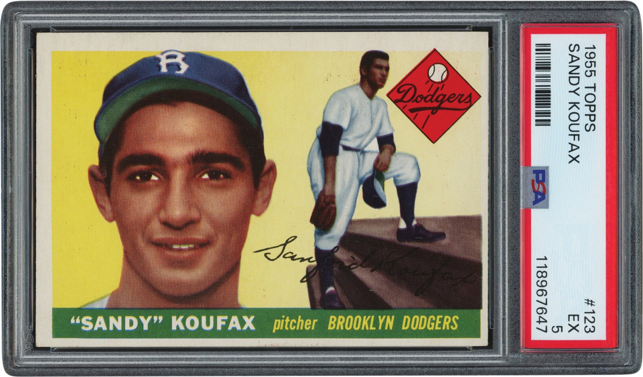 1955 Topps Baseball 123 Sandy Koufax (R) card. The card has been graded and encapsulated by PSA EX 5. It has a colorful dual image of Koufax set against a pale yellow background. The borders remain white while the edges appear crisp. Both right corners have light wear while the left corners are sharp. Centering is off left to right and top to bottom. The reverse is clean but toned.