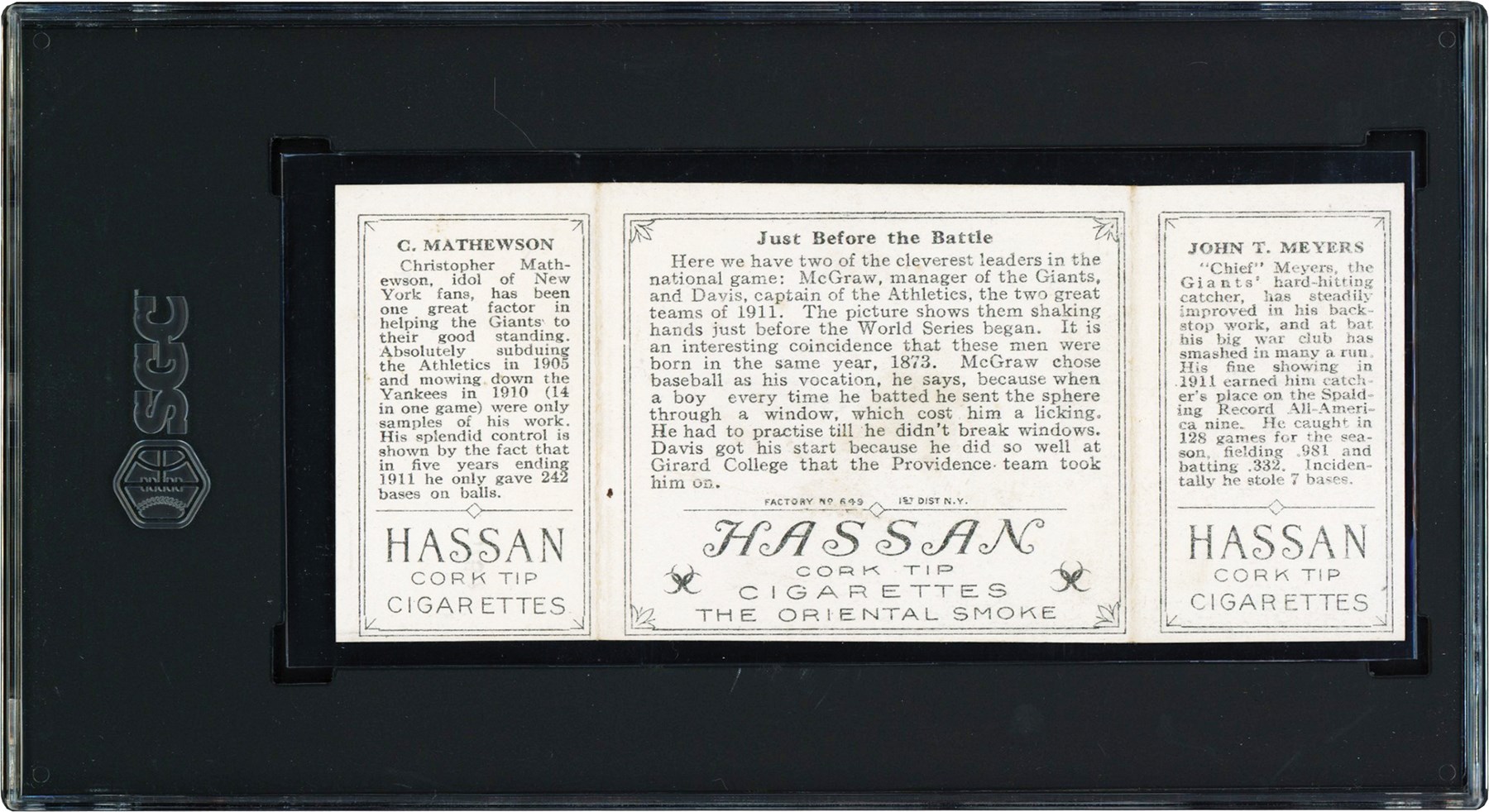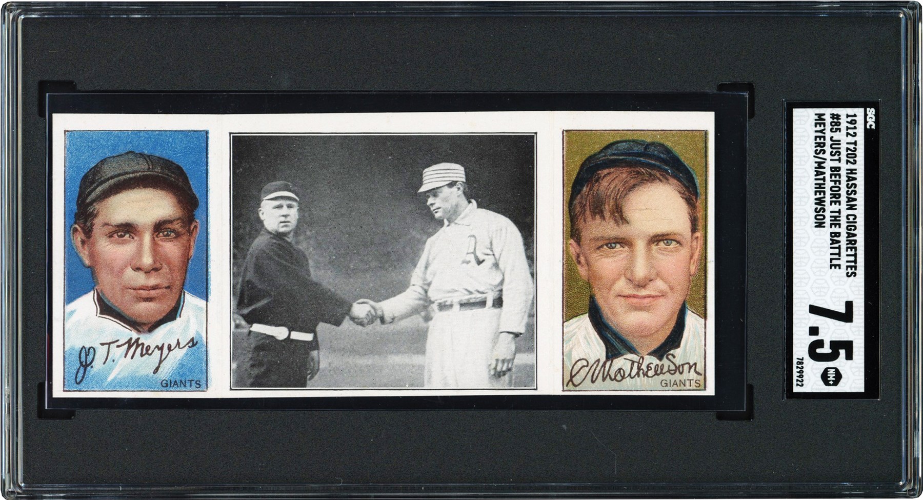 Lot # 14: 1912 T202 Hassan Triple Folder Christy Mathewson & Chief Meyers ("Just Before the Battle") SGC NM+ 7.5