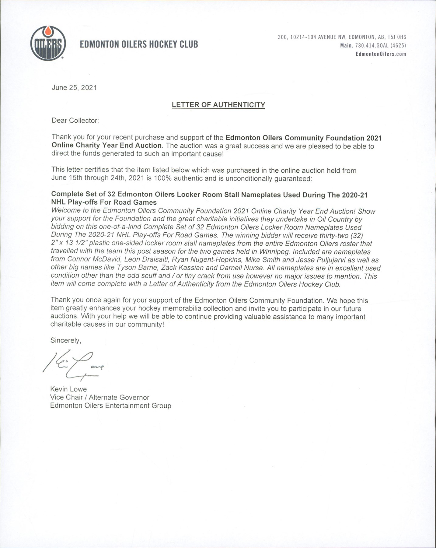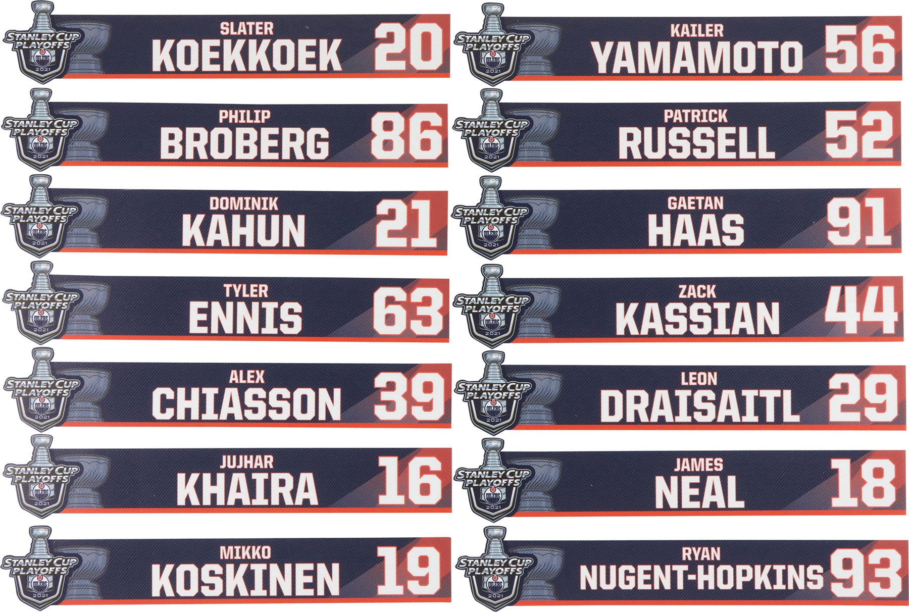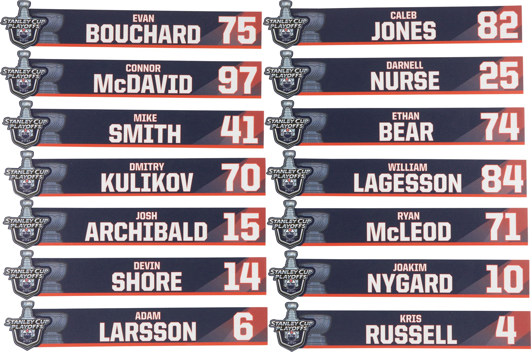 Presented is a set of 28 Edmonton Oilers Stanley Cup Playoffs locker room nameplates. Each nameplate measures 13.5x2" and includes the 2021 Stanley Cup Playoffs logo, along with player name and number. These were placed above each player's locker during the Oilers' playoff run. There are nameplates in this collection from Connor McDavid, Tyler Ennis, Darnell Nurse, Caleb Jones, Devin Shore, Josh Archibald, and others. The nameplates are in near-mint condition and come with an LOA from the Edmonton Oilers.