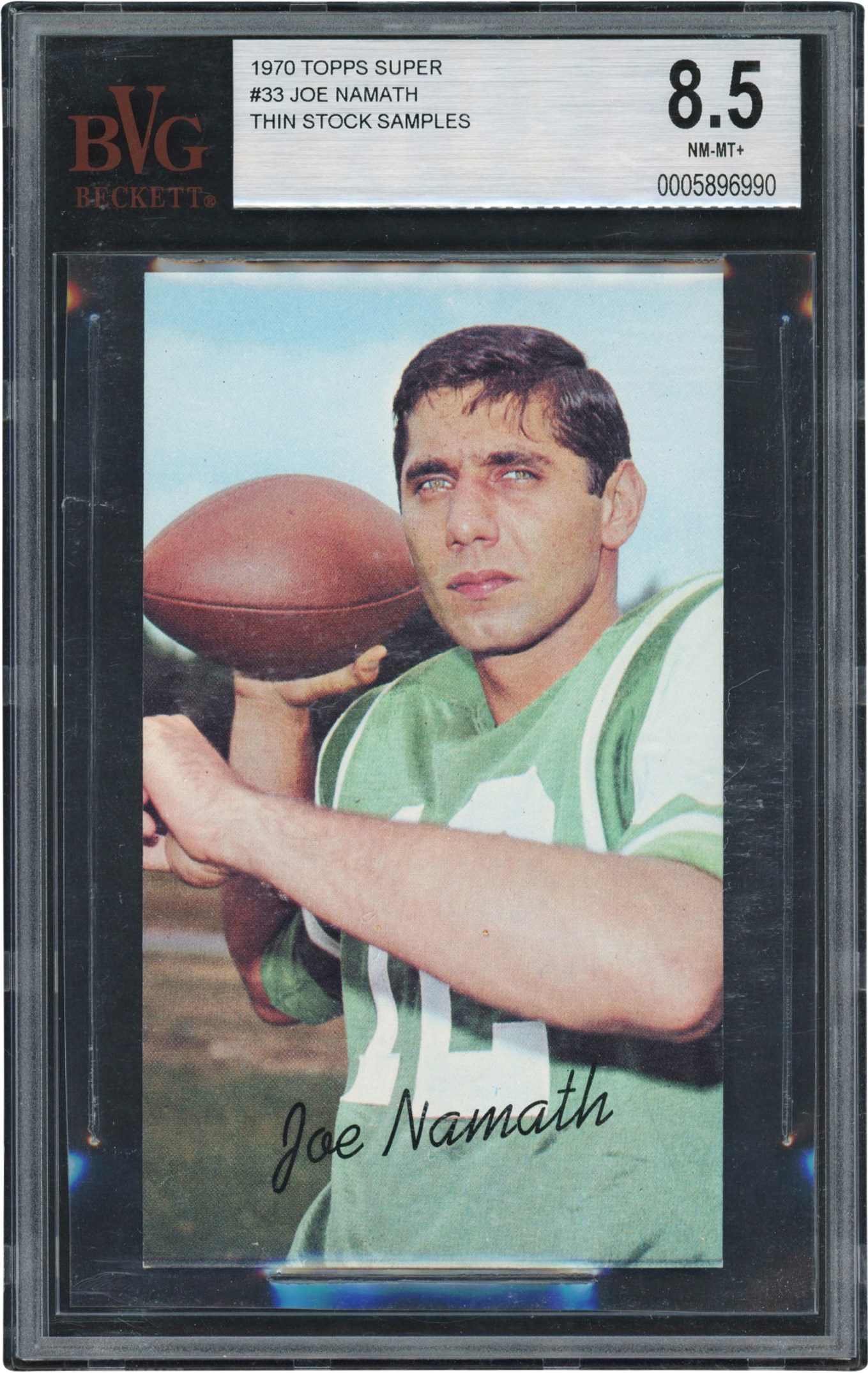 1970 Topps Super Football 33 Joe Namath Thin Stock Samples card. The card has been graded and encapsulated by BVG NM-MT+ 8.5. It has a colorful image of Namath with football in hand ready to throw with a facsimile autograph in black near the bottom of the image. The edges are crisp while centering is excellent. The bottom left corner has a very light touch while the remaining corners are sharp. The blank back is clean.
