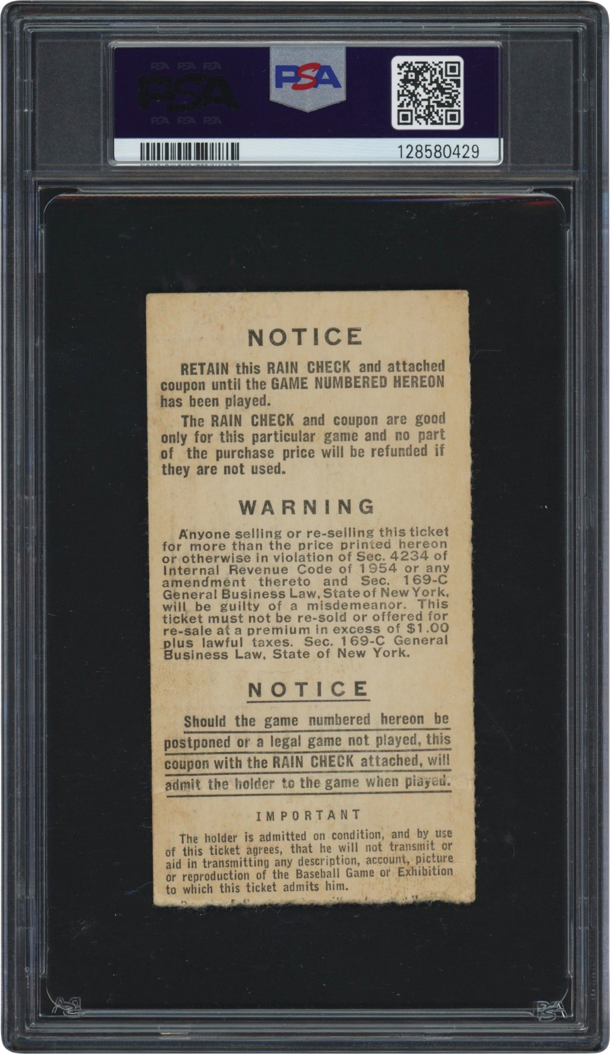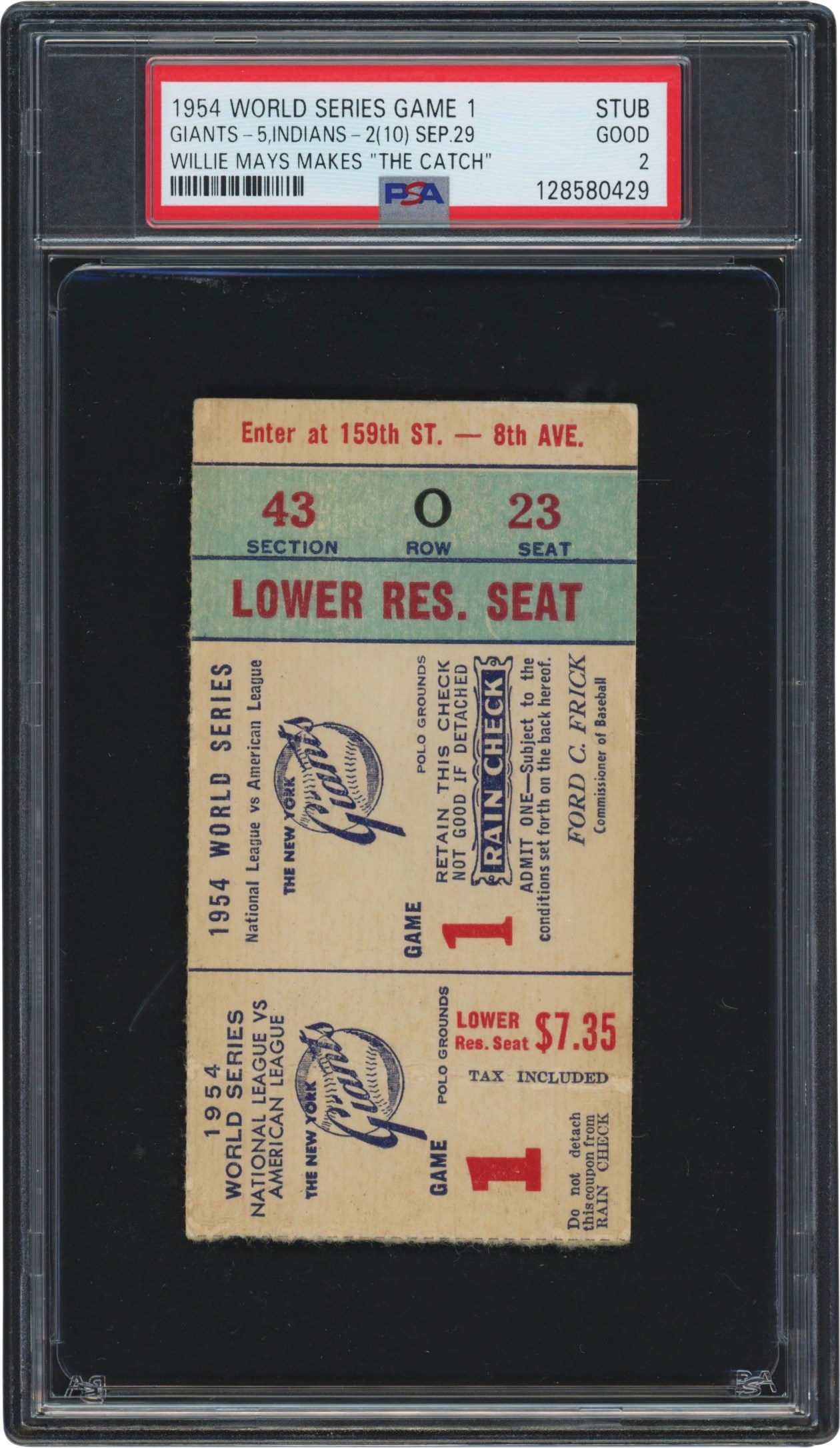 A ticket stub from the Willie Mays "The Catch" game. In Game 1 of the 1954 World Series, Willie Mays ran towards the center field wall to chase down a long fly ball hit by Vic Wirtz, and what happened next would live on forever in baseball lore. Mays caught up with the ball and made a spectacular over-the-shoulder, basket-style catch. There is probably no other catch in baseball history more famous than this play. The 4.25x2.25" ticket from the legendary game is encapsulated and graded (GOOD 2) by PSA.