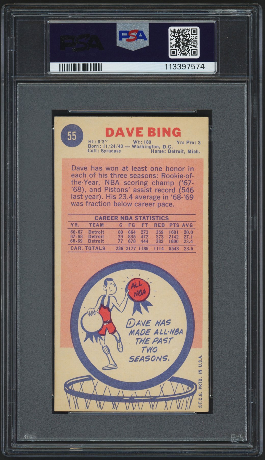 1969 Topps Basketball 55 Dave Bing autographed (R) card. The card and autograph have been graded and encapsulated by PSA EX 5 with an Auto grade of 10. The autograph was done in blue Sharpie above the image of Bing. Inscriptions include: HOF 1990; ROY 1967; All Star MVP 76; Scoring Champ 1968. The card itself is nicely centered with smooth edges. All four corners exhibit light touches. The reverse is clean but lightly toned.