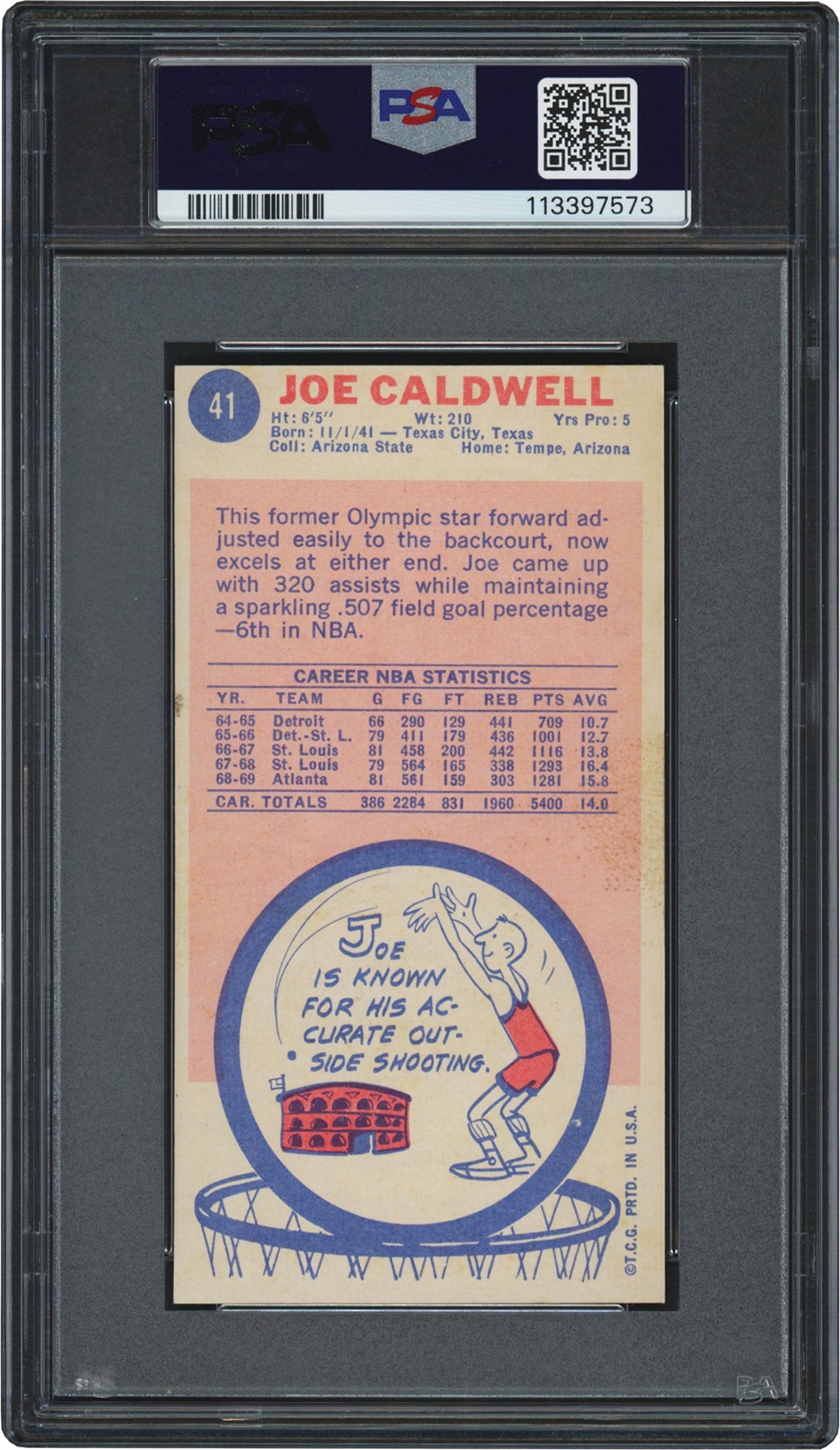 1969 Topps Basketball 41 Joe Caldwell autographed card. The card and autograph have been graded and encapsulated by PSA EX 5 with an Auto grade of 7. The autograph was done in gold Sharpie across Caldwell's knees. Inscriptions include 2X NBA All Star; 2X ABA All Star; 1964 Olympic Gold; and an NBA inscription that cannot be read. All inscriptions are blurry. The card itself is slightly off center left to right and top to bottom. All four corners have light touches. The reverse is clean.