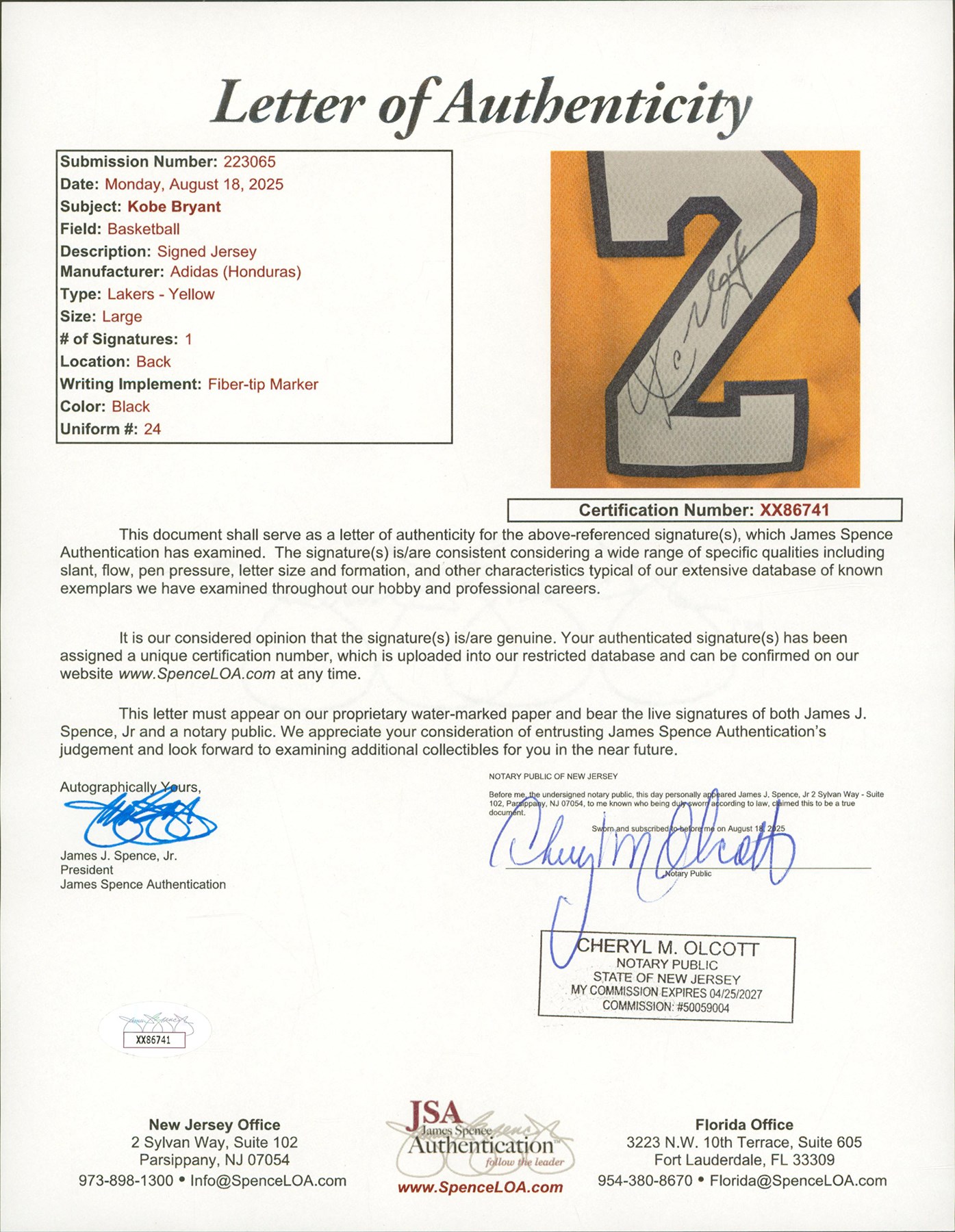 Lot # 746: Kobe Bryant Signed Los Angeles Lakers Jersey (JSA)