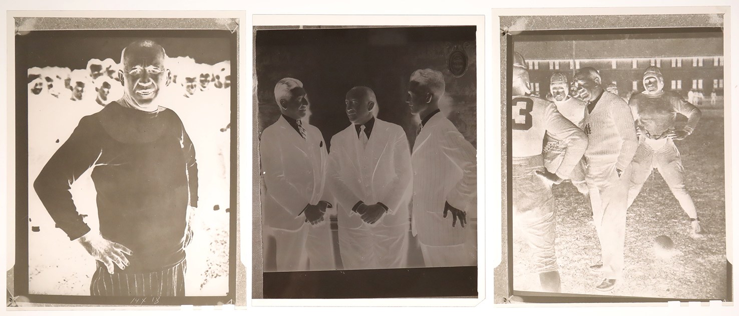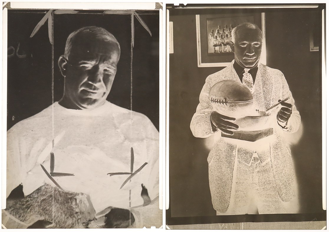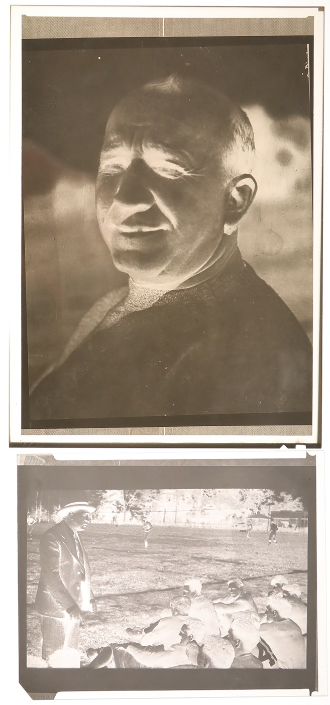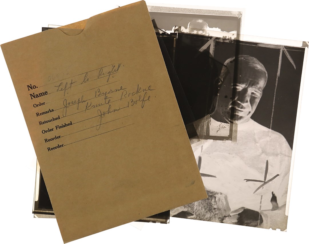 Presented is an intriguing Knute Rockne photo negative collection, whose eight (8) different negatives generally show the famed Notre Dame football coach addressing his team or in relaxed social settings. Rockne, born Knut Larsen Rokne in Norway, emigrated to the United States with his parents when he was five years old. He played football on neighborhood teams and in high school, but he had to work in the local post office for four years to save enough money to attend Notre Dame. At Notre Dame, he majored in chemistry and became an All-American end. While at Notre Dame he worked in the summer with quarterback Gus Dorais to perfect a passing attack at a time when the forward pass was used infrequently by most schools. Thus, Rockne's team became the first major college football team to make the forward pass a regular part of the offense. Notre Dame used its new passing attack to defeat heavily favored Army at West Point on Nov. 1, 1931. That game inspired a growing national use of the forward pass. Rockne coached the famous George Gipp at Notre Dame, and long after Gipp's death, Rockne inspired his Fighting Irish to "win just one for the Gipper." Rockne also developed the famous Four Horsemen backfield and won three national championships. The famed coach died in a plane crash in 1931. The College Football Hall of Famer is still the consensus choice as the most famous college football coach in history. Four of the negatives measure 3.75x4.8". Three of them show Rockne with his Notre Dame team, seemingly at practice. The fourth negative shows Rockne with two other men, as Joseph Bryant is to Rockne's right and John Bolfe is to Rockne's left. The other four negatives, measuring 4.9x6.9" each, (basically5x7") consist of closer views of Rockne than are depicted in the first four negatives, a shot of Rockne at what appears to be a social function, and another shot of Rockne at practice with his Notre Dame team. The negatives are in a 5.5x7.5" brown envelope. Written on the envelope, in pencil by an unknown hand, is "Left to Right/Joseph Bryne, Knute Rockne, John Bolfe." The negatives all come from the famed Brown Brothers Photographers. The negatives are in excellent condition.