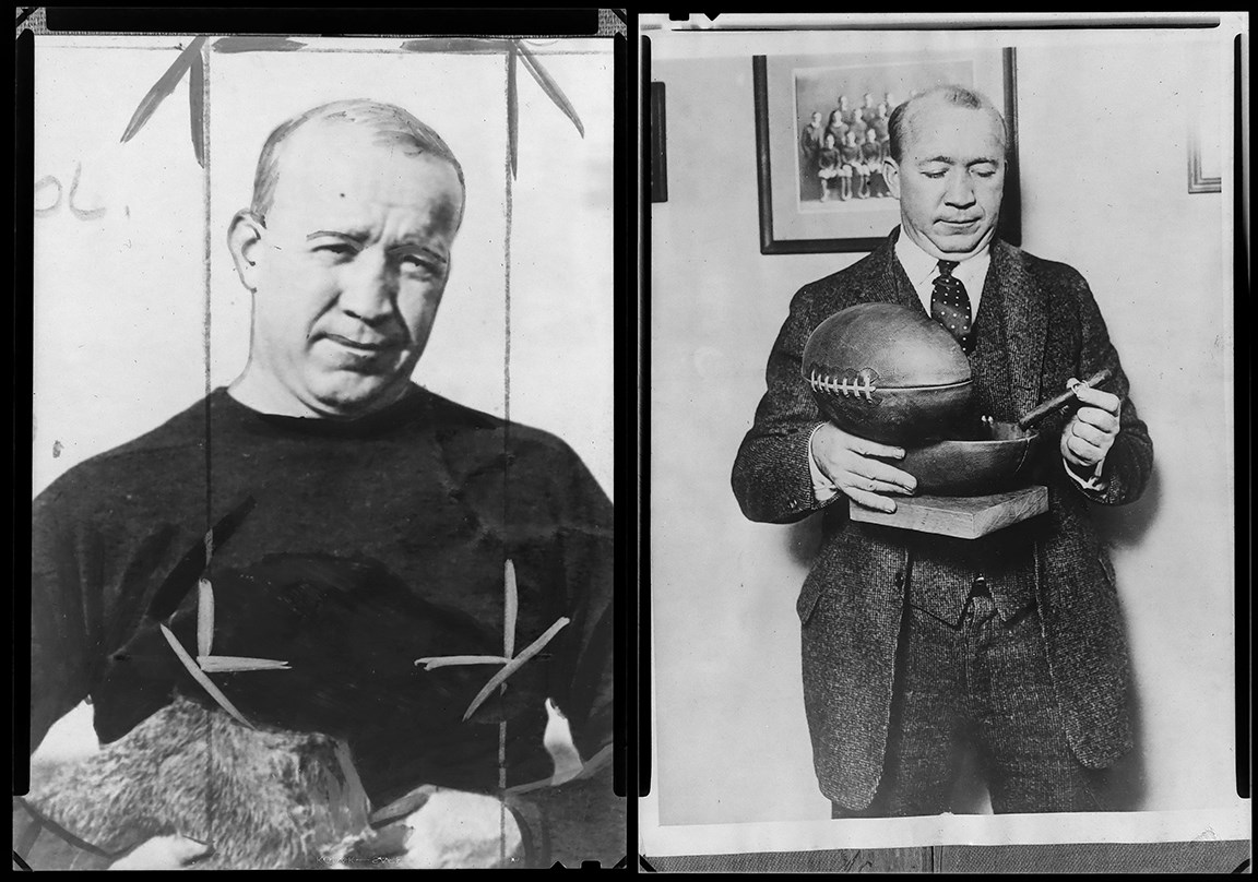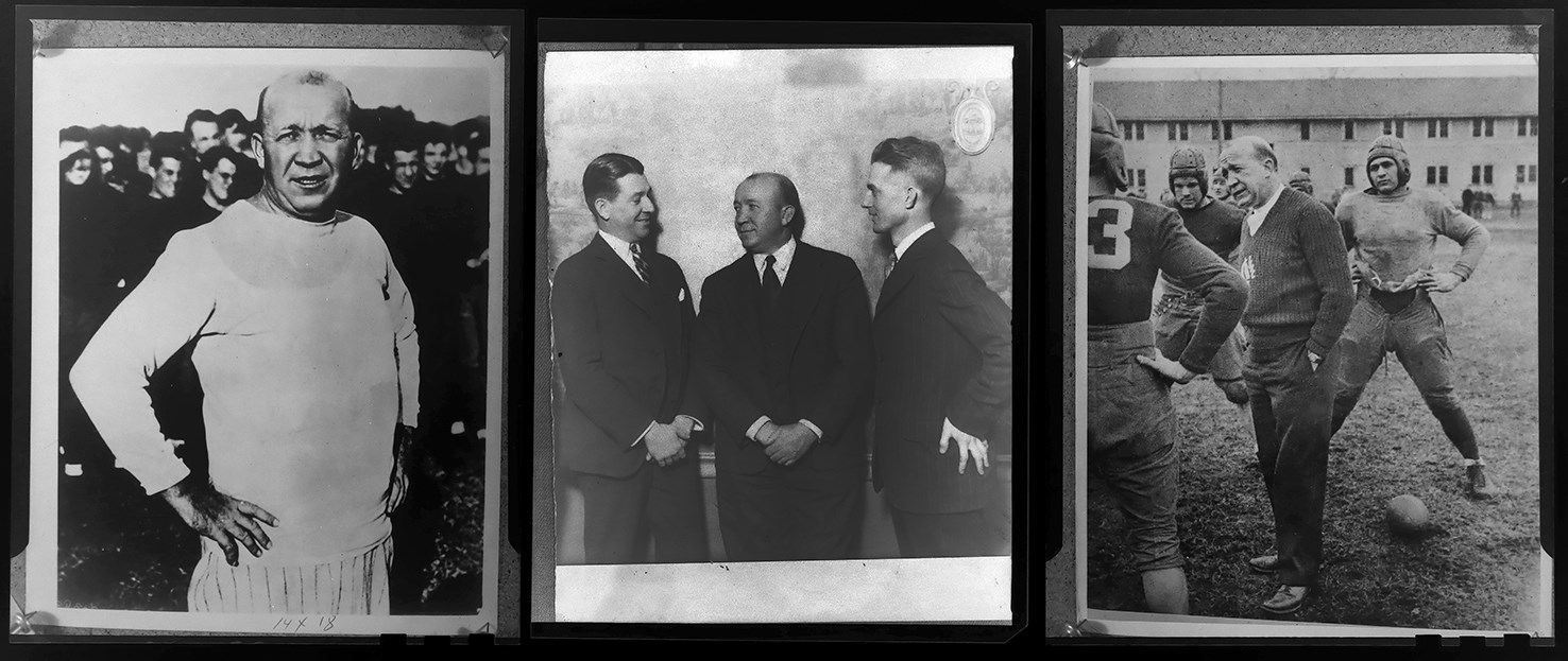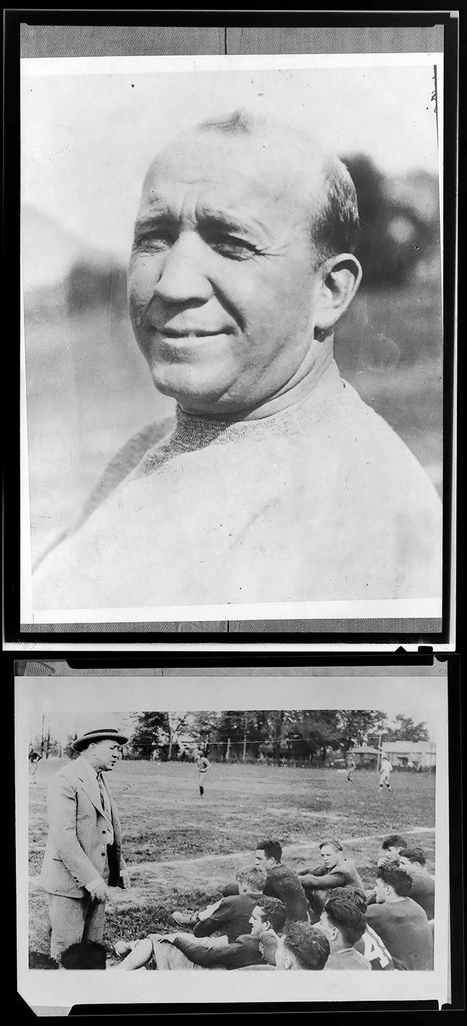 Presented is an intriguing Knute Rockne photo negative collection, whose eight (8) different negatives generally show the famed Notre Dame football coach addressing his team or in relaxed social settings. Rockne, born Knut Larsen Rokne in Norway, emigrated to the United States with his parents when he was five years old. He played football on neighborhood teams and in high school, but he had to work in the local post office for four years to save enough money to attend Notre Dame. At Notre Dame, he majored in chemistry and became an All-American end. While at Notre Dame he worked in the summer with quarterback Gus Dorais to perfect a passing attack at a time when the forward pass was used infrequently by most schools. Thus, Rockne's team became the first major college football team to make the forward pass a regular part of the offense. Notre Dame used its new passing attack to defeat heavily favored Army at West Point on Nov. 1, 1931. That game inspired a growing national use of the forward pass. Rockne coached the famous George Gipp at Notre Dame, and long after Gipp's death, Rockne inspired his Fighting Irish to "win just one for the Gipper." Rockne also developed the famous Four Horsemen backfield and won three national championships. The famed coach died in a plane crash in 1931. The College Football Hall of Famer is still the consensus choice as the most famous college football coach in history. Four of the negatives measure 3.75x4.8". Three of them show Rockne with his Notre Dame team, seemingly at practice. The fourth negative shows Rockne with two other men, as Joseph Bryant is to Rockne's right and John Bolfe is to Rockne's left. The other four negatives, measuring 4.9x6.9" each, (basically5x7") consist of closer views of Rockne than are depicted in the first four negatives, a shot of Rockne at what appears to be a social function, and another shot of Rockne at practice with his Notre Dame team. The negatives are in a 5.5x7.5" brown envelope. Written on the envelope, in pencil by an unknown hand, is "Left to Right/Joseph Bryne, Knute Rockne, John Bolfe." The negatives all come from the famed Brown Brothers Photographers. The negatives are in excellent condition.