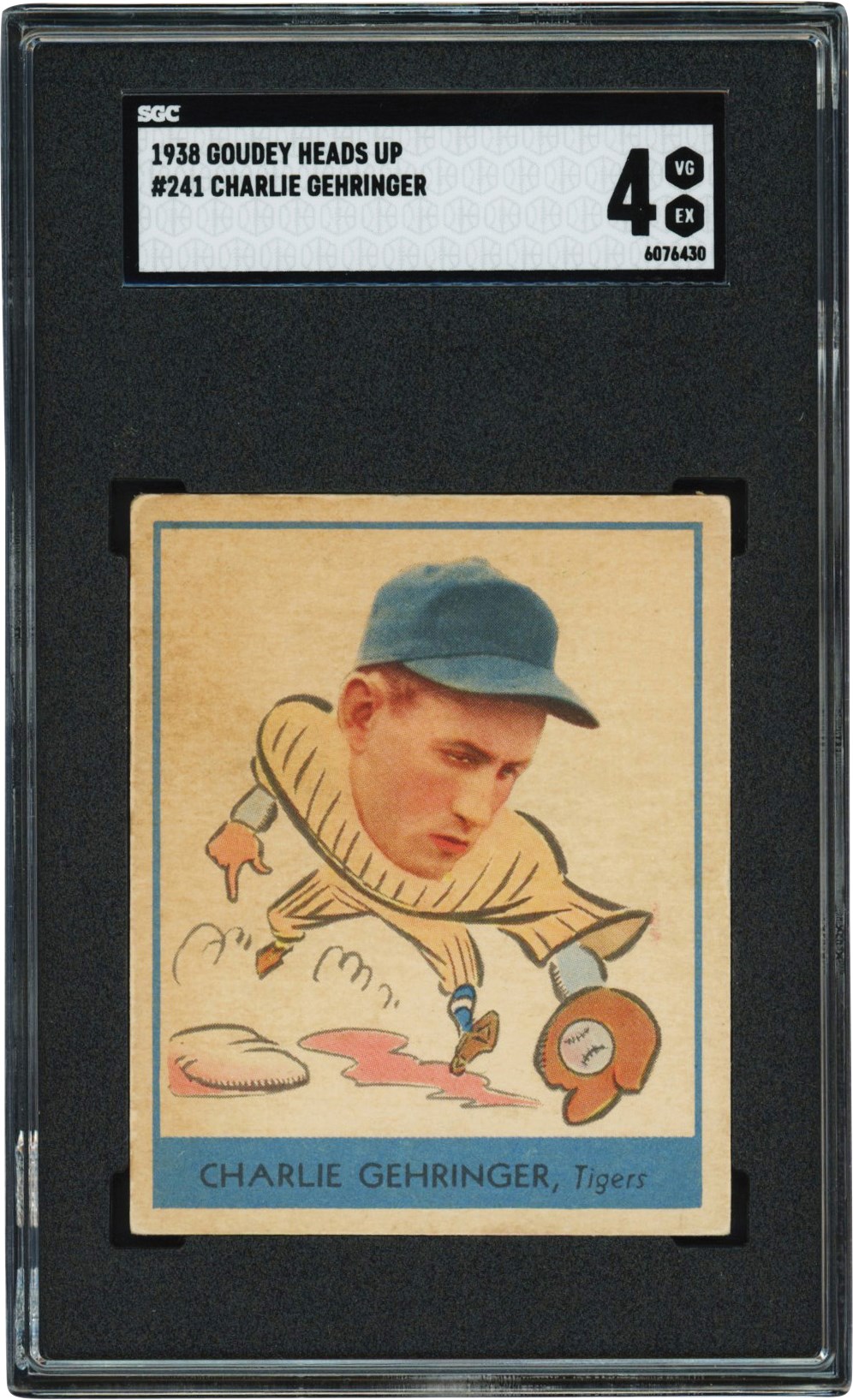 1938 Goudey Heads Up 241 Charlie Gehringer card. The card has been graded and encapsulated by SGC VG-EX 4. It has a colorful caricature of Gehringer in fielding pose set against an off white background. The edges appear fairly smooth. Centering is slightly off left to right. All four corners exhibit light to moderate rounding. The reverse is clean but lightly toned.